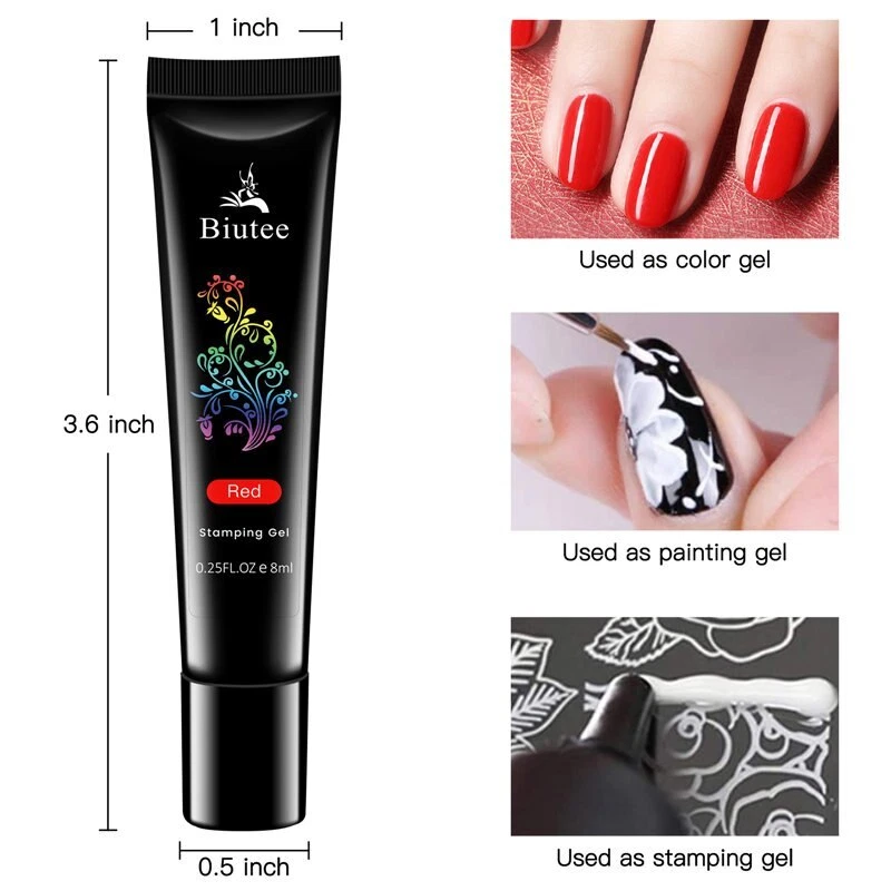 Specification: Brand: Biutee Quantity: 1 Set(12 Colors) Capacity: Approx. 8ml/1pc Package Contents: 12pcs 8ml Biutee Stamping Gel Feature: Special nail gel for nail art stamping and printing colors. Superior Quality and brand new merchandise. Has no requirement for operation speed, more suitable for beginner. Need to cure by UV lamp. How to use: Step 1. Apply base color on the nail with base coat and cure. Step 2. Apply Nail Latex. Step 3. Apply Stamping gel on the stamping plates. Step 4. Use a transparent scratch gel. Step 5. Press the stamper and pick up the pattern. Step 6. Transfer on nails and cure under UV lamp for 2 minutes or under LED lamp for 30-60 seconds. Step 7. Peel of the nail latex. Step 8. Apply top coat and cure under UV lamp for 2 minutes or under LED lamp for 30-60 seconds. Finished.