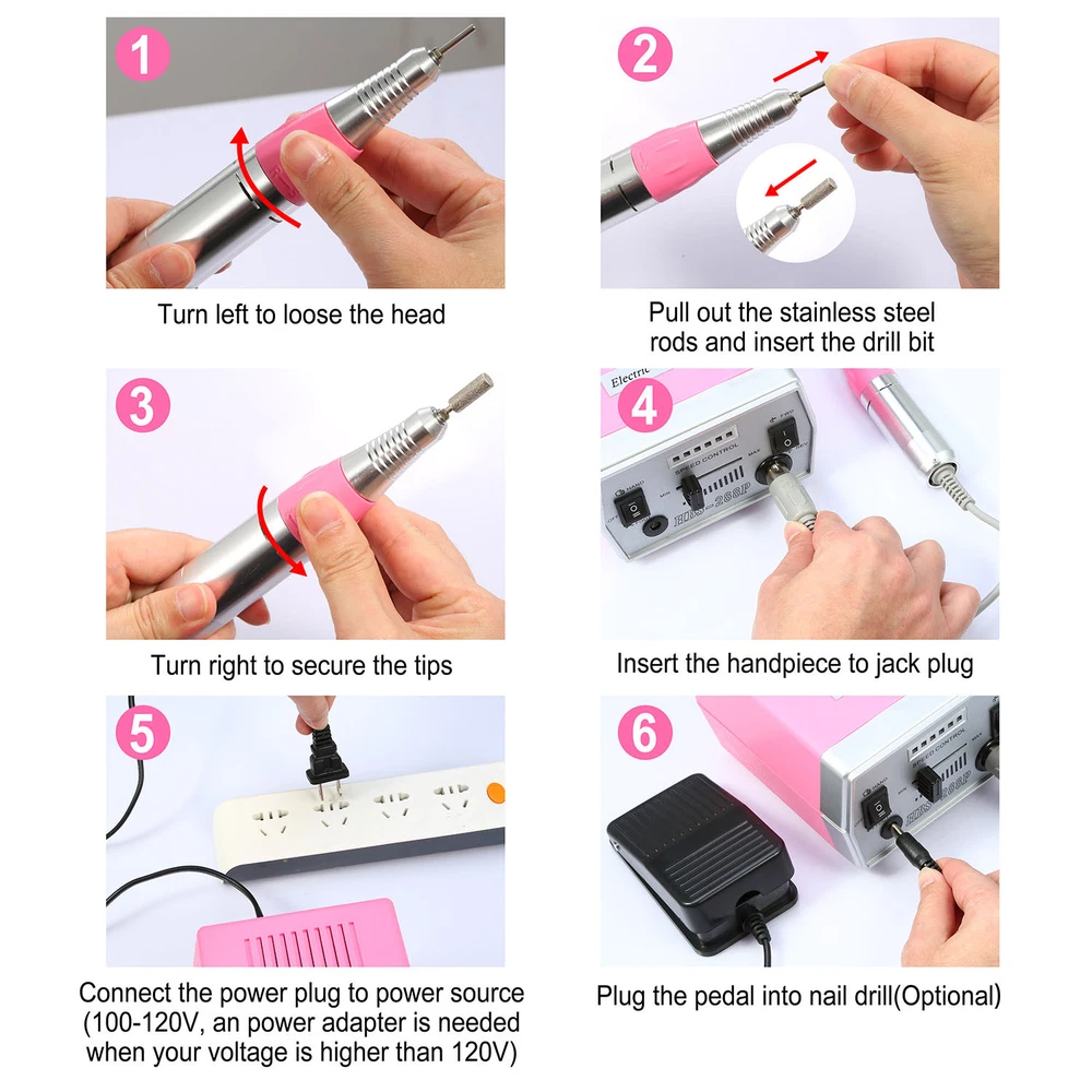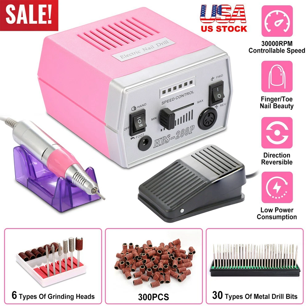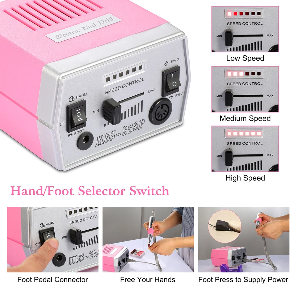 eBay GOOD QUALITY & FAST SHIPPING Product Detail Image Gallery Product Description Overview: Our electric nail drill kit features with 6 speed indicator lights and a speed control slide switch (Adjust from Min to Max speed when in use) , its inbuilt strong motor offers up to 30000RPM controllable speed to satisfy your needs at low noise and smooth working. Equipped with a FWD (Forward) and REV (Reverse) switch to change direction, optimal for left-handed use. Comes with 36 drill bits and 300 pcs sanding bands, an optimal acrylic nail care kit for exfoliating, grinding, polishing, carving, engraving, routing, sharpening and sanding, widely used in nail salon, beauty parlor, spa or nail DIY at home. An optimal gift for your girlfriends, friends or nail technicians. Features: Adjustable Speed and Direction: Featured with 6 speed indicator lights and a speed control slide switch(Adjust from Min to Max Speed when in use),inbuilt with a strong motor,it offers you up to 30000RPM controllable speed to satisfy your needs at low noise and smooth working. Equipped with a FWD(Forward) and REV(Reverse) switch to change direction,perfect for left-handed use. Professional Acrylic Nail Kit and Multi-purposes: Comes with 30 metal grinding drill bits,6 professional filing heads,300 pcs sanding bands,convenient for replacement according to your nail shapes,it can not only file,buff,but also smooth corns,calluses and remove excess cuticles. An optimal acrylic nail care kit for exfoliating,grinding,polishing,carving,engraving,routing,sharpening,sanding,etc. Finger Nail and Foot Working Modes: Equipped with a HAND and FOOT switch,makes it a humanized design that you can used both for nail finger and foot. Note:When you switch to FOOT mode(optional),you need to press the pedal to start the motor and make it work for you. 100-120V Input Voltage and Durable: Please make sure that your input voltage is 100V-120V,or a power adapter(Not included) is needed. Fast heat dissipation and low energy consumption,safe for you to use. Adopts ABS and metal materials,abrasion-resistant and durable. Widely Used: Widely used in nail salon,beauty parlor,spa or nail DIY at home. An optimal gift for your girlfriends,friends or nail technicians. Specifications: Brand: iMounTEK Product Type: Electric Nail Drill Machine Input Voltage: 100-120V, 60 Hz Output Voltage: 0-13V DC Output Current: 1.5A Rated Speed: 0-30000 RPM Color: Pink Power Supply Cable Length: 121cm/47.64inch Foot Pedal Cable Length: 137cm/53.94inch Handpiece Cable Length: 58cm/ 22.84inch Handpiece Size: 15×2×2cm/5.91×0.79inch Handpiece Weight: 182g/ 0.40lbs Nail Drill Machine Size: 13×15×8cm/5.12×5.90×3.15inch (L×W×H) Nail Drill Machine Weight: 657g/1.45lbs Foot Pedal Size: 10× 6×4cm/ 3.94×2.36×1.58inch (L×W×H) Foot Pedal Weight: 92g/0.21lbs Package Size: 26x26x15cm/10.24x10.24x5.9in Package Weight: 1633g/3.6lbs Package Contents: 1 × Table Stand for Handpiece 1 × Foot Pedal Power Control 30 × Metal Grinding Drill Bits 6 × Metal Optional Bits/Filing Heads 3 × 100 Pcs of Sanding Bands 1 × User Manual Terms & Conditions Thank you for your business ! On Sep 11, 2024 at 10:18:16 PDT, seller added the following information: