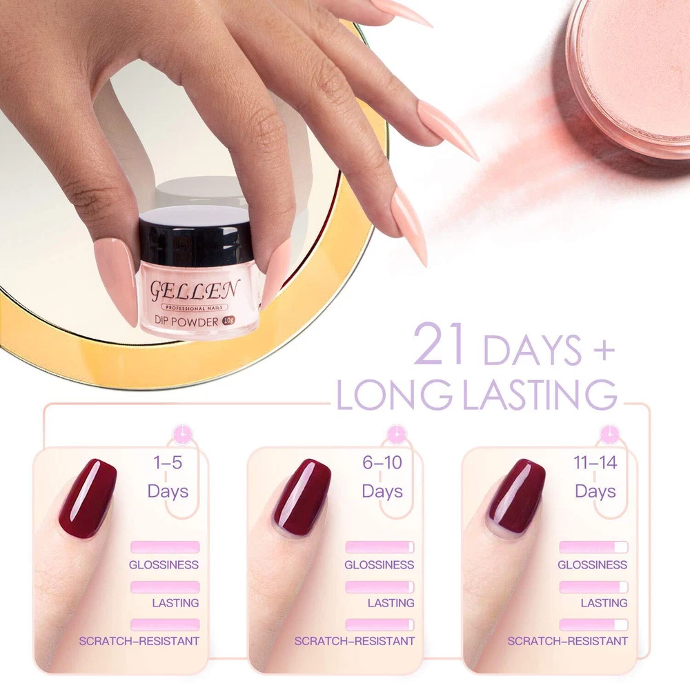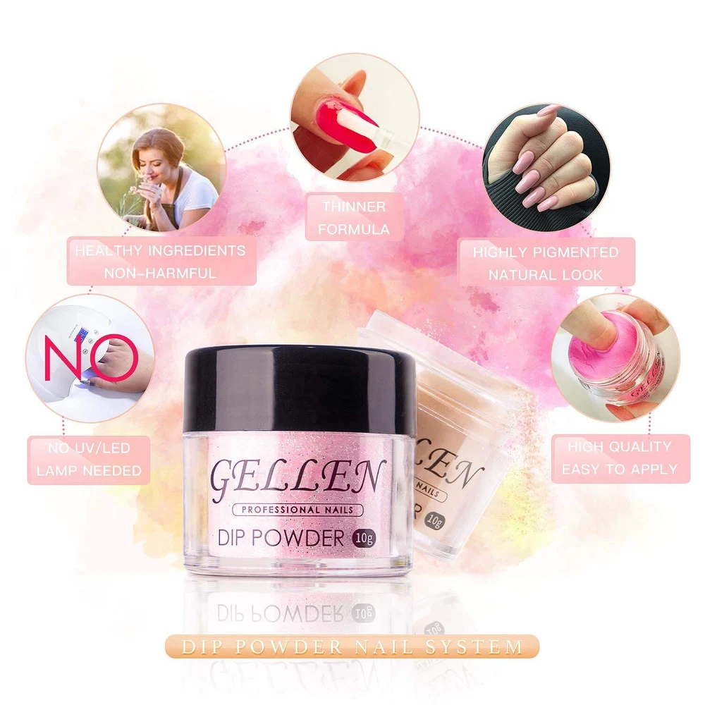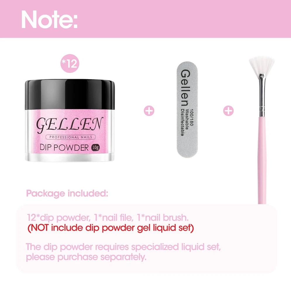 ✨【Delicate Dip Powder】Discover 12 popular and stylish colors that span all seasons. With 15000+ shade combinations possible, you can play with various looks. From spring to winter, these shades match summer swimsuits to winter neutrals. And you will get 12 colors dip powder, nail file and nail brush. ✨【Salon Quality & 21+ Days Long Lasting】Gellen nail powder is a fine powder with anti-chip, unrivaled shiny and vivid, non-yellowing, and superb adhesion properties. Most fashionable style colors, lightweight, breathable, and waterproof. It can last for more than 21 days even without nail dryer curing under proper application. ✨【No Need Nail Lamp & Wide Application】Free from a nail lamp, this dipping powder air-dries in 10-30 seconds, which can save 25% of your nail art time and avoid skin issues. The dip nails powder starter kit is suitable for natural nails, false nails, half cover nail tips, acrylic nails, french nails and more. ✨【Healthy Manicure & All Nail Lovers' Gift】The nail dip powder set is devoid of toxins and odors, aligning with skin-friendly standards due to its paraben-free and cruelty-free composition. This dip powder kit perfectly serves both home and salon use for beginners and professionals, and is an ideal gift for Valentine's Day, Birthdays, Mother's Day, Christmas and Anniversaries. ✨【Please Note】The dip powder gel liquid set is not included. Colors may appear different due to lighting, monitors, and application technique. Please read the directions for more details. Contact us for any issues or questions. Enjoy your colorful life with GELLEN! Important information Safety Information *Avoid direct sunlight or extreme exposure to LED or UV light. * Do not apply to nails that damaged or infected. - Go to doctor if in eyes or mouth. Directions Please take a skin test before applying gel and wait for minutes to check for any allergies. Remove it immediately if redness or any other signs of adverse reactions occur. 1. Please make sure your nail is clean and smooth before you use this kit. 2. As the BASE is easy to dry, please prepare the powder first before you apply base coat. 3. When applying BASE, please avoid to getting product on cuticles. 4. Please dip at a 45 degree angle. 5. After dipping powder, please use a nail brush to remove excess powder from around the nails surface. 6. Brushes may harden or pick up color powder during application. Please switch them between BRUSH SAVER for easy cleaning & workability. 7. Be sure to clean the neck & rim of bottles with alcohol immediately after dipping a full set of nails. Tigten caps & store in a cool environment away from heat & direct sunlight. Without proper care. BASE and TOP may become difficult to open. TIPS: Glitters colors: Take 30s air dry 1. After clean nails surface. Apply a thin coat of BASE 2. Quickly dip nails into the color powder (air dry 10s). Brush off excess powder 3. Repeat step 1- step 2 once or twice to get the color effect you want. 4. Apply dip ACTIVATOR (just 1 layer!!!) (air dry 10s) 5. File the surface of the nails smoothly. 6. Apply dip ACTIVATOR again (just 1 layer!!!) (air dry 10s) 7. Quickly apply thin coat of top gel TWICE (air dry for 10s) 8. Use Brush saver to clean the brushes HOW TO REMOVE 1. Buff the nail surface with sanding file (the buff effect is better with nail drill machine) 2. put your finger in the gel polish remover pad and wrap it 3. wait for 5 minutes and then remove the gel polish remover pad 4. remove the residue on the nail surface with pusher 5. finish
