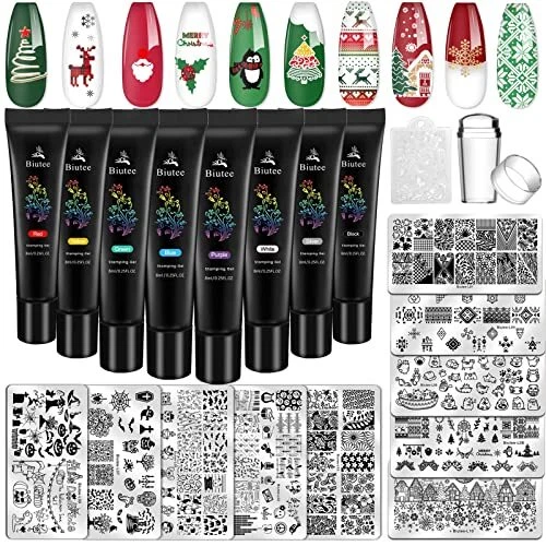 Nail Stamping Plates Set:It includes 10 Nail Stamp Plates + 1 Jelly stamper +1 Replace Head + 8 Stamping polish +1scraper. This is the best gift, you will be shinning on halloween day. Stamping polish : Contains essential colors,8*0.25FL.OZ Stamping polish in different colors ( green, black, white, blue, gold, purple, red, silver). Nail stamp Plates: It is made of high-quality 304 stainless steel. Holiday Theme - The nail stamping plates feature Christmas theme, The template contains Snow, Santa Claus, deer, music, animals, flowers, leaves, and lattice themes. It can also be suitable for daily use in the scene that meets the needs of special festivals. Stamper: Not only can stamp but also French manicure. Transparent silicone material, with clear profile, complete structure and transparent texture all over the body. The location of the profile can be clearly seen. Easy to Use: Peel off the blue protective film, apply nail stamping , scrap off excess and use the nail stamper on it. If you have any questions, please feel free to us, we will give you a satisfactory answer or a full .
