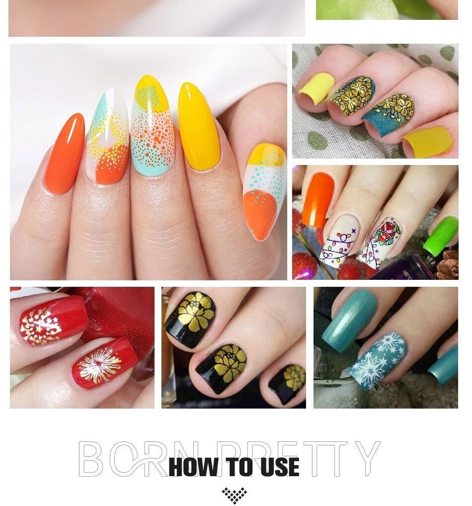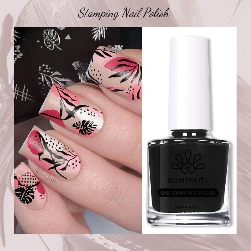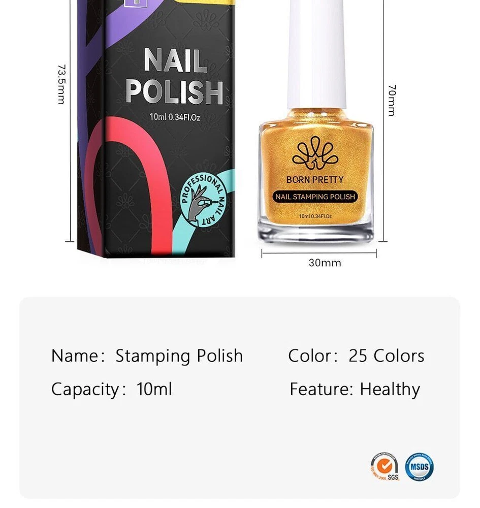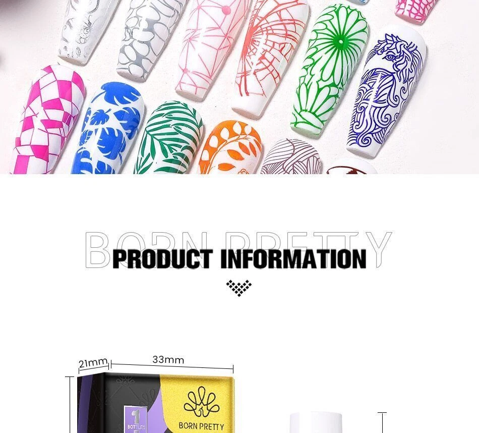 PRODUCT DESCRIPTION: Specification: Brand: BORN PRETTY Type: Stamping Nail Polish Color: 3 Colors for Choose Quantity: 6 Bottles Volume: Approx. 10ml Using Tools: Dry by natural, matched with Stamper&Scraper and Stamping Plates(not including) Package Contents: 6 Bottles 10ml BORN PRETTY Stamping Nail Polish Why Choose Our Nail Polish? Made of high quality material, the nail polish is of high pureness , making your nail with bright colors. Easy to apply, quick-drying. Special nail polish for nail art stamping and printing colors. Simple to use: Shake or stir very well before use. Comes with brush making nail art fast and easy for everyone. Allow you to create beautiful nail designs in short time. How To Use Our Nail Polish? Step 1: Apply the base gel and color polish on your nails. Step 2: Apply the nail latex. Step 3: Apply stamping polish on stamping plates. Step 4: Use scraper to scrape the excessive stamping polish. Step 5: Press the stamper quickly to pick up the pattern. Step 6: The pattern is completed and transfer on nail surface. Step 7: Peel off the nail latex and apply the top coat to finish the nail design.