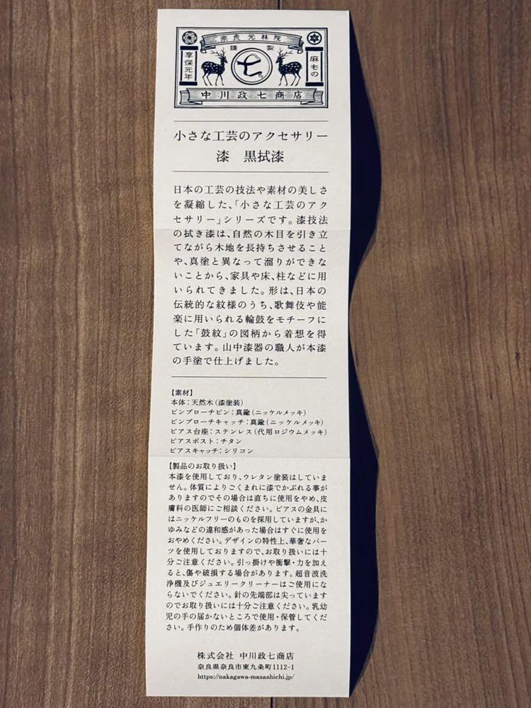 Description Nakagawa Masashichi Shoten black lacquer pin badge small craft accessories This series of small craft accessories condenses the beauty of Japanese craft techniques and materials. After wiping the lacquer technique, it has been used for furniture, floors, pillars, etc. because it brings out the natural grain of the wood and makes the wood last longer, and because it does not change like real wood. The shape is inspired by the tsuzumi-mon pattern, which is a traditional Japanese pattern that is based on the ring drum used in Kabuki and Noh theater. Craftsmen of Yamanaka lacquerware finished it by hand. Material Body: Natural wood (lacquered) Pin proach bin: Brass (nickel plated) Bin pouch catch: true (nickel plated) Via pedestal: Stainless steel (substitute rhodium plating) Via post: titanium Earring catch: silicone If you have any questions, please do not hesitate to ask. ^_^ Policy Payment You can use various payment methods based on eBay Managed Payments. Import duties, taxes and charges are not included in the item price or shipping charges. These charges are the buyer's responsibility. Shipping Expedited Shipping We always send the item with a tracking number. So please place an order without any concern on delivery. You can always track the delivery status. Shipping is only available to the address registered in eBay. If you want us to send another address, please change your address on eBay and then place an order. Shipping is available from Monday to Friday. Weekends are not available because freight companies are closed. Economy Shipping Delivery in 2-4 weeks. It may be delayed depending on the area and weather. Without tracking number. Cancellations & Returns Cancellation or returns will be accepted only if the item has an obvious problem that was not mentioned in the listing description. If that, please let us know within 3 days you got the item. Buyer is responsible for shipping costs and any charge incurred shipping products back. International Buyers Import duties, taxes and charges are not included in the item price or shipping charges. These charges are the buyer's responsibility. Please check with your country's customs office to determine what these additional costs will be prior to bidding/buying. These charges are normally collected by the delivering freight (shipping) company or when you pick the item up - do not confuse them for additional shipping charges.