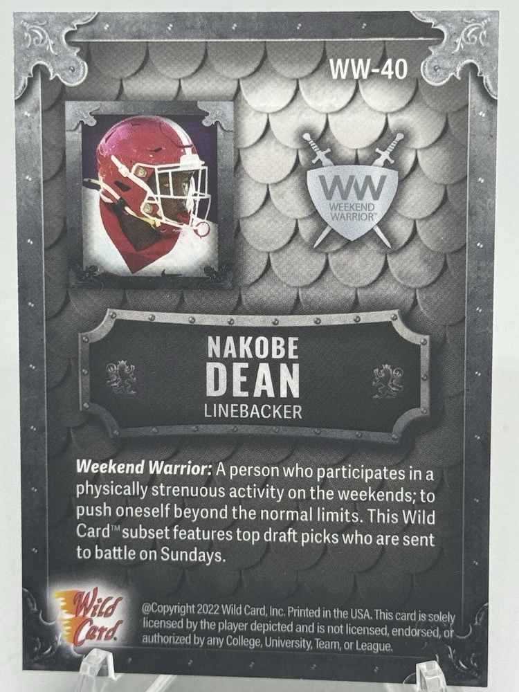Nakobe Dean 2022 Wildcard Matte White Weekend Warrior #WW-40 Insert. Condition is Ungraded. Shipped with eBay Standard Envelope for Eligible Items up to $20.