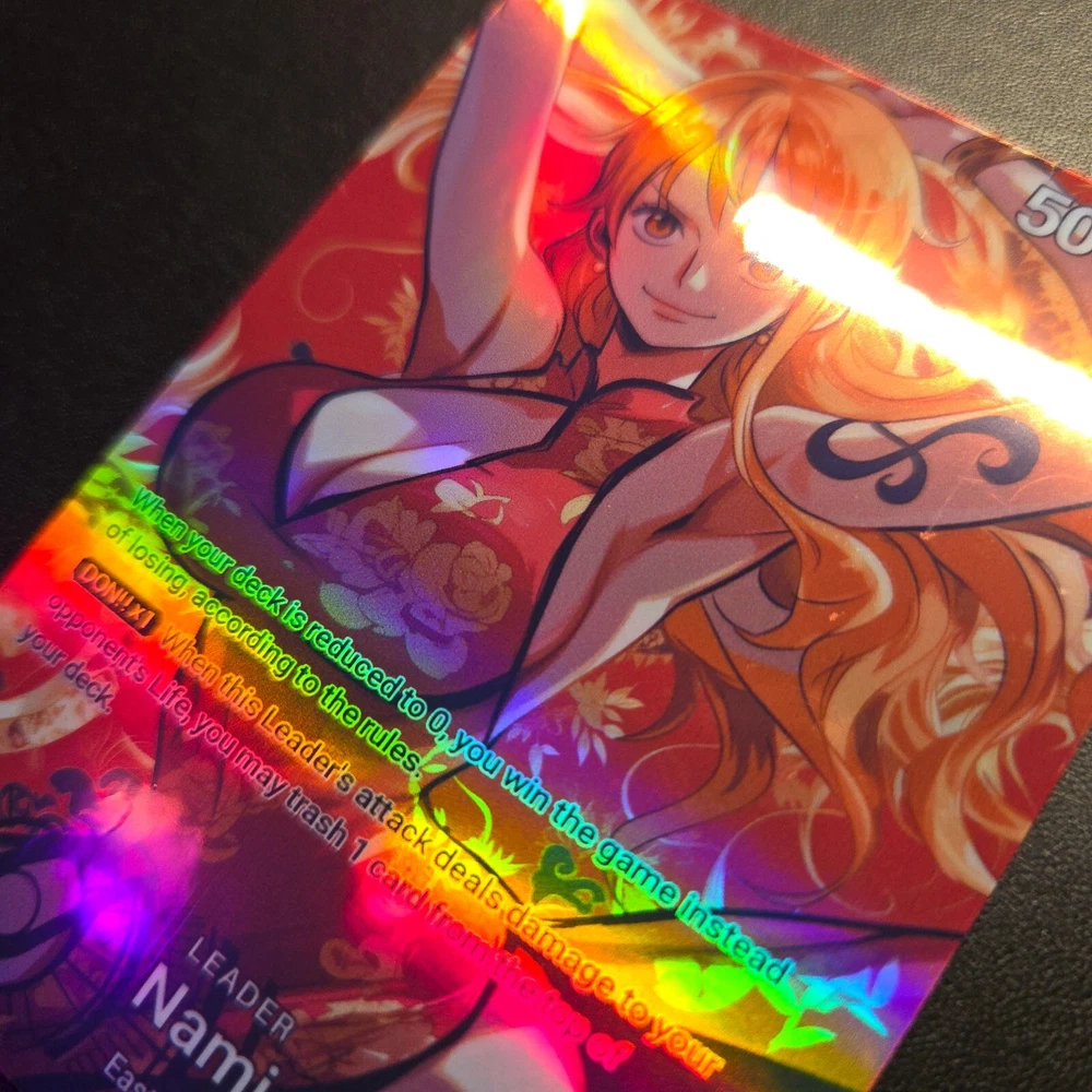 Holographic Foil Nami Leader Card One Piece Card Game Proxies Set: OP03-040 Variant: X Card size: Standard (2.5 x 3.5 inches) Materials: Glossy Vinyl, One Piece Playing Card --------------------------------------------------------------------------- Are you a cultured and distinguished gentleman that enjoys waifus? If so, then you are in the right place! Each card is handmade, and made to order. I have experimented and choose the best materials to replicate the quality of the original card. Each card is laminated with protective vinyl (waterproof), and applied on an official One Piece Card Game leader card. I inspected every card before shipping to ensure each card is up to standard. I love each card I create and I hope you do too 💖. View my store for see all the proxies! Please contact me for any questions or concerns. Thank you! --------------------------------------------------------------------------- This is a fan-made custom card that is a parody of the actual card game. AI and Photoshop was used in the help of this art.