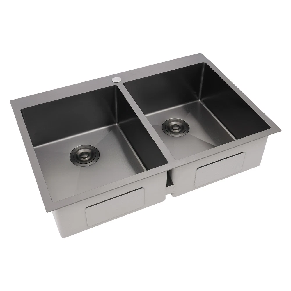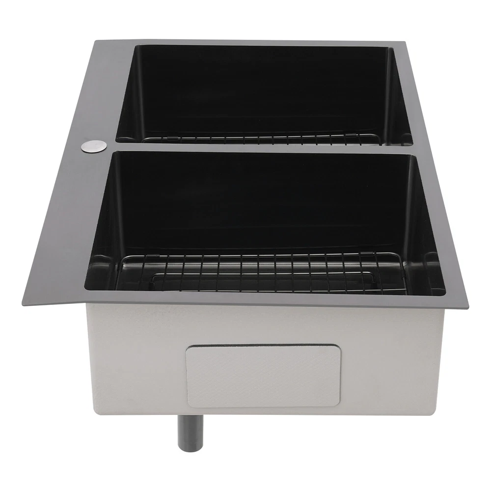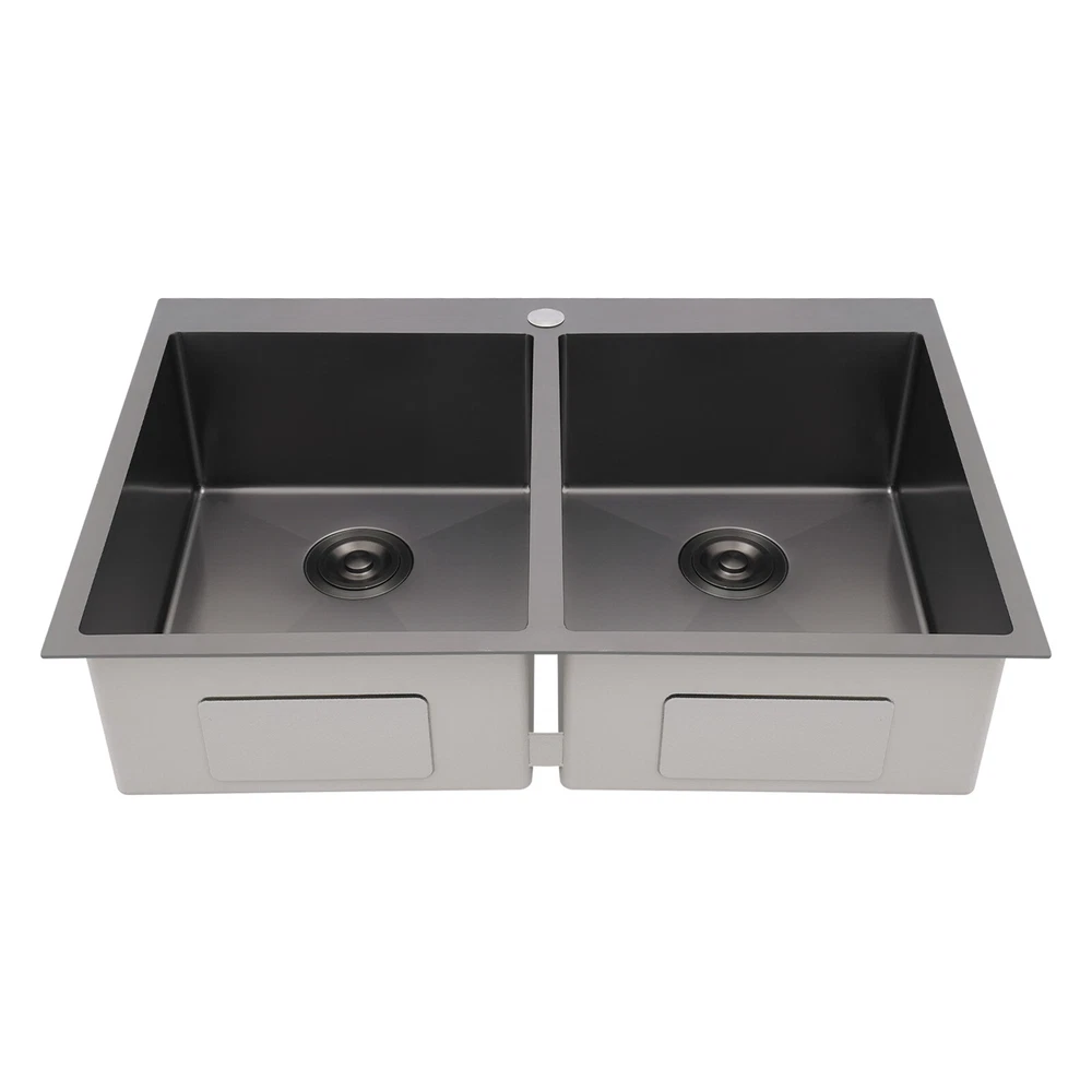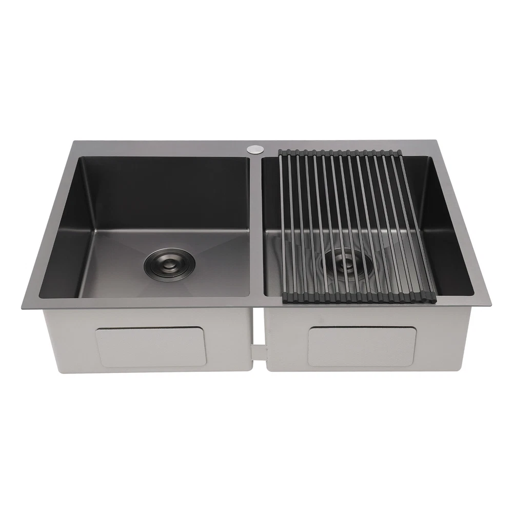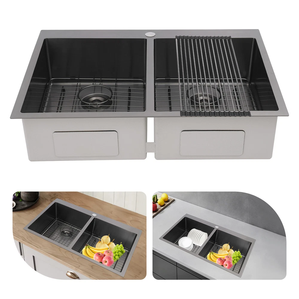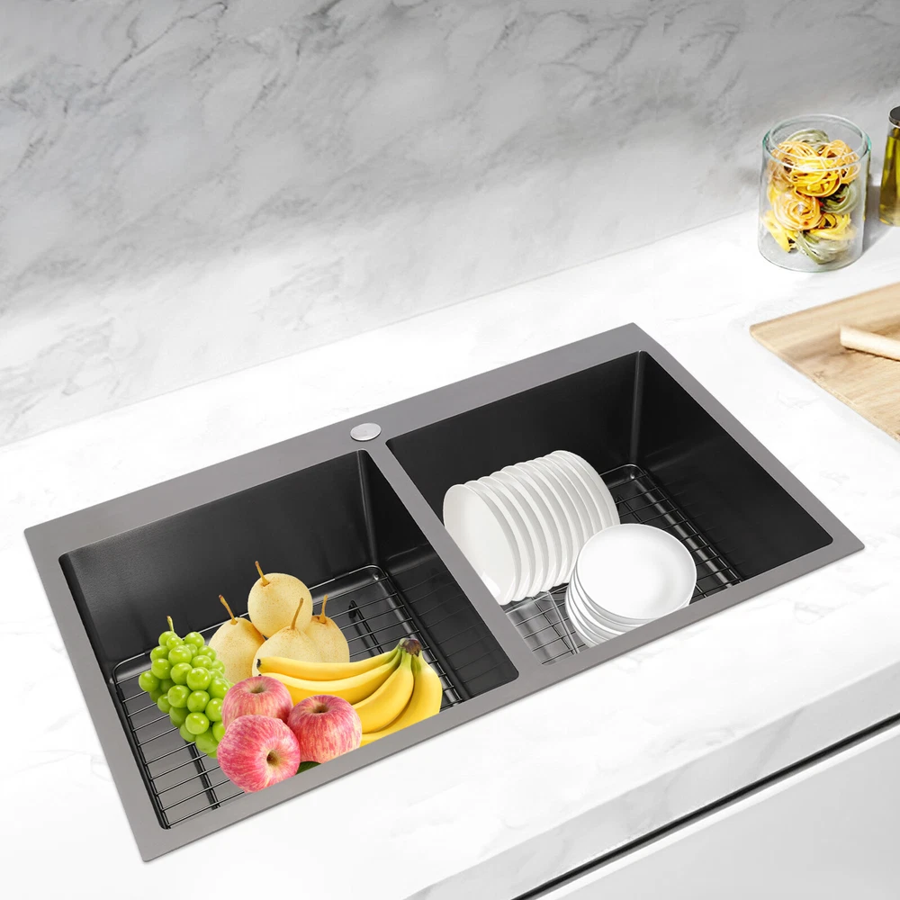 Application This product is suitable for both commercial and residential use and can be used in the kitchen, restaurant, laundry room, school, hospital, and other places. Specification Material: 304 Stainless Steel Color: Black Process: Nano Coating Shape: Rectangular Style: Modern Assembly Required: Yes Mounting Type: Topmount, Flushmount, Undermount Opening Size(Topmount): 81.8*53.9cm/32.2*21.22in Product Size: 83.8*55.9*20cm/33*22*7.87in Package Size: 89*61*29cm/35.04*24.02*11.42in Gross Weight: 10kg/22.05lbs Net Weight: 9.5kg/20.94lbs Package Included 1* Double-Bowl Kitchen Sink 2* Drainage Grids 2 Sets* Drain Strainers 1* Roll-up Drying Rack Nano Stainless Steel Double Bowl Kitchen Sink Scratch-Resistant Topmount Sink Description Are you looking for a convenient and practical kitchen cleaning sink? Please take a look at our double-bowl kitchen sink, which is made of premium 304 stainless steel with a nano-coating process and is robust and durable. Its enlarged and deepened sink alleviates splash problems and provides more space for washing more fruits and vegetables and cooking utensils. Key Features Made to Last: High-class 304 stainless steel and exquisite nano-coating process make this product sturdy, scratch-resistant, impact-resistant, and not easy to corrode and deform, ensuring a long service life. Large Sink Space: The 7.87-inch-depth and double bowl design allow you to clean large amounts of plates, dishes, and pots, and wash fruits, and vegetables at one time without splashing, saving time. Thoughtful Design: It is equipped with sound insulating pads, which can effectively reduce the noise generated by the faucet water release and the collision of dishes, creating a quiet kitchen environment. In addition, the anti-condensation coating can prevent the kitchen cabinet from getting wet and moldy. Quick Drainage: The X-shaped water guiding line can guide water flow and form vortices to achieve rapid drainage. The drain strainer intercepts food and debris for easy disposal and prevents clogging. Easy to Install: Its simple structure and complete installation accessories allow you to easily complete the installation in a short time. In addition, three different mounting ways (topmount, flushmount, undermount) can meet your different needs. Complete Set: This product is a complete set consisting of a double-bowl sink, two drainage grids, two drain strainers, and a roll-up drying rack, which can meet your kitchen cleaning and drainage needs without the need to purchase additional parts, making it very convenient. Stylish Appearance: The low-key black color makes it look modern and stylish to blend in with different decor styles and adds a touch of decor to your space. Effortless Cleaning: Thanks to its smooth surface, rounded corners, and simple construction, you can easily clean it with water and a cloth (not included)! In addition, the thickened nano-coating can reduce oil adsorption, prevent bacterial growth, and make it easier to clean. Buy with Confidence: We stand behind all our guests and look forward to assisting you with your purchase. It is our pleasure to answer your confusion and questions. The end of the story between us is not "we sell and you buy". Details Roll-up Drying Rack: It can be directly placed on the kitchen sink for drying cutlery, cups, and small plates. Practical Drainage Gid: It can effectively protect the bottom of your sink and allow your utensils to drain on the grid. The hole in the middle of it allows you to operate the drain strainer without taking out the grid, making it convenient for you to operate. Application This product is suitable for both commercial and residential use and can be used in the kitchen, restaurant, laundry room, school, hospital, and other places. Specification Material: 304 Stainless Steel Color: Black Process: Nano Coating Shape: Rectangular Style: Modern Assembly Required: Yes Mounting Type: Topmount, Flushmount, Undermount Opening Size(Topmount): 81.8*53.9cm/32.2*21.22in Product Size: 83.8*55.9*20cm/33*22*7.87in Package Size: 89*61*29cm/35.04*24.02*11.42in Gross Weight: 10kg/22.05lbs Net Weight: 9.5kg/20.94lbs Package Included 1* Double-Bowl Kitchen Sink 2* Drainage Grids 2 Sets* Drain Strainers 1* Roll-up Drying Rack Notes Please check the size carefully before ordering. Please note that to prolong the life of the sink, do not scratch the surface with sharp objects. If you want to get a better installation result, we recommend that you hire a professional worker to install it. Please allow the slight color difference caused by the shooting light and 1-3cm error due to manual measurement, and make sure you do not mind before you order. Payment Delivery details Terms of sales About us Contact us Payment We accept ebay payment 。 Fees such as import duties, taxes are not included in the item price or shipping costs. These charges are the buyer's responsibility. Delivery details Shipping: 2-9 working days to: USA Terms of sales We maintain high standards of excellence and strive for hundred percent customer satisfaction. Feedback is very important to us. We hope that you contact us immediately before you give neutral or negative feedback, so that we can address your concerns. It is impossible to address issues if we do not know about them! About us Your satis faction is our ultimate goal. We work hard to earn your trust and future business. Our certified technicians have tested each item before shipping. The unit comes with 1 year limited warranty on all manufacturing defects. a) If you receive a defective item, you may return it or ask for a discount. Please contact us within 14 days after you receive the package. b) What you returned must be intact and in its original packaging as re? u. Customer is responsible for shipping costs of the returned item. c) We will cover the cost of shipping back t with the shipping rate indicated in the registration page. We will send you a new unit or refund the full payment you paid. Tha