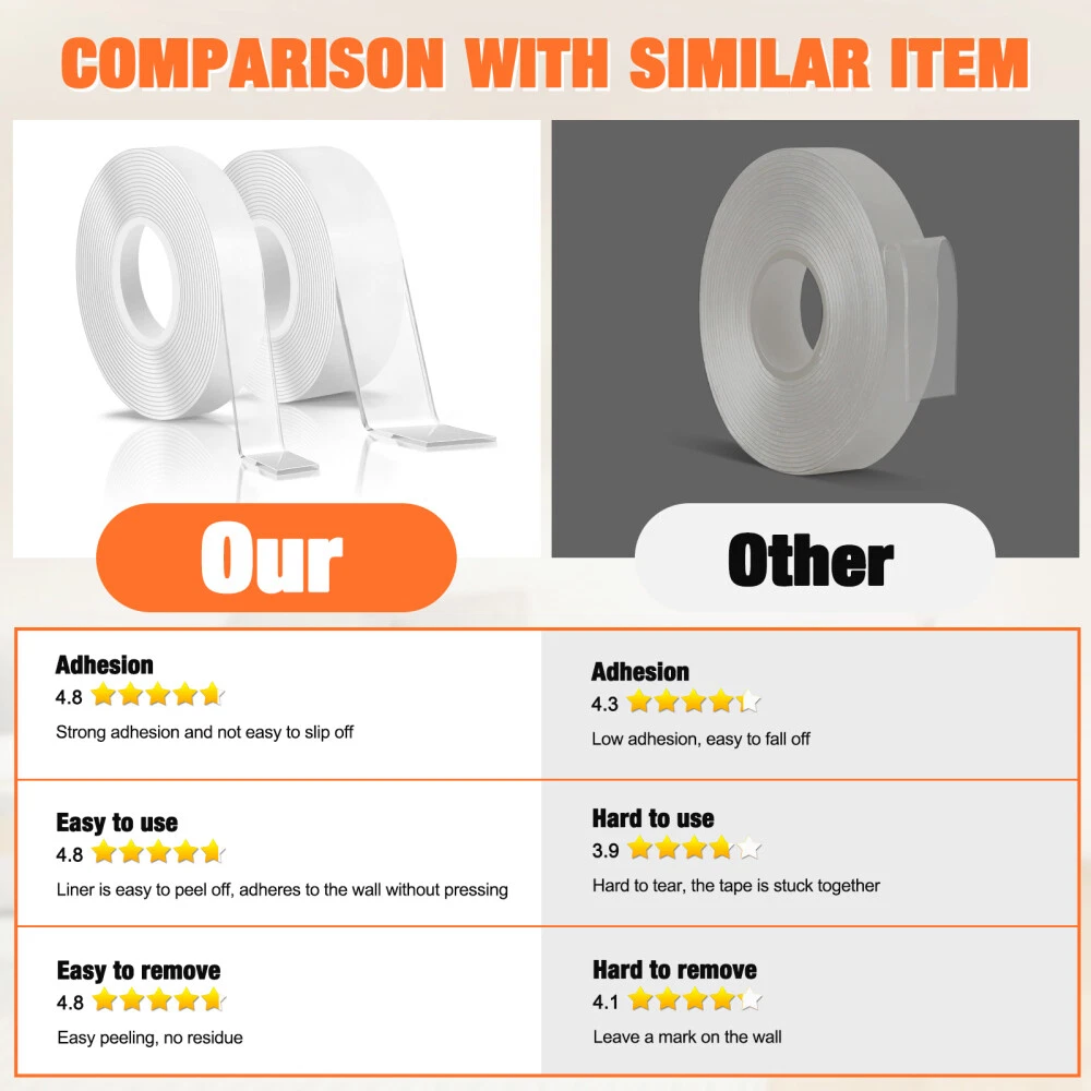 Nano Super Tape Double Sided Heavy Duty Reusable Adhesive Stick Transparent Tape Visit Our Shop H ot Sale Pro motion Contact Us Description STRONG ADHESIVE Our nano glue allows easy and damage-free attachment of items to the wall.Made of leading acrylic gel material, this clear adhesive double-sided tape demonstrates strong durability and adhesion, three times that of conventional tape. And it is very easy to remove and leave no residue. MULTI FUNCTIONAL DOUBLE-SIDED TAPE The double-sided transparent tape can be used for car phone holders, posters, picture frames, pen holders, wall stickers, hooks, small tools, sticky pads, phone cases, patches, decorative items, and wall decor. Additionally, this tape is washable and reusable. SAFE NANO GEL MATERIAL: This double sided mounting tape is non-toxic, environmentally friendly and recyclable. transparent, no residue, removable. STRONG STICKY: Unlike ordinary tapes, this washable adhesive tape is used the most advanced nano-technology, made of the latest acrylic gel material, ensuring high viscosity, durability, elasticity, and residue-free performance. It adheres perfectly to smooth, clean, non-porous surfaces like glass, windows, doors, wardrobes, table tops, bathroom tiles, and marble. Not suitable for powder wall, plaster wall, rough wall, or paint wall to prevent wall damage. WASHABLE & REUSABLE: The reusable transparent two sided tape can be easily cleaned with water when dirty, but avoid using other wipes or detergents. Simply wash and dry the tape to restore its stickiness for repeated use, with the caveat that the number of uses may vary depending on viscosity. EASY TO USE: Easily cut to any size and length you want! It can be stretched, bending and folded out of shape to meet your needs. The transparent double-sided tape is very easy to remove and leave no residue. MULTI-FUNCTION AND NO MORE MESSY: Say goodbye to disorderly small items with this removable mounting tape. It is versatile and can be used in various settings such as home, office, wardrobe, and bathroom. Use it to easily fix frames, photos, festival decorations, posters, carpets, power sockets, wall stickers, hooks, small tools, pads, phone cases, patches, , wall decor and more, lightweight items. Payment We accept PayPal Only! Import duties, value added taxes and any other charges are not included, Buyers are responsible for import duties, custom fees and taxes, if any. Please check with your country's custom office to determine the additional costs impose on the item prior to buying. We are absolutely NOT responsible for any import tax or Customs duty. Shipping 1)All items will be shipped to your ebay address .Please update your latest address when you check out,and please make sure to provide us with correct,precise and detailed shipping address. 2)All items will be shipped in 1-2 business days (excluding Sat,Sun & Holiday) after payment received and cleared. For the long-time holiday, we'll post the info on our store and reply you automatically via emails. 3)If you don't receive items over 30 business days,please make sure to contact us before leaving any neutral or negative feedbacks.We'll try our best to help you solve the problem. Return Your satisfaction is our main concern, so we try ensure your order is perfect in every way. However, things can occasionally go wrong and you wish return any item bought from us within 30 days of receipt for a refund or have the item exchanged. This can be for any of the following reasons - You need to exchange for a different item. You simply don't like your item. The wrong item was sent. The order was faulty or damaged. In the result of you wanting to return an item, you have 30 days to do so, in your return please include reason and action you would like to be taken. The buyer is responsible for the return postage, and if an exchange is required then extra postage cost will need to be paid. In the rare case of a faulty item or wrong item received then please get in contact with our customer service team and we will get the problem resolved as quickly as we can.