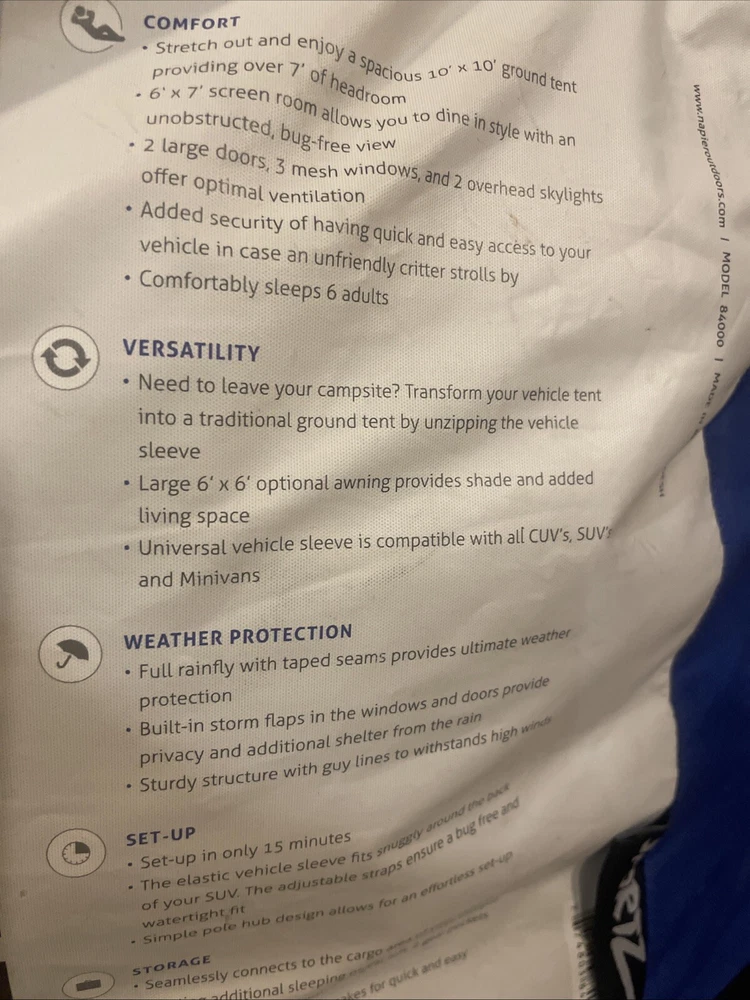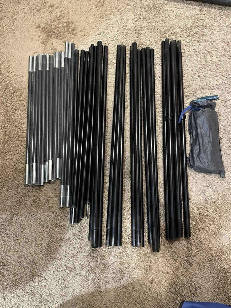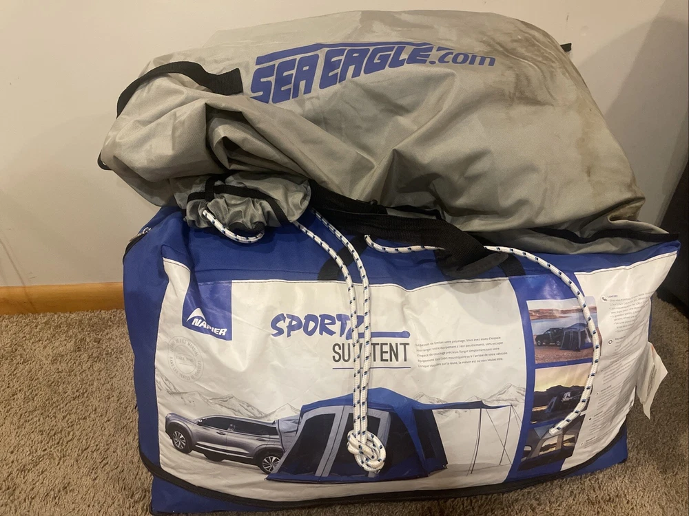 Good condition All items present Tent is used but in really good shape. There is a second bag included because I could not get all of the tent into the main bag and get it zipped haha but it’s all there.