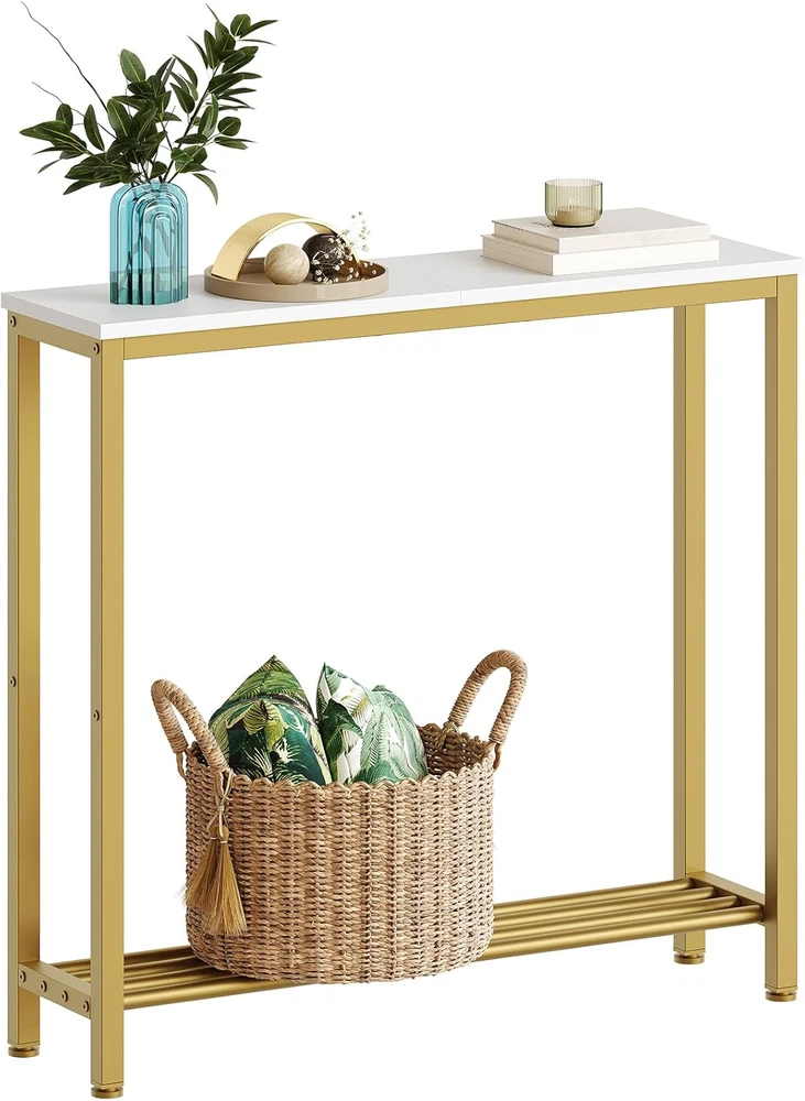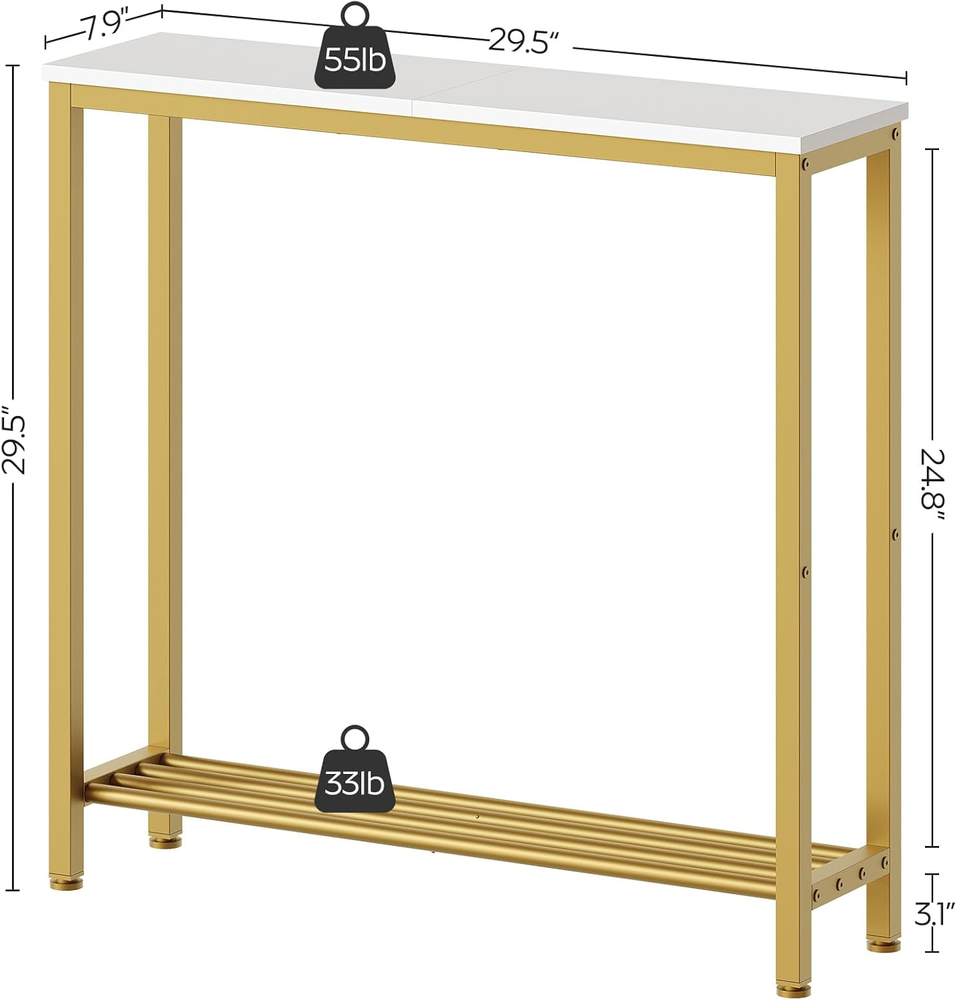 Space-Saving Master: With dimensions of 29.5"L x 7.9"W x 29.5"H, this console table is designed for small spaces. Featuring a double-layer layout and retro-inspired aesthetic, it effortlessly fits into tight corners, becoming your professional storage solution Stable Construction: The sofa table features 0.8mm thickened metal pipes for exceptional stability, complemented by the premium, easy-to-clean particleboard for a sturdy and reliable structure that ensures long-lasting use. Its top is capable of supporting up to 55 lb Versatile Table: More than just a chic addition behind the couch, this table is an ideal companion for entryway, hallway, study, and balcony. Magazines, plants, or daily essentials can be placed on it to fulfill your diverse lifestyle needs Secure Use: This behind couch table is equipped with an anti-tip device to enhance overall stability and ensure a safety experience. Four adjustable feet at the bottom flexibly adapt to various surfaces, protecting your floor from scratches Easy Assembly: Each part is thoughtfully numbered, accompanied by a detailed installation guide, a full set of tools, and spare screws. The setup is so simple that even novices can complete it in no time, providing you with instant access to your dream furniture Product Description YATINEY 29.5 Inches Narrow Console Table, Perfect For Small Spaces This hallway table occupies a small area and can be placed in the living room hallway, by the sofa in the living room, in the bedroom, and in multiple scenarios. The Console Narrow Sofa Table Can Fully Save Your Space Open shelves occupy very little space, but store a lot of things. Perfect for storing books, baskets, vases, plants, and other small items. More Detail About Sofa Table Double-Tier Shelving Designed with two tiers, the entryway table offers ample storage space for your belongings. Thickened Metal Pipes The 0.8mm-thick metal frame provides solid and reliable support for the tabletop. High-Quality Particleboard Crafted with premium panels, the tabletop is sturdy, serviceable, and easy to clean. Anti-Tip Device Secure it to the wall to prevent wobbling and tipping, enhancing overall stability. Adjustable feet The 4 adjustable feet keep the console table balanced even on uneven floors. Specifications Color White, Gold Material Particleboard, Metal Dimensions 29.5"D x 7.9"W x 29.5"H Weight 9.7 lb Max.Static Load Bearing of Top 55 lb Package Contents 1 x Console Table;1 x Accessory Package;1 x Anti-Tip Device;1 x Assembly Manual Different Choice for You Add to Cart Add to Cart Customer Reviews 4.3 out of 5 stars 38 4.4 out of 5 stars 26 4.1 out of 5 stars 44 4.4 out of 5 stars 285 4.4 out of 5 stars 90 — 4.6 out of 5 stars 66 Price $59.85 $ 59 . 85 — $31.99 $ 31 . 99 $58.79 $ 58 . 79 $56.09 $ 56 . 09 $56.79 $ 56 . 79 $29.39 $ 29 . 39 Color Rustic Brown, Black Rustic Brown, Black Rustic Brown, Black Rustic Brown, Black Rustic Brown, Black Rustic Brown, Black Rustic Brown, Black Top Board Size 70.9"L x 5.9"W 29.5"L x 9.4"W 29.5"L x 8.7"W 71.0"L x 7.0"W 70.9"L x 5.9"W 55.1"L x 7.8"W 17.0"L x 11.0"W Total Height 29.5"H 29.5"H 29.5"H 32.0"H 32.3"H 31.4"H 11.4"H Material Particleboard, Metal Particleboard, Metal Particleboard, Metal Particleboard, Metal Particleboard, Metal Particleboard, Metal Particleboard, Metal Assembly ✔ ✔ ✔ ✔ ✔ ✔ ✔
