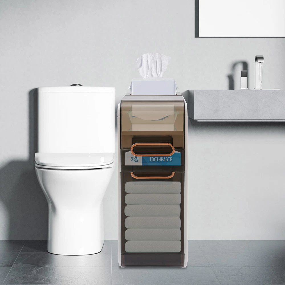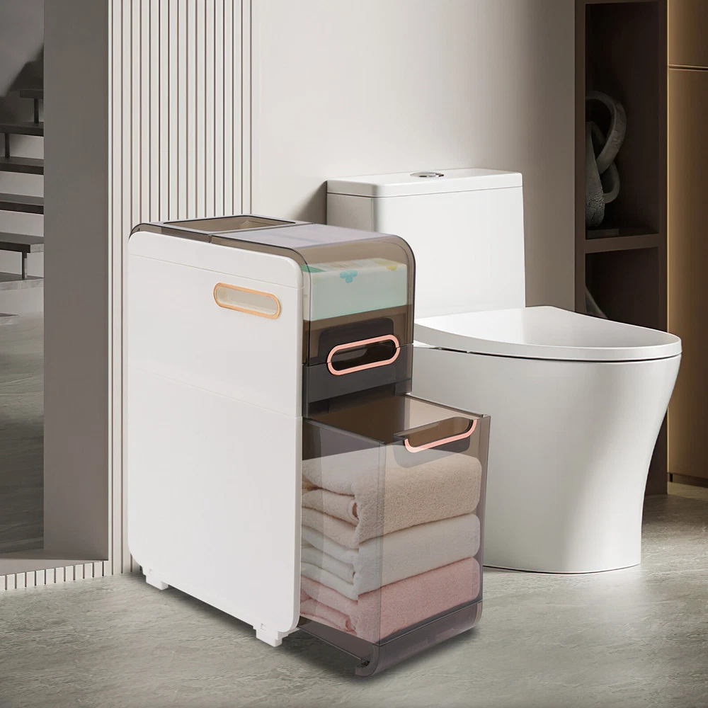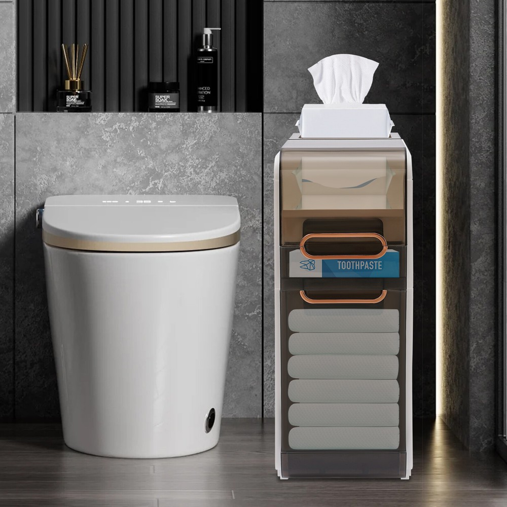 Description Do you feel like you have too little space and too much clutter in your bathroom? This bathroom floor cabinet will be a wise choice to provide you with extra storage space for your bathroom or toilet. With its slim body, solid construction, and spacious interior, it provides you with a large storage capacity without taking up much space, making your bathroom more organized, tidy, and comfortable. Key Features Build to Last: High-quality PP and PET materials and the injection molding process protect the product from corrosion, deformation, impact, moisture, wear, and scratch, and give the product a good appearance and a long service life. Large Capacity: The flip-open cover on the top, multiple drawers in different sizes, and top groove allow you to classify items like cosmetics, toilet paper, toothpaste, toothbrushes, masks, curling iron, towels, taller bottles of shampoo, and more. Thoughtful Design: The two sides with hollow parts not only promote airflow but also make it easier for you to pull the toilet paper. In addition, they can also be used as handles to make it easier for you to move the product around. Easy to Move: With two casters, you can easily and smoothly move the product and sweep the floor. Small Footprint: Its 8.66-inch slim body and vertical design make this product suitable for crevice storage in your bathroom/kitchen or beside the toilet. Modern Style: The harmonious black-and-white scheme and clean lines give this product an elegant and stylish look, making it a quality addition to your interior. Ready to Use: You just need to install the feet and casters on the bottom of this product and start to use it, saving you time and effort. Ideal Gift: Its stylish appearance and practical function make it an ideal housewarming gift for your friends, families, and colleagues. Protective Package: To prevent the product from being damaged during transportation, we packed it with foam to protect your products to the maximum extent possible. Details Translucent Panels: This design allows you to see the items inside for easy access and storage. Convenient Handles: Each drawer with a grooved handle allows you to easily pull them out and take items. Application This product with a narrow body is suitable for narrow spaces that need to be organized, such as bathrooms, bedrooms, laundry rooms, kitchens, dens, living rooms, and other places. Specifications Color: White Material: PP, PET Style: Modern Shape: Rectangular Number of Drawers: 2 Process: Injection Mold Assembly Required: Yes Mount Type: Floor Standing Product Size: 22*41.5*60cm/8.66*16.34*23.62in Packaging Size: 62*45*27cm/24.4*17.72*10.63in Gross Weight: 4.43kg/9.77lbs Net Weight: 4.1kg/9lbs Package Included 1*Bathroom Floor Cabinet Other Needed Accessories Notes 1. Please check the size carefully before ordering. 2. Please allow the slight color difference caused by the shooting light and 1-3cm error due to manual measurement, and make sure you do not mind before you order.