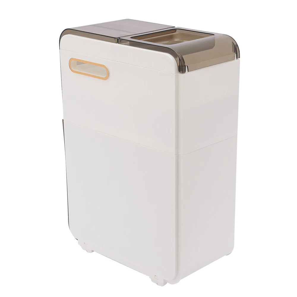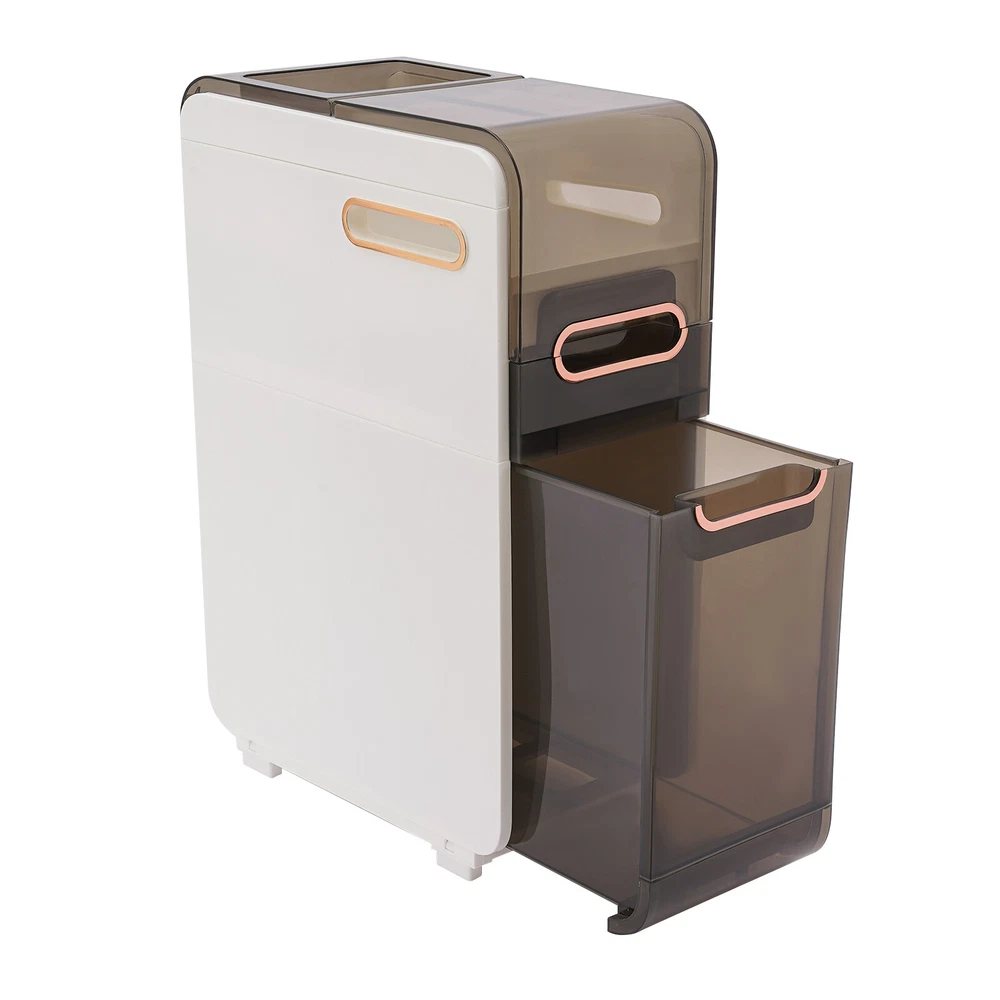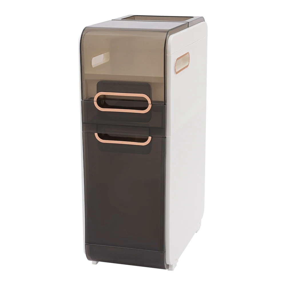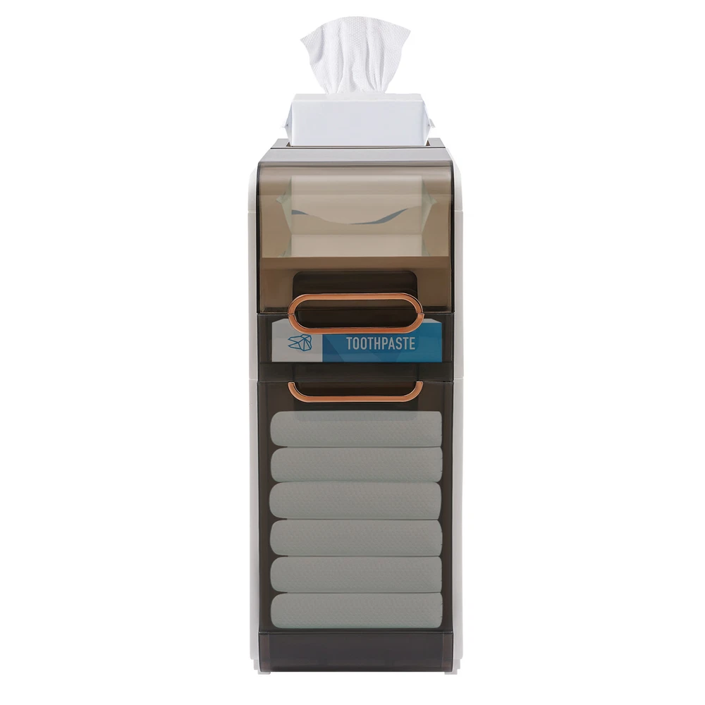 Description Do you feel like you have too little space and too much clutter in your bathroom? This bathroom floor cabinet will be a wise choice to provide you with extra storage space for your bathroom or toilet. With its slim body, solid construction, and spacious interior, it provides you with a large storage capacity without taking up much space, making your bathroom more organized, tidy, and comfortable. Key Features Build to Last: High-quality PP and PET materials and the injection molding process protect the product from corrosion, deformation, impact, moisture, wear, and scratch, and give the product a good appearance and a long service life. Large Capacity: The flip-open cover on the top, multiple drawers in different sizes, and top groove allow you to classify items like cosmetics, toilet paper, toothpaste, toothbrushes, masks, curling iron, towels, taller bottles of shampoo, and more. Thoughtful Design: The two sides with hollow parts not only promote airflow but also make it easier for you to pull the toilet paper. In addition, they can also be used as handles to make it easier for you to move the product around. Easy to Move: With two casters, you can easily and smoothly move the product and sweep the floor. Small Footprint: Its 8.66-inch slim body and vertical design make this product suitable for crevice storage in your bathroom/kitchen or beside the toilet. Modern Style: The harmonious black-and-white scheme and clean lines give this product an elegant and stylish look, making it a quality addition to your interior. Ready to Use: You just need to install the feet and casters on the bottom of this product and start to use it, saving you time and effort. Ideal Gift: Its stylish appearance and practical function make it an ideal housewarming gift for your friends, families, and colleagues. Protective Package: To prevent the product from being damaged during transportation, we packed it with foam to protect your products to the maximum extent possible. Details Translucent Panels: This design allows you to see the items inside for easy access and storage. Convenient Handles: Each drawer with a grooved handle allows you to easily pull them out and take items. Application This product with a narrow body is suitable for narrow spaces that need to be organized, such as bathrooms, bedrooms, laundry rooms, kitchens, dens, living rooms, and other places. Specifications Color: White Material: PP, PET Style: Modern Shape: Rectangular Number of Drawers: 2 Process: Injection Mold Assembly Required: Yes Mount Type: Floor Standing Product Size: 22*41.5*60cm/8.66*16.34*23.62in Packaging Size: 62*45*27cm/24.4*17.72*10.63in Gross Weight: 4.43kg/9.77lbs Net Weight: 4.1kg/9lbs Package Included 1*Bathroom Floor Cabinet Other Needed Accessories Notes 1. Please check the size carefully before ordering. 2. Please allow the slight color difference caused by the shooting light and 1-3cm error due to manual measurement, and make sure you do not mind before you order.