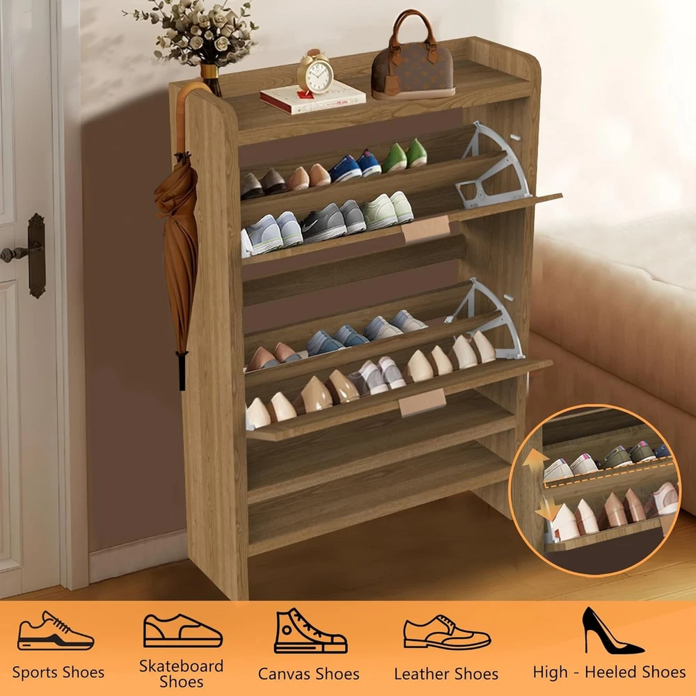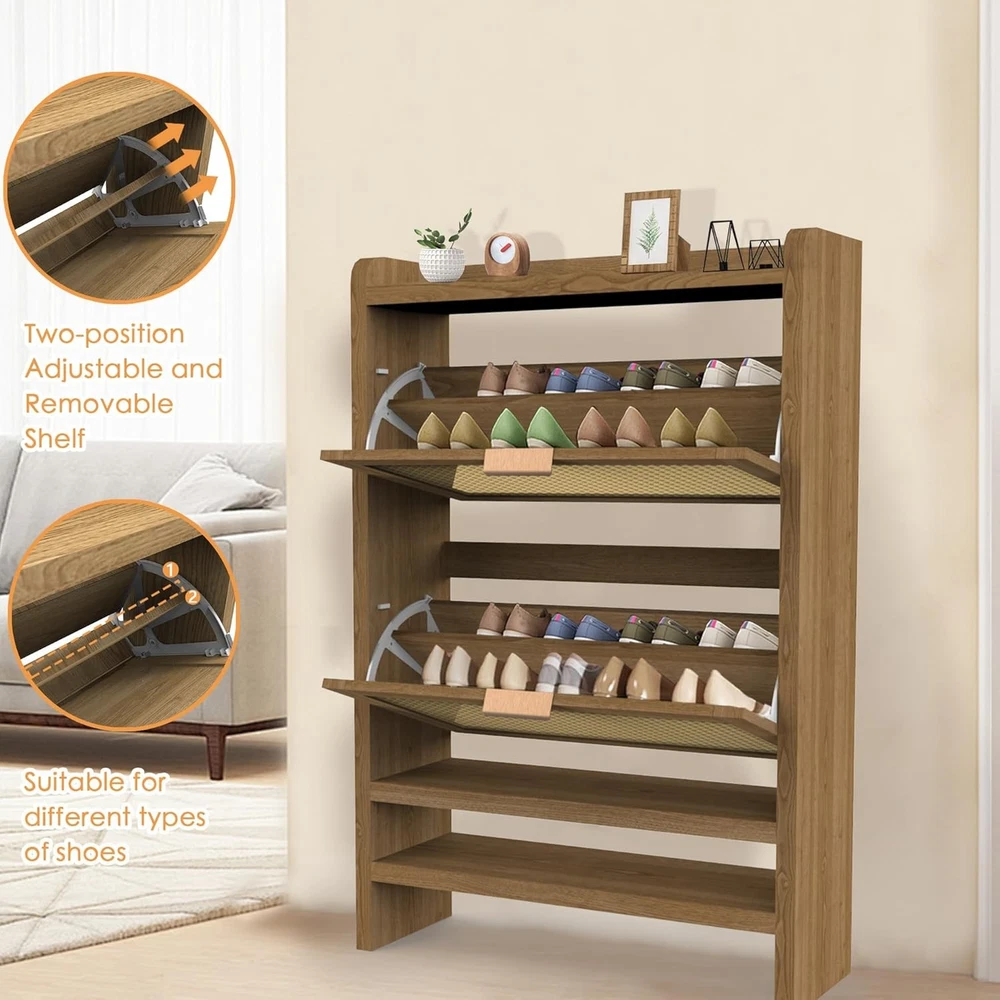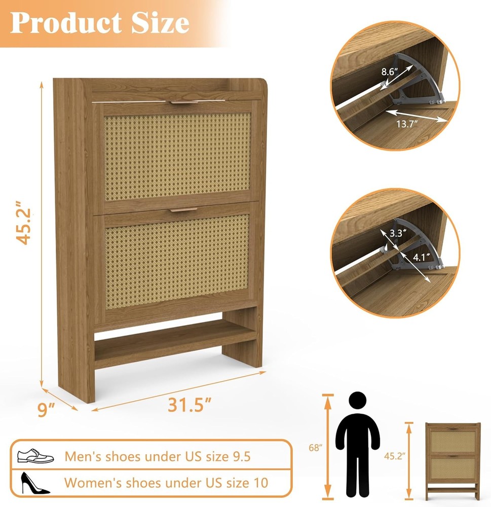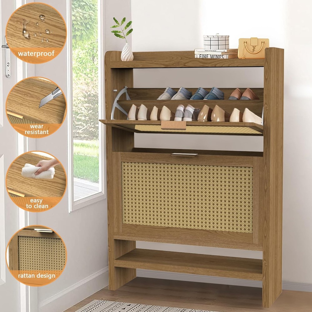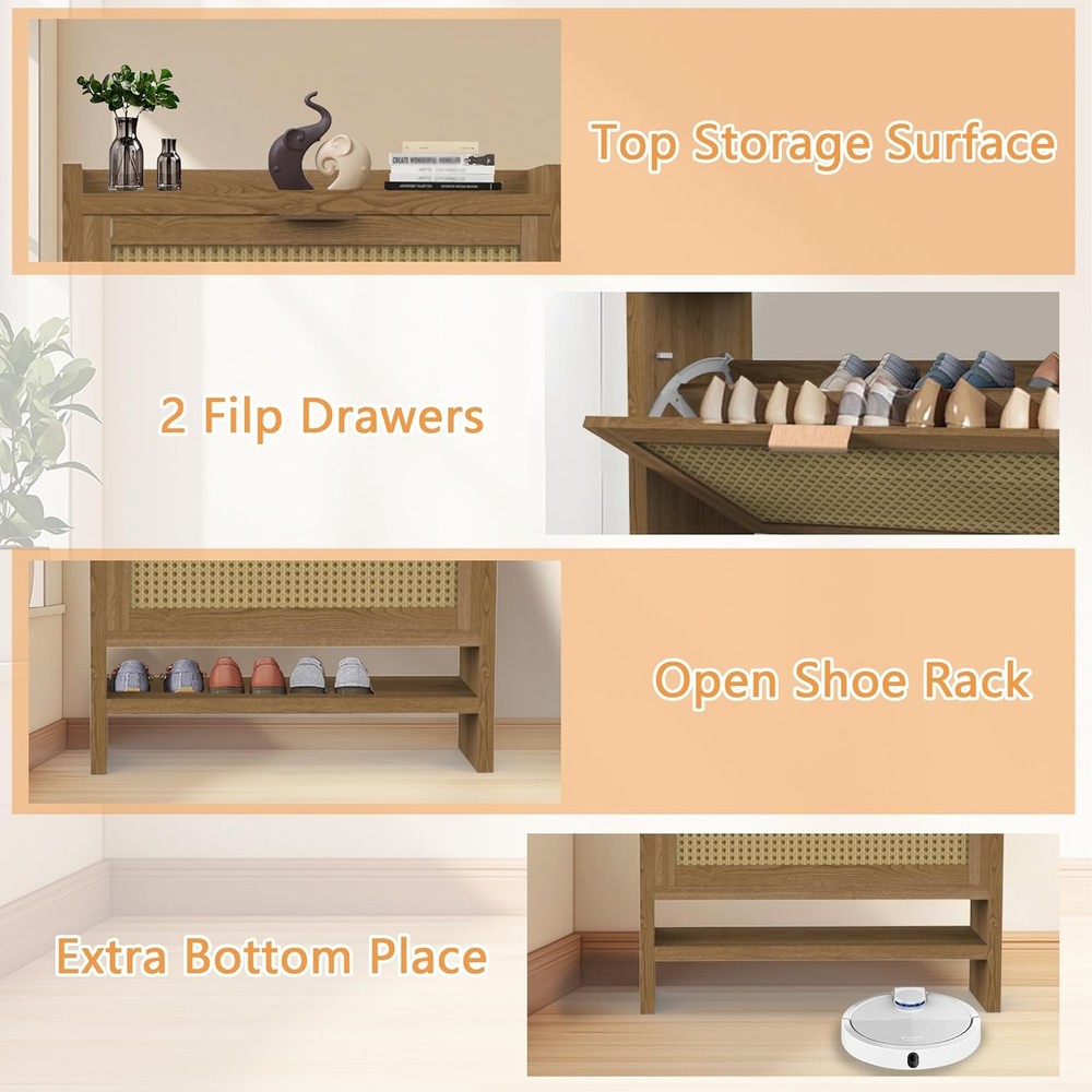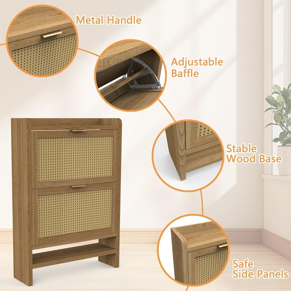 Shoe Cabinets with 2 Rattan Flip Drawers and Extra Storage Shelf, Freestanding Narrow Shoe Organizer Rack for Entryway, Light Oak Product Description About this item 【Boho Shoe Cabinet】The shoe cabinets with 2 ratten flip drawers, wooden frame and smooth handles which enhance the mid-century design of the entry way. This stylish and rustic shoe dresser is suitable for hallway, living room, or porch. 【Drawers and Extra Shelves】Our entryway cabinet with two fliped drawers and extra shelves provide large storage space to meet your shoe storage needs. Each drawer contains 2 layers of storage space and can be easily taken and divided into shoe sections. The panel can be adjusted or removed. 【Solid and Premium】Crafted with durable MDF wood for long term use, this two drawer narrow shoe cabinet with a strong structure and great weight capacity to hold your shoes. We also provide thick legs and anti-tipping device to prevent hazards. 【Space Saving】This slim shoe cabinet top is scratch-resistant, waterproof, and easy to clean, offers ample storage for picture frames, keys, wallets. This hidden shoe storage bottom space is ideal for storing slippers. It is an unique gift for him her dad kids. 【Easy to Assemble】All necessary accessories are included with our detailed instructions, precise holes and coded parts, you can easily create this entrance shoe cabinet. If there any problem, please contact us for a replacement or a solution for you. Thickened Board Metal Handle Rattan Door Wood Frame Sturdy Base Anti-tipping Device Adjustable Drawer Anti-Drop Shield Fliped Drawer for Daily Use Extra Shelves for Common Shoes