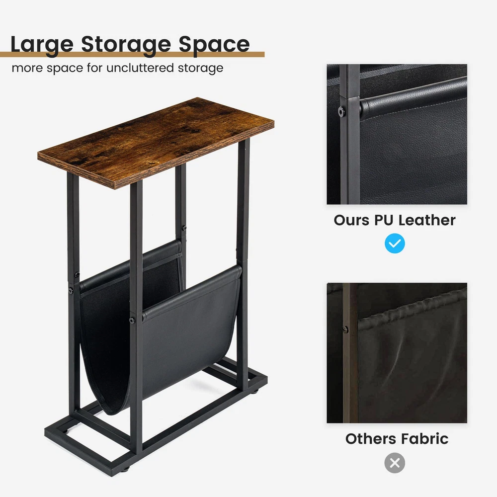 【Multiple Uses】Compact size, space-saving design crafted with a sturdy frame and durable P2 Particle board for long lasting,the small end table can be used as side table, end tables, snack tables, couch tables, drink tables, nightstands or bedside tables for living room, bedroom or home office. 【Improved Durability & Reliability】Constructed of heavy-duty metal frame and durable manufactured wood, this industrial narrow side table has long service life. The retro finish is scratch-resistant and wear-resistant, while can hold up to 60 lb. 【Side Table with Storage】Overall Dimension of this sofa side table is 16.25"W x 7"D x 22.25"H. This couch table with PU bag provides more space for the laptop, magazines, books, etc. 【Perfect for Any Small Space】 With 22.25 inch tall, this narrow sofa side table is suitable for any small space in your home. 4 Adjustable Feet add the extra stability to this snack table and prevent your floor from scratches 【Easy to Assemble】The side table comes with complete accessories and manual, you can assemble in 10 minutes. If you have any questions please feel free to contact us, we will reply you within 24H.