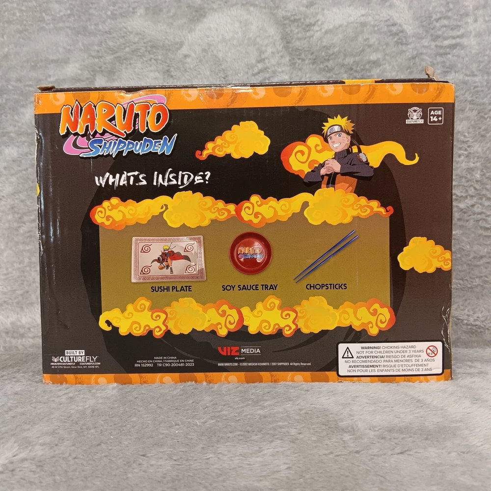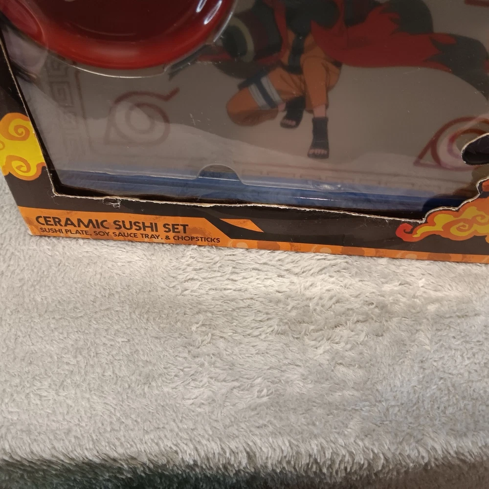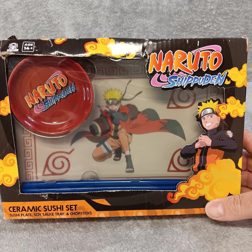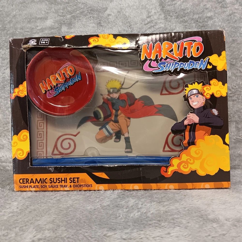 For sale, Naruto Shippuden Ceramic Sushi Set Includes Sushi Plate, Soy Sauce Tray/Bowl, and Chopsticks, NIB. This set hasn't been removed from the box. The sushi plate has the image of Naruto Uzumaki on it. The box does have some minor damage from handling. See photos for a visual description. Make sure to check out my store, new items are added daily so you never know what you will find. While you are there be sure to look at my clearance category where every item is marked at least 30% off the original listed price. Also, be sure to take advantage of any coupon codes or sales I may have available. Thank you for your interest, your time, and for checking out my store.