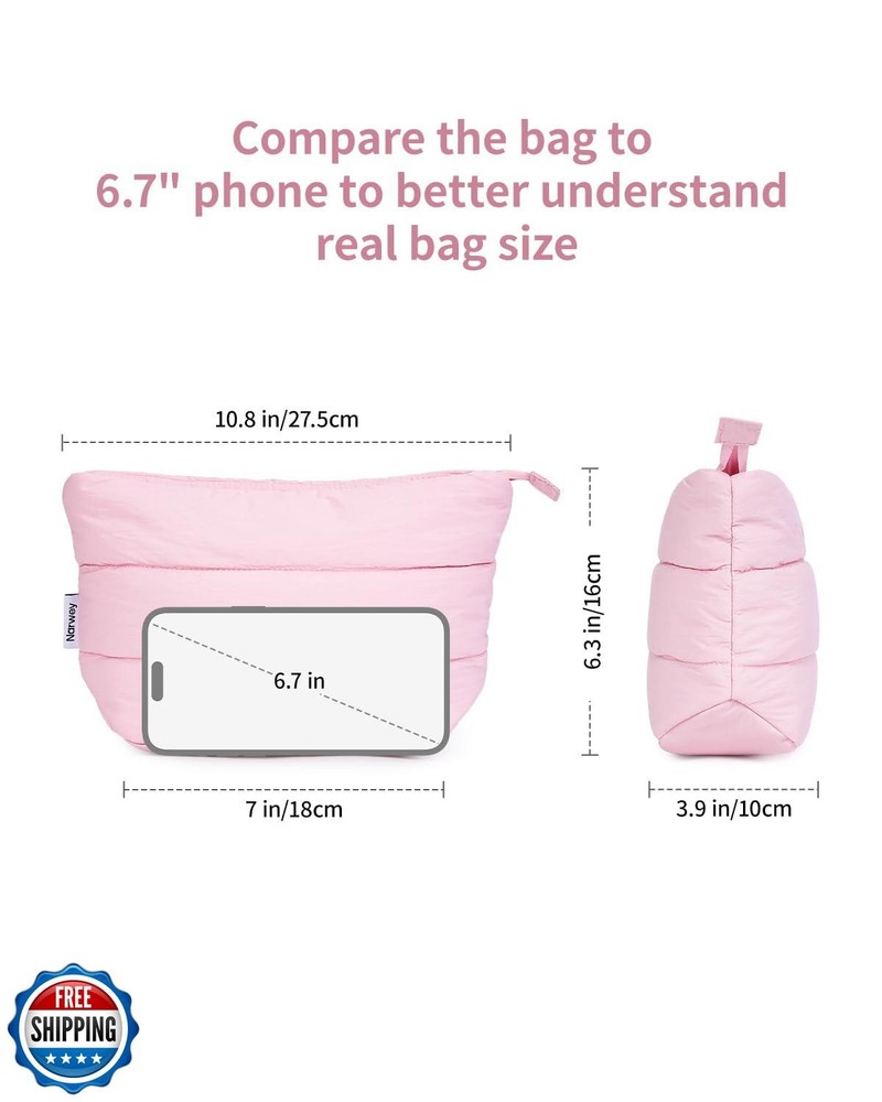 Narwey Puffy Makeup Bag for Purse Travel Women Girl, Puffer Cosmetic Bag Makeup Zipper Pouch, Cute Make Up Organizer Bags, Travel Toiletry Bag Toiletries (Dusty Rose) Features Decent Size - Please double check the size before purchasing to ensure it meets your expectations and avoid returns. Dimensions 7-10.8 x 6.3 x 3.9 in/17.7-27.4 x 16 x 9.5 cm, weighing only 0.15 lb. Not too big but not too small, large capacity yet compact, great for travel or daily use Makeup Organizer - The spacious design makes it super easy to open fully. Practical main compartment with 3 inner small pockets could neatly hold travel-size toiletries or skin-care products. It could fit sunscreen, 3oz lotion, cream, eyeliners, foundation, concealer, lipsticks, blushes, powder, eyeshadow pallet, mascara, lash curler and sponges Versatile - Sturdy, lightweight, roomy, which makes it great for business trips, travel, home use and more. Great as cosmetic bag, skincare bag, lipstick pouch, cable organizer bag, period bag, and pouch for medium or large purse Premium Puffy Fabric. Made of 100% nylon shell fabric, soft and water-resistant. Durable lining, reliable double zippers, and good stitching. Every detail is delicately made Great Gift Idea. Vibrant colors to choose. Great gifts for teen girls, bridesmaid, sister, teacher, mother, friends and family members on holiday like birthdays, Valentine's Day, Mother's Day, New Year, and Christmas Shipping Free & Fast Shipping: We offer free shipping to most of the USA with a normal delivery time of 3-7 days. However, due to the current situation, additional delivery time (up to 3 weeks) may be required for some items. Alternative Carriers: We may use alternative carriers (e.g., USPS, FedEx, UPS) to ensure your package arrives safely and on time. Due to the use of multiple carriers, we are unable to provide a tracking number automatically. Handling Time: Orders are processed and shipped within 1-2 business days of receiving cleared payment. Shipping Restrictions: Shipping to Alaska, Hawaii, Puerto Rico, Guam, and other US territories may incur shipping charges or delivery restrictions. Please contact us before ordering, or your order can be refunded/cancelled. State Restrictions: Certain items may not be shipped to California due to state regulations. Contact for Tracking Updates: If you require tracking updates or have any concerns about the delivery of your order, please feel free to contact us, and we will be happy to assist you. Return Policy 30-Day Hassle-Free Returns: If you are not completely satisfied with your purchase, you can return the item for free within 30 days of receiving it for a full refund or exchange. Easy Return Process: Contact us, and we will provide you with a prepaid return shipping label and detailed instructions. No Restocking Fee: There are no restocking fees for returns. However, the buyer is responsible for return shipping costs if the return is not due to a seller"s error. Refund Processing: Refunds will be processed within 1 business day of receiving the returned item in its original condition. Feedback Your feedback is extremely important to us. We strive to provide the best products and customer service possible. If you are satisfied with your purchase, please take a moment to leave us a positive review. If you have any concerns or issues with your order, please contact us before leaving negative feedback. We are committed to resolving any problems and ensuring your satisfaction. Contact Us If you have any questions or concerns, please feel free to reach out to our customer support team. You can contact us through the eBay messaging system. We are available Monday to Friday, 9:00 am to 5:00 pm EST, and we will do our best to respond to your inquiry within 24 hours. Thank you for supporting our small family business!