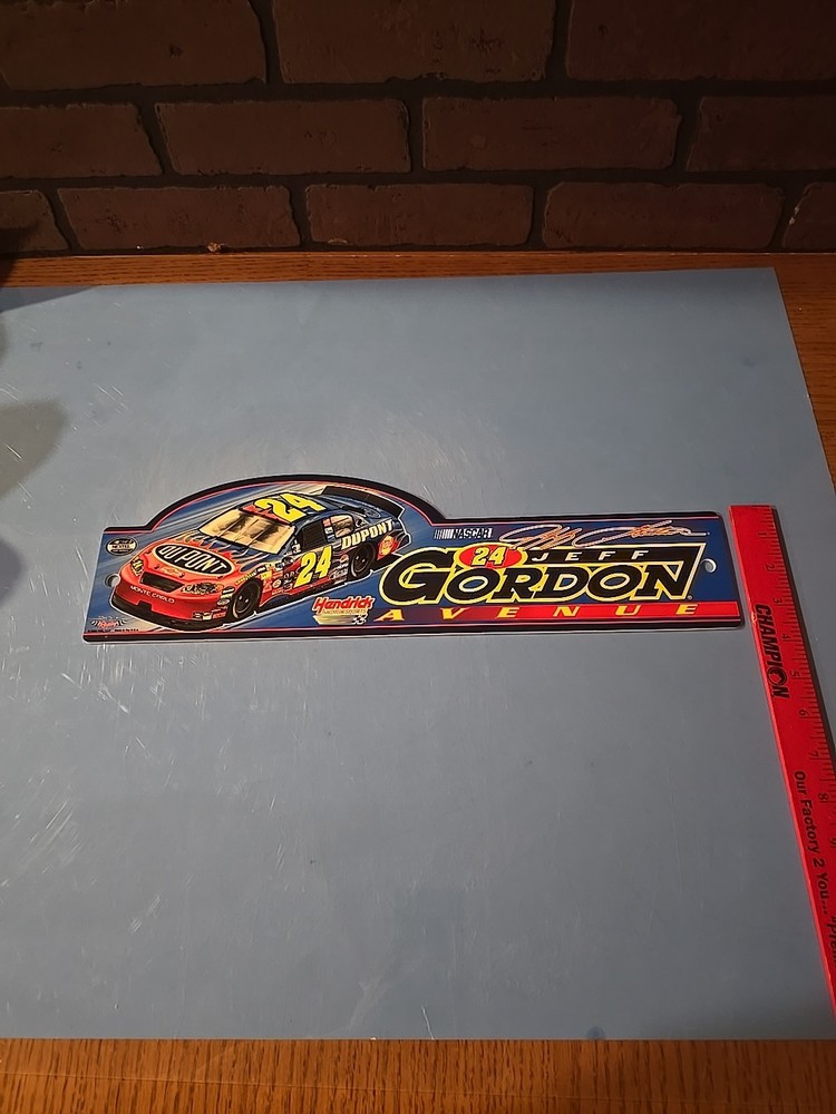 The Nascar Jeff Gordon #24 Street Sign by WinCraft is an officially licensed product featuring the legendary driver Jeff Gordon and his familiar number 24. This 17 5 x 3 sign is perfect for fans of auto racing, specifically NASCAR, and it proudly displays the team logo of Hendrick Motorsports. Additionally, the sign can be a great addition to any fan's collection of racing memorabilia, making it a must-have for Jeff Gordon enthusiasts.