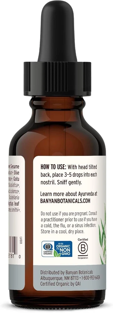 IN AYURVEDA, NASYA OIL is considered one of the most important holistic self-care practices to promote clear breathing, encourage internal detoxification, and combat nasal dryness. The practice of nasya helps to lubricate the nasal passages and clear the sinuses.* THE NOSE IS CONSIDERED a doorway to consciousness. It is the entrance for prana, the vital life force, which comes into the body through the breath. Healthy, uncongested breathing ensures proper flow of prana throughout the head and body, and the administration of this natural nasal cleaner can promote a sense of clarity and calm.* NASYA OIL SOOTHES and protects the nasal passages while nourishing the tissues. As a daily nasal moisturizer, nasya helps release tension in the head and relieve accumulated stress. Nasya Oil is also traditionally used to support vision and improve the quality of the voice.* BANYAN BOTANICALS is committed to producing the highest quality Ayurvedic products using USDA certified organic herbs that are sustainably sourced and fairly traded. All our products are 3rd party tested to ensure product quality and safety. THE BANYAN GUARANTEE: If for any reason you’re not satisfied with one of our products, we will gladly accept returns for a full product refund. Product Description