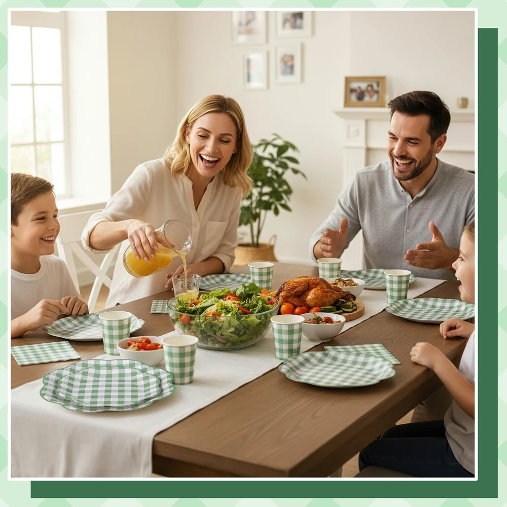 Specifications Sage Green Gingham Plates Set Material: Thick paper Quantity: 250 Pcs Sage Green Gingham Plates Size:9 and 7 inches plates Features 1.Party plates come in sage green plaid design with exquisite curling design, napkins and cups are designed in the same color. Fresh sage green can add an elegant and sophisticated touch to your party decor 2. Sage green paper plates and napkins party supplies set are disposable, you can throw them into the trash after the party, simple and convenient, so you can enjoy more chatting time with your gusts and family without spending too much energy and time on cleaning up 3.These sage green plaid picnic party paper plates and cocktail napkins set are versatile, such as baby shower, wedding ceremonies, Bridal shower ,graduation,family gatherings, celebrations, birthday party , anniversary parties, other special events Package Includes: 50 Pcs 9 Inch Green Gingham Plates, 50 Pcs 7 Inch Green Gingham Paper Plates, 100 Pcs Cocktail Napkins, 50 Pcs 9oz Paper Cups Package Includes:You will get 50 pcs 9 inch green gingham plates, 50 pcs 7 inch green gingham paper plates, 100 pcs cocktail napkins, 50 pcs 9oz paper cups. Enough for your daily life or party time Product Material:Green disposable plates napkins and cup are made of paper material, Each napkin has 2 layers. Surface of plates and cups are covered with a coated inside to prevent water leaking and oil penetrate Exquisite Design:Party plates come in sage green plaid design with exquisite curling design, napkins and cups are designed in the same color. Fresh sage green can add an elegant and sophisticated touch to your party decor Easy to Clean-up:Sage green paper plates and napkins party supplies set are disposable, you can throw them into the trash after the party, simple and convenient, so you can enjoy more chatting time with your gusts and family without spending too much energy and time on cleaning up Wide Application:These sage green plaid picnic party paper plates and cocktail napkins set are versatile, such as baby shower, wedding ceremonies, Bridal shower ,graduation,family gatherings, celebrations, birthday party , anniversary parties, other special events