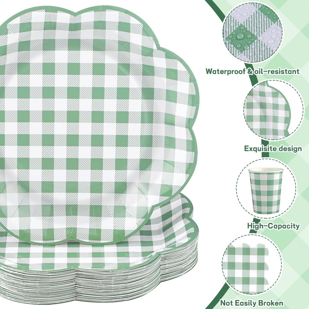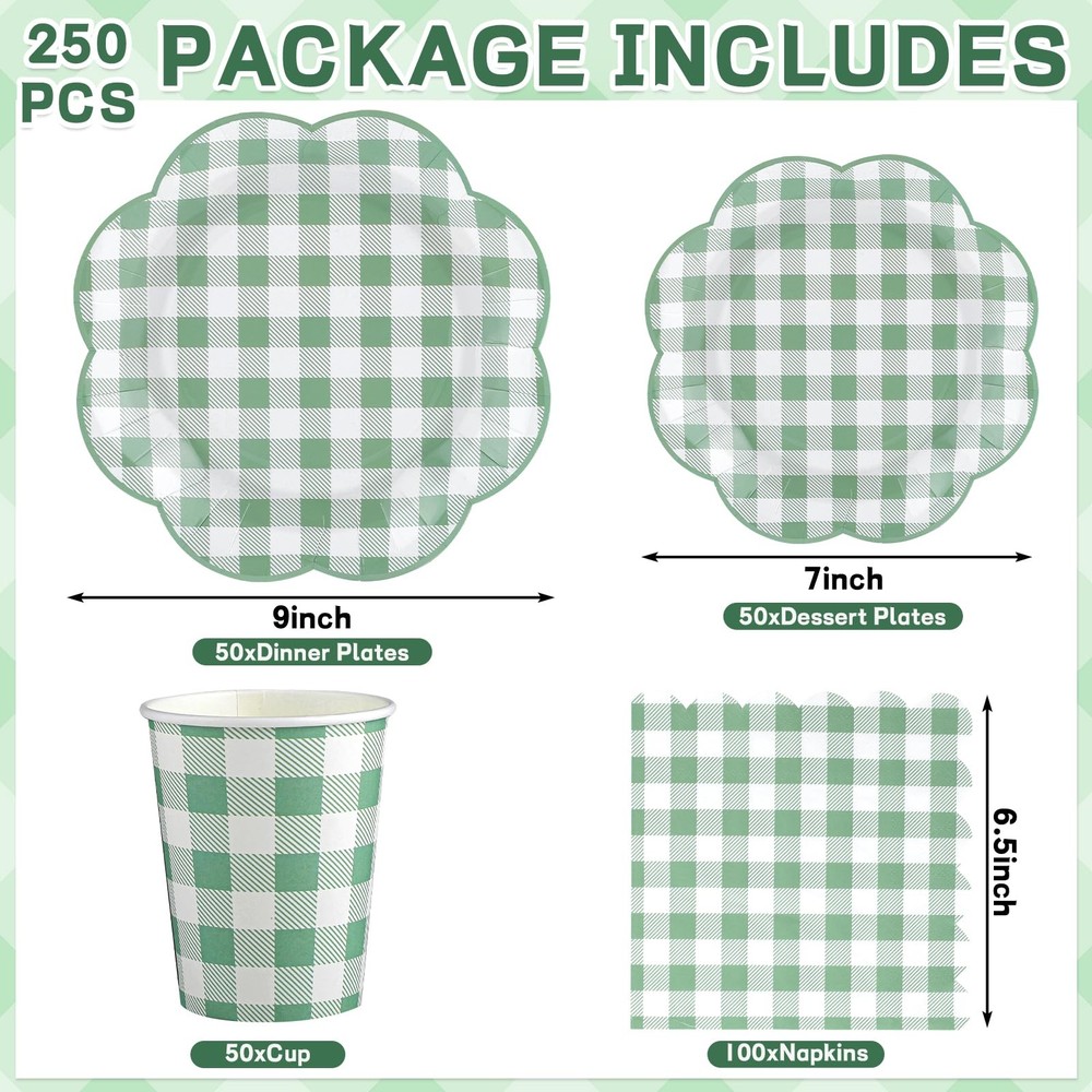 NatNarr 250 Pcs Sage Green Gingham Plates and Napkins, Scalloped Green and Wh...
