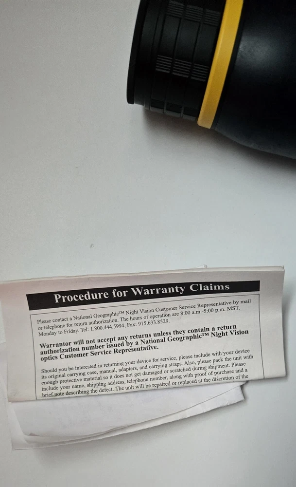 National Geographic Night Vision Elite Edition. Condition is Pre-owned good works as it should shows wear from normal use. Batteries not included. Battery Compartment shows Battery leakage cleaned best i could can be better. Tested works as it should. Manual has rip on back page. Please look at all the pictures carefully for more detail. So please If you have any questions feel free to contact me. Please note that if you are buying from outside the United States your country might charge fees that you are responsible for and Any orders shipped using Forwarding Services and shipped out of the country do so at their own risk, these services can inadequately repack the product resulting in damage. Ebay now handles all sales tax, If you reside in a state that requires it, Ebay will include it during checkout. There is nothing I can do to change this. I will only ship to the address on file in the US and a signature will be required at delivery if the sale is valued at over $250. Store terms, policies & disclaimer: All pre-owned, used, new-old-stock, vintage and electronic items are sold as-described, as-is, as-pictured and within their proper category. Items that cannot be fully tested or that may have full or partial functionality may be sold within the "for parts or not working' category yet may be fully-functional. All new items are sold as new. Buyer pays return shipping on any and all returns (if granted) and no partial refunds will be granted, without exception. I inspect, test where applicable and describe items to the fullest extent of my ability. There are no guarantees implicit or otherwise regarding the purchase, use, disposal, functionality and/or viability of pre-owned, used, vintage and/or electronic items unless otherwise noted. There may be dust and/or typical wear for age on items. Please ask any and all questions before purchase. Combined shipping only if buyer communicates desire before bidding or purchase and the listings end within 24 hours of each other. Please do not request to adjust "lots". Please bid or purchase responsibly and only if funds are immediately available (no 'layaway'). Do not withdraw bids without valid explanation: you will be blocked from any further bidding and purchases. eBay automatically opens an Unpaid Item Reminder Case in two days if unpaid, thus it is the buyer's responsibility to communicate payment delays and issues promptly. A 15% restocking fee will be deducted from the final purchase price of any item returned for a refund contrary to the stated return policy. Please contact me directly first via the "other" option on the "contact seller" page to resolve issues before opening a case or remitting feedback if there is any issue or concern with any item. Not doing so will void any return process, impact the ability for future purchases and affect the resolution of any case opened and/or negative feedback. By bidding upon or buying my items, the buyer agrees to and understands these terms, policies and disclaimer. Please review my positive feedback from all of my satisfied clients. Any reasonable offers will be considered. Thank-you!