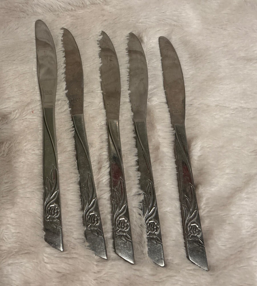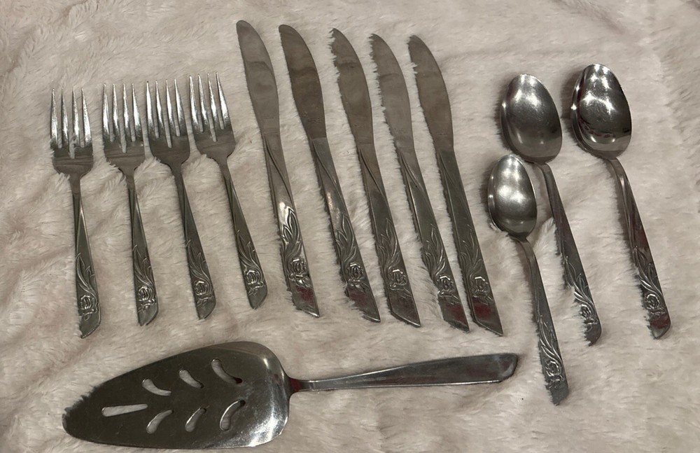 There are 4 salad forks. 1 pie server. 5 knives. 1 teaspoon and 2 tablespoons. Carlyle rose is the pattern from N.S.C.O from Japan stainless steel