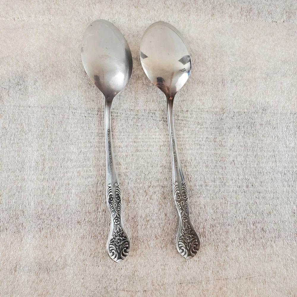 National Stainless NST2 ~ Set of 2 Soup Spoons 7 3/8" ~ Stainless Steel Flatware These pieces are in Used Condition. There are some light marks, scuffs, nicks and surface scratches consistent with age and use. *Please note there is a difference in the glossiness of the bowls. One is more glossy and the other has more of a brushed look.* Please view the photos carefully for condition details. Don't forget to check out the other items in my shop. I'm getting in new fun things all the time. Thank you for looking! Have a great day!