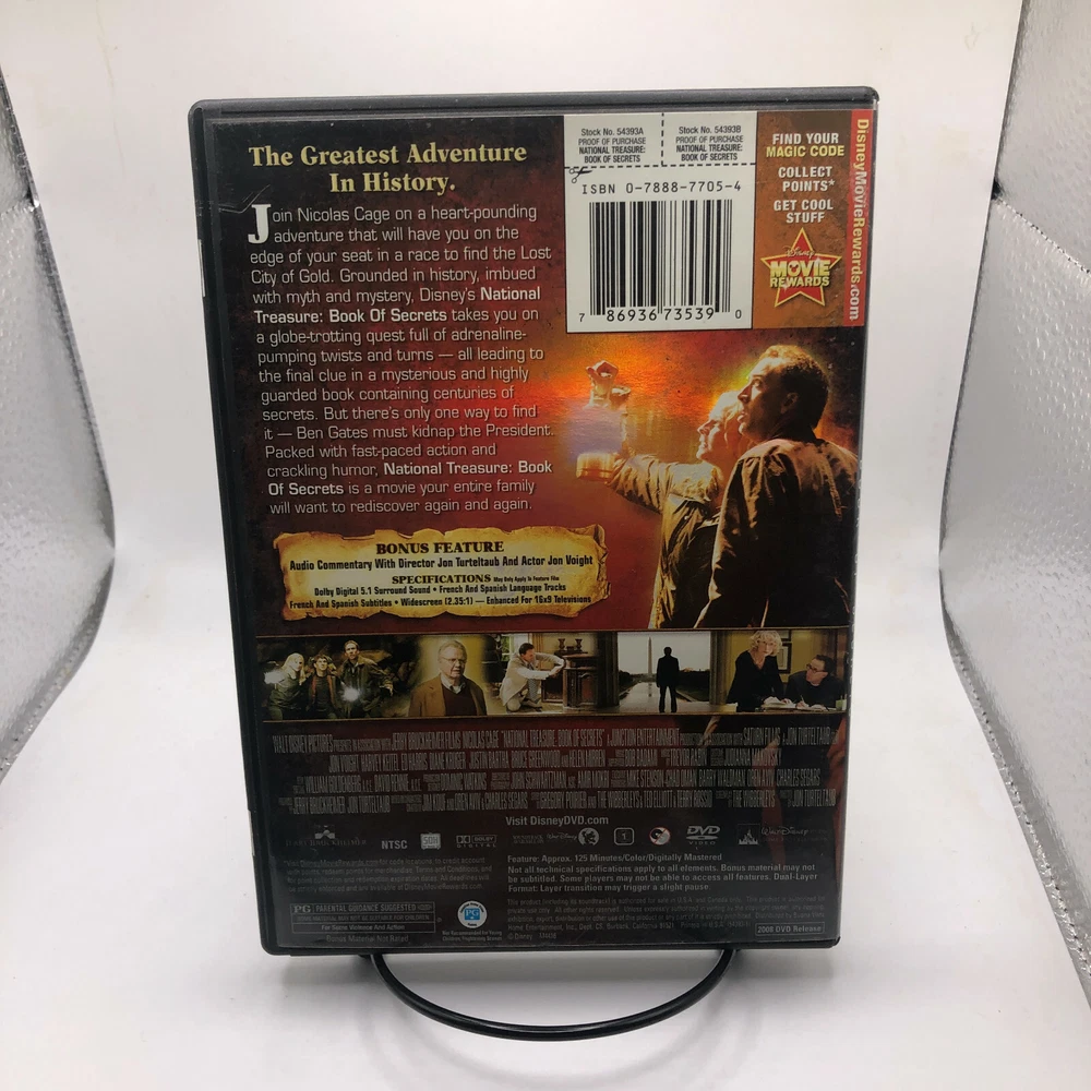 Director: Jon Turteltaub Country/Region of Manufacture: United States Subtitle Language: French, Spanish Run Time: 125 min. Rating: PG Studio: Disney gtin13: 0786936735390 UPC: 0786936735390 Language: English, French, Spanish Actor: Nicolas Cage, Ed Harris Type: Movie Movie/TV Title: National Treasure 2: Book of Secrets Format: DVD Genre: Action & Adventure Seller Notes: “Please see photos. All USED Movies will have some minor scratches and blemishes on cases.” Release Year: 2007 Producer: Brandon Vietti, Greg Weisman, Jerry Bruckheimer, Jon Turteltaub, Missy Papageorge