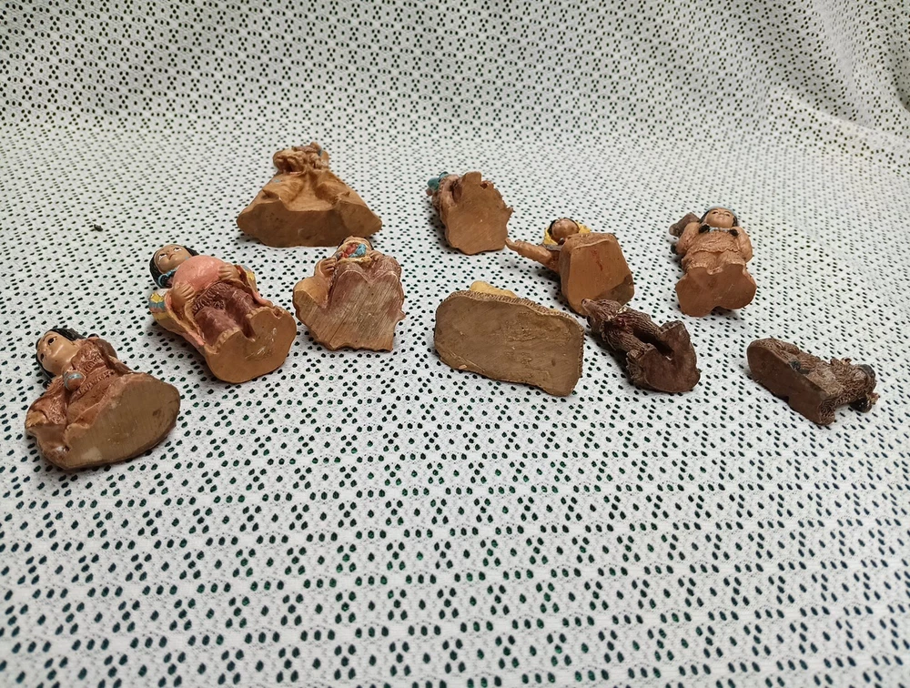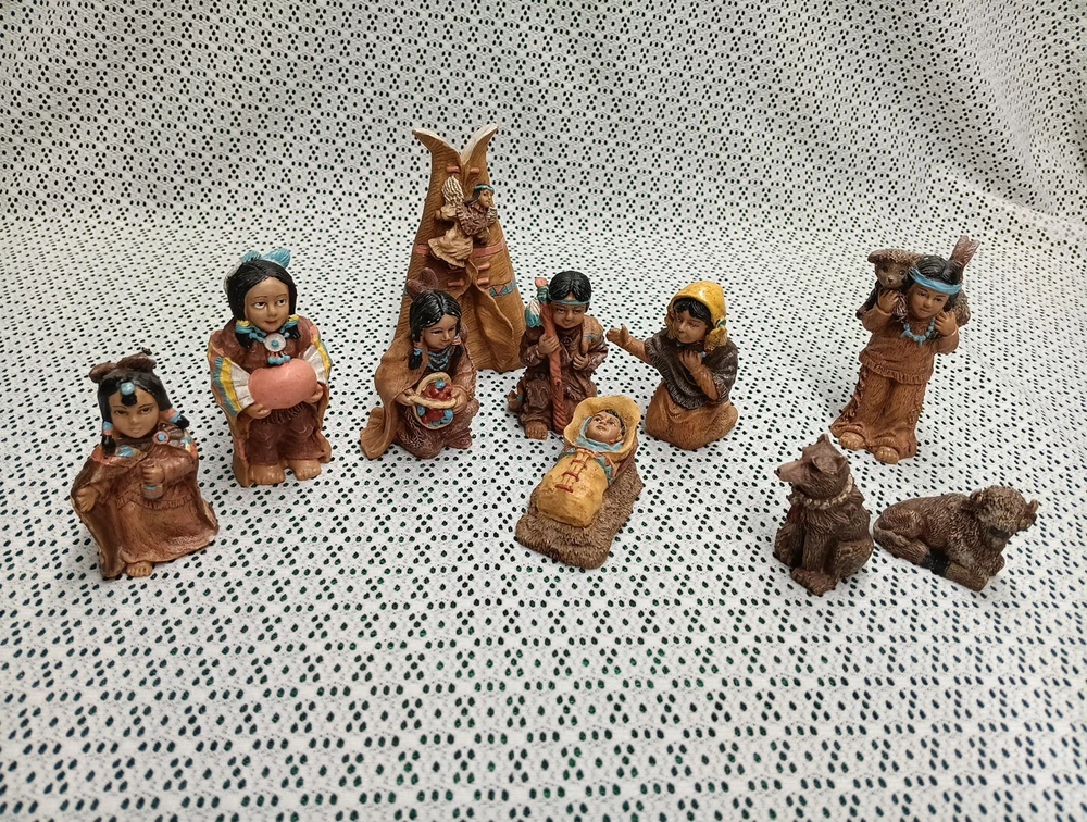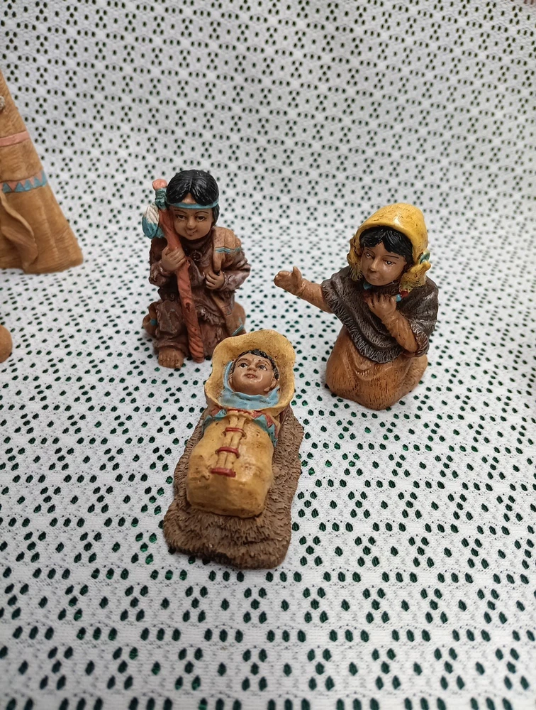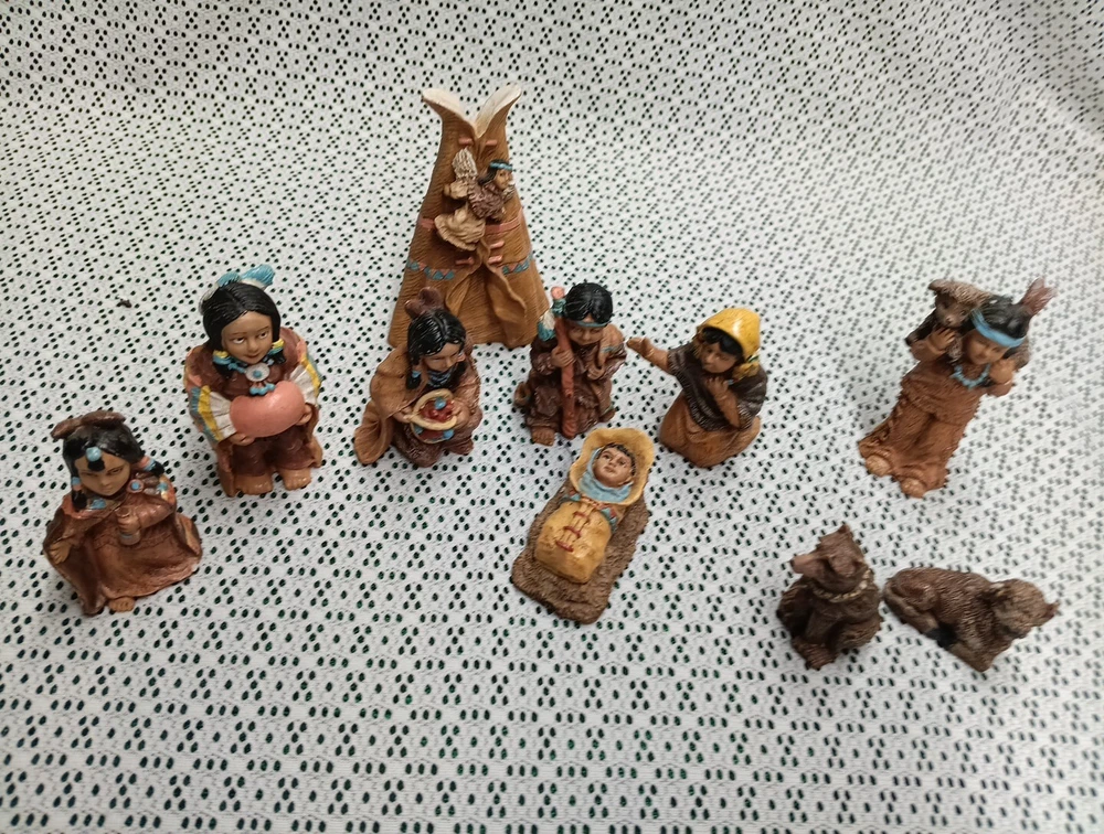 Native American Indian Nativity Set 10 Pieces w/Teepee and Animals. Vary from 2 to 3.5 inches. Touched up chip about the size of a green pea.