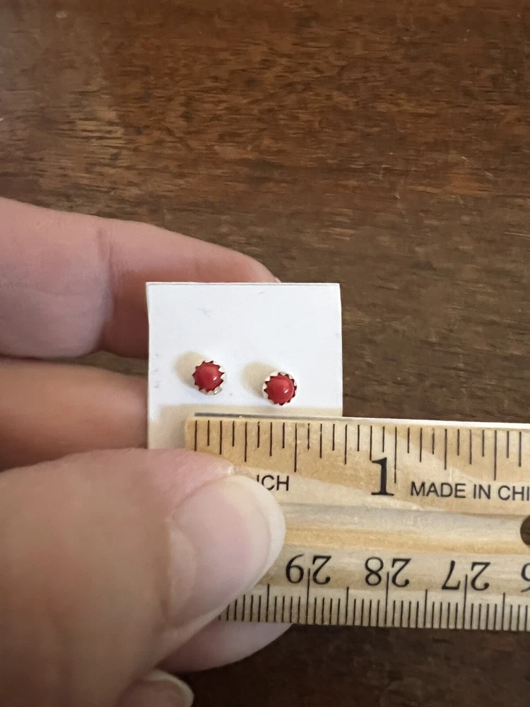 This is a wonderful Navajo made sterling silver red coral stud earrings they are about 1/8 inch wide please check our my other Native American made auctions shipping is 4.60 anywhere in the USA and I do combine shipping 1.00 more for each additional shipping overseas ebay global shipping if you have any other questions please ask thank u
