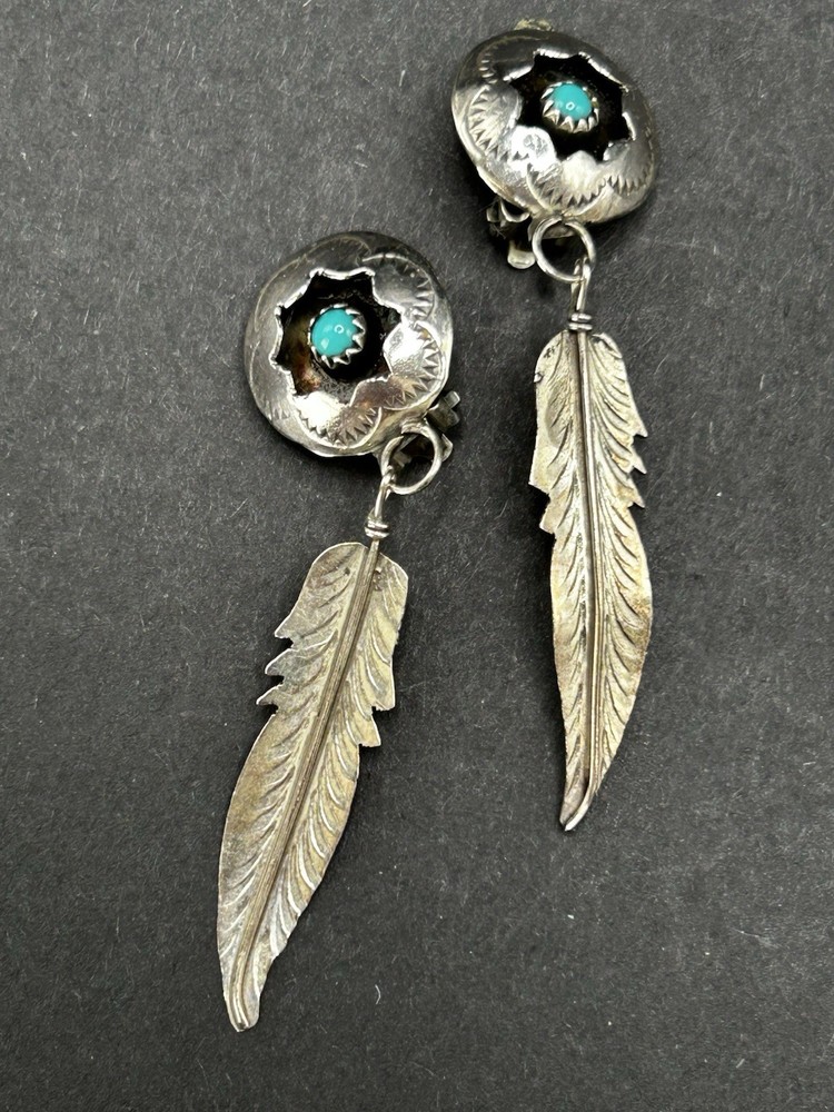 Native American Style Sterling Turquoise Feather Clip Back Earrings No marks Tested for sterling 2.25”