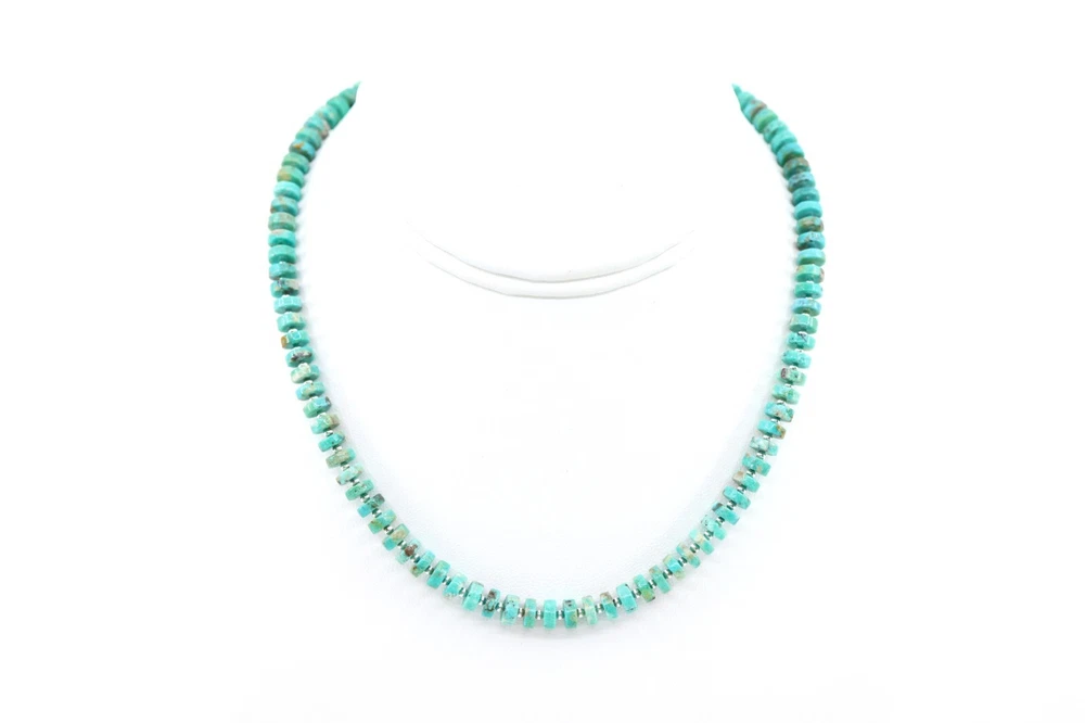 This modern heishi necklace features 6mm genuine Arizona turquoise beads, strung in a symmetrical, repeating pattern. Each bead is meticulously hand-selected for pure color, clean cuts, and uniformity in size, creating a refined yet free-spirited piece. Ideal for layering or wearing solo, this necklace blends modern minimalism with a Southwestern-inspired charm, perfect for both men and women. Inspired by traditional Native American dress, this necklace reflects the timeless beauty and intricate beadwork of Southwestern culture. The striking blue green turquoise beads add a captivating allure, making this piece a standout addition to any jewelry collection. This necklace can be worn alone or paired with your other favorite jewelry for a layered look. Origin & Metaphysical Properties: Mined in Arizona, USA, this turquoise is valued for its pure greenish-blue color and minimal matrix. Known for its protective and calming energy, turquoise is believed to promote inner peace, self-confidence, and harmonious communication. Bead Size: 6mm Color: Blue Green Metal: Sterling Silver Styling: Unisex styling, suitable for any gender; a thoughtful gift Necklace Length: Available in lengths from 14"-28"; please select from the dropdown menu Packaging: Ready for gift-giving Processing Time: Ships within 3 days of payment U.S. Shipping: Shipped via USPS 1st Class Mail, with an estimated delivery time of 2-4 business days (range: 2-9 days). International Shipping: Shipped via USPS 1st Class International Mail, with typical delivery between 10-21 business days. Origin & Metaphysical Properties: Sourced from Arizona, USA, this turquoise is prized for its vibrant greenish-blue color and minimal matrix. Known as a purification stone, it symbolizes serenity, protection, and self-confidence.