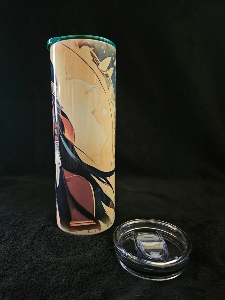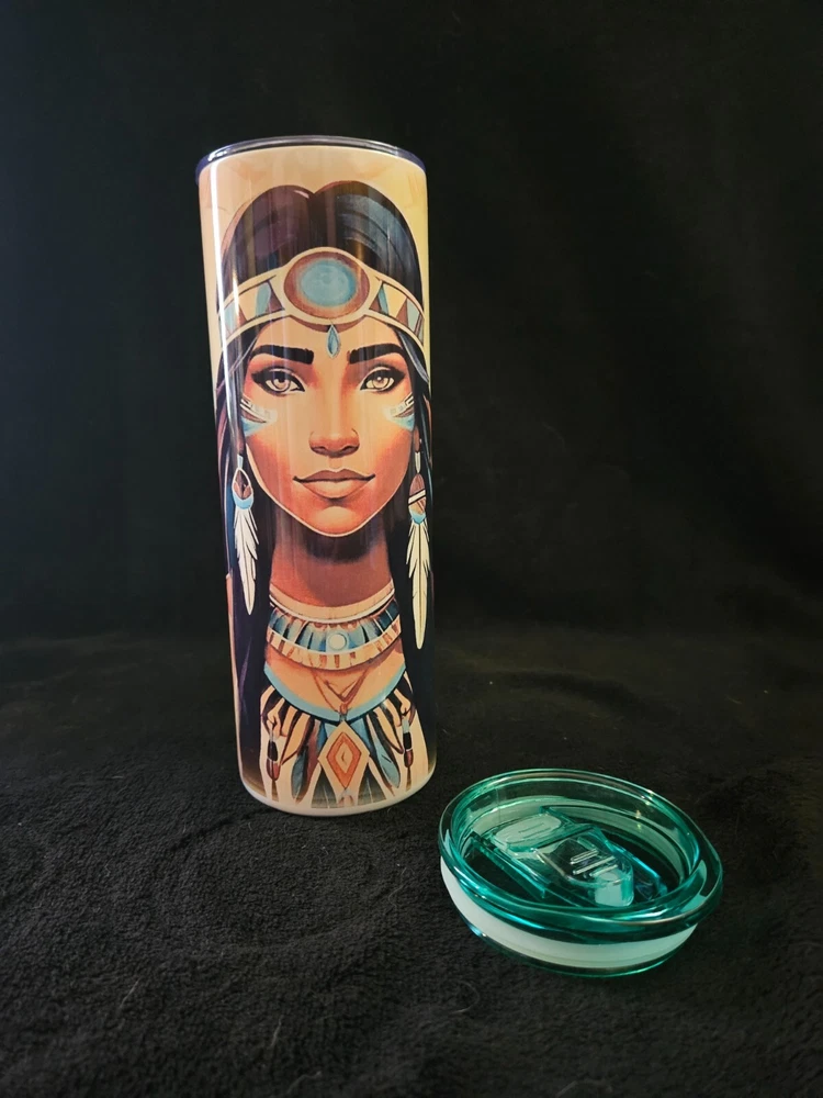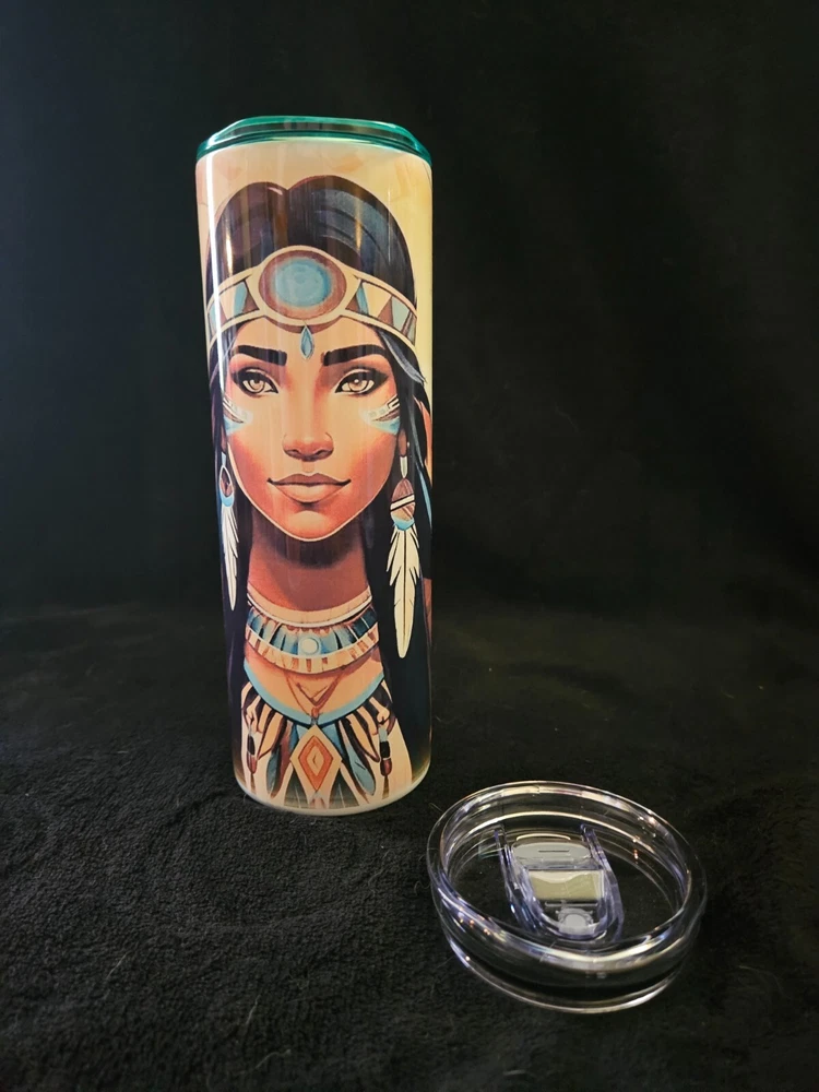 20oz Stainless Steel Tumbler W/ Colored Lid (plastic straw included) Featuring a Native Indian design