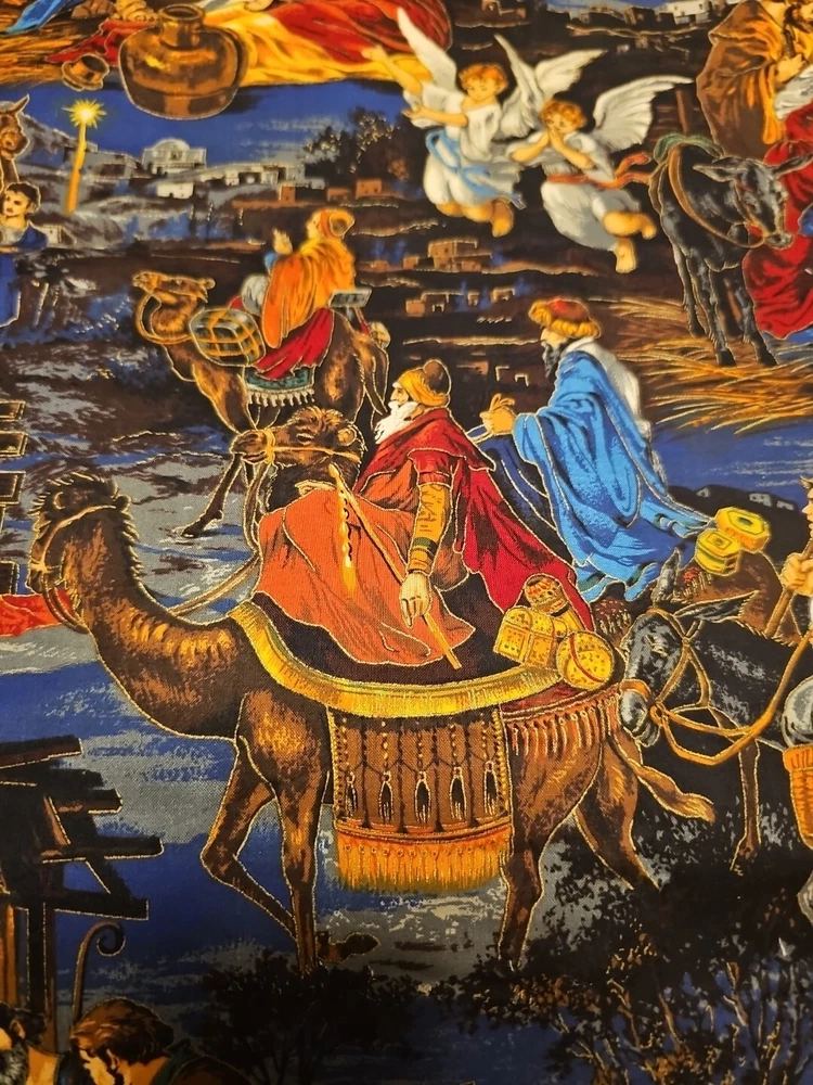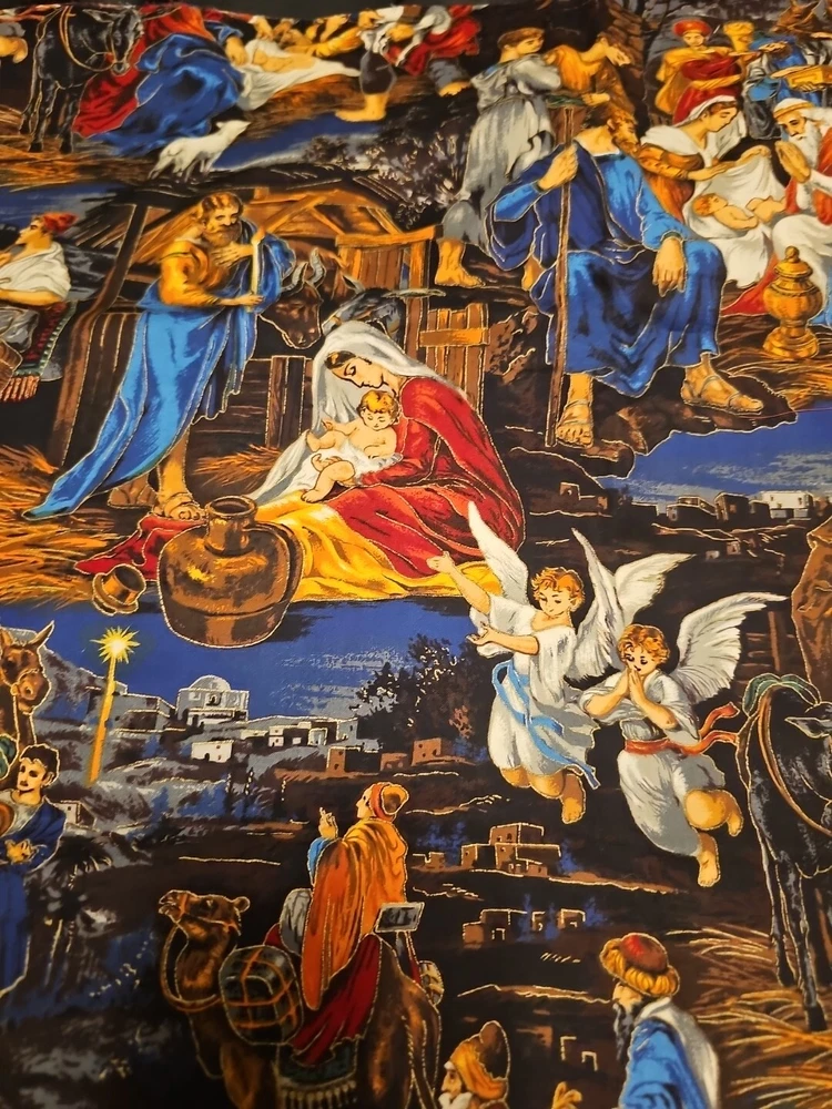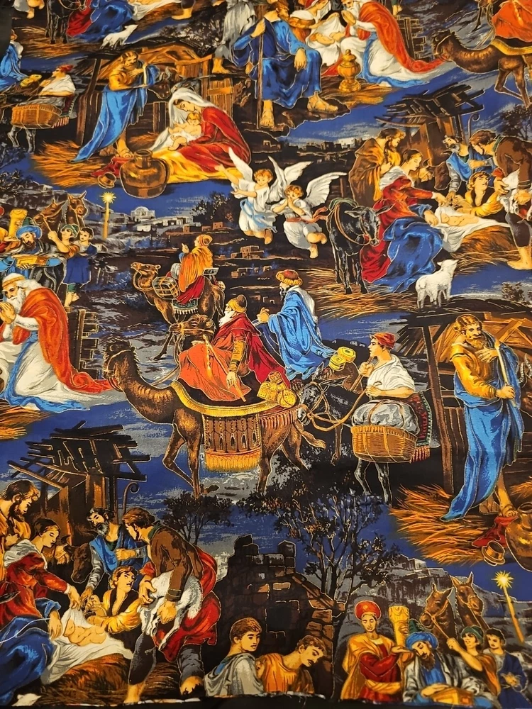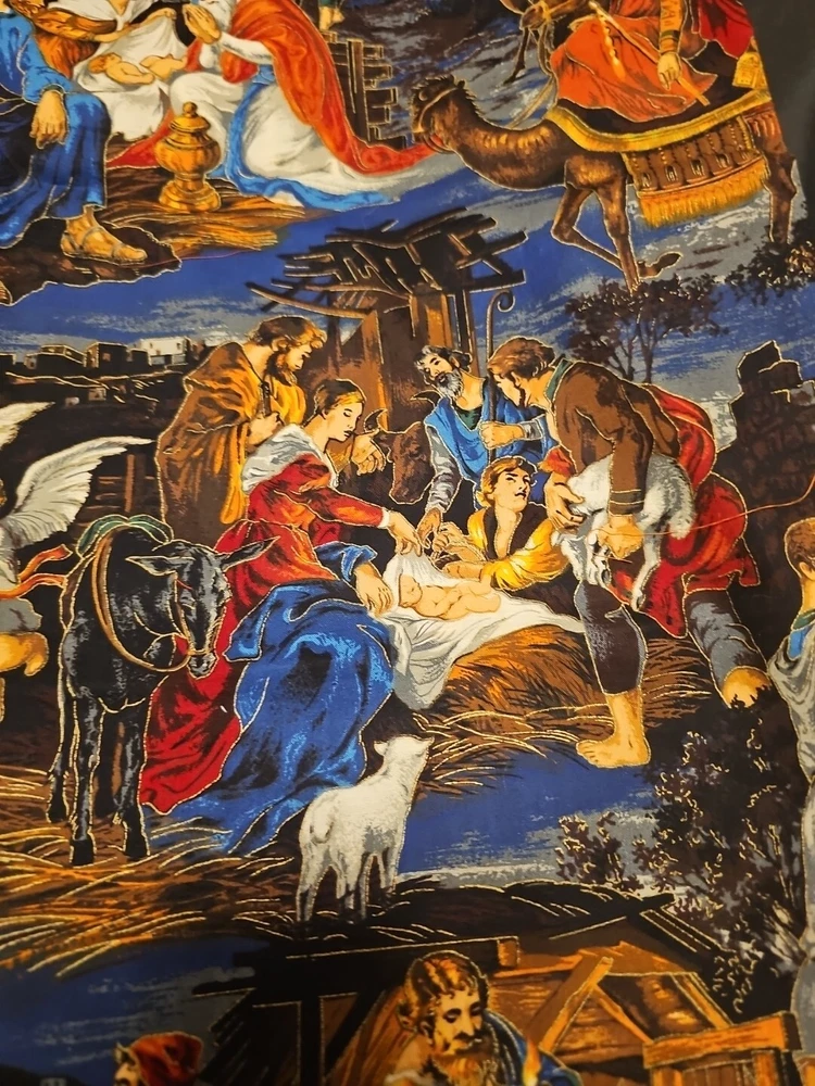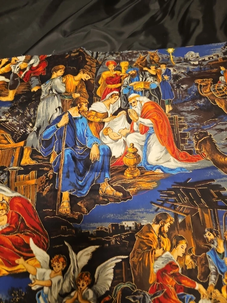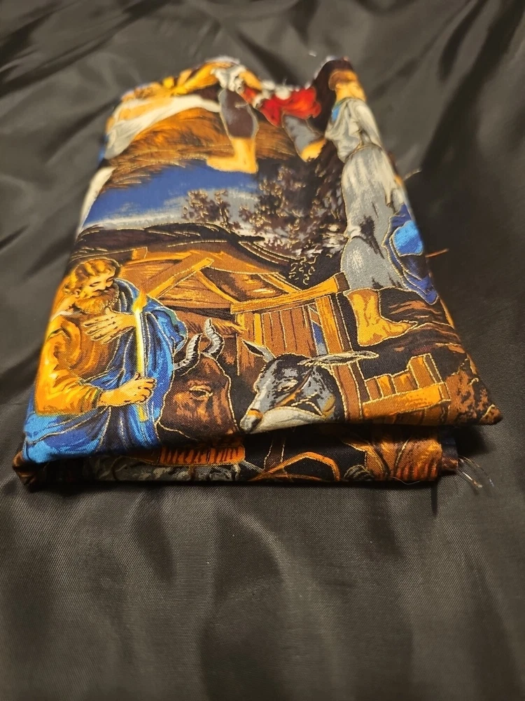 Nativity scene measures 27" x 44" or 3/4 yard. Smoke free home, thanks for looking! This beautiful fabric features a nativity print and is perfect for all your holiday crafting needs. It is made of a cotton blend material and has a medium fabric weight.