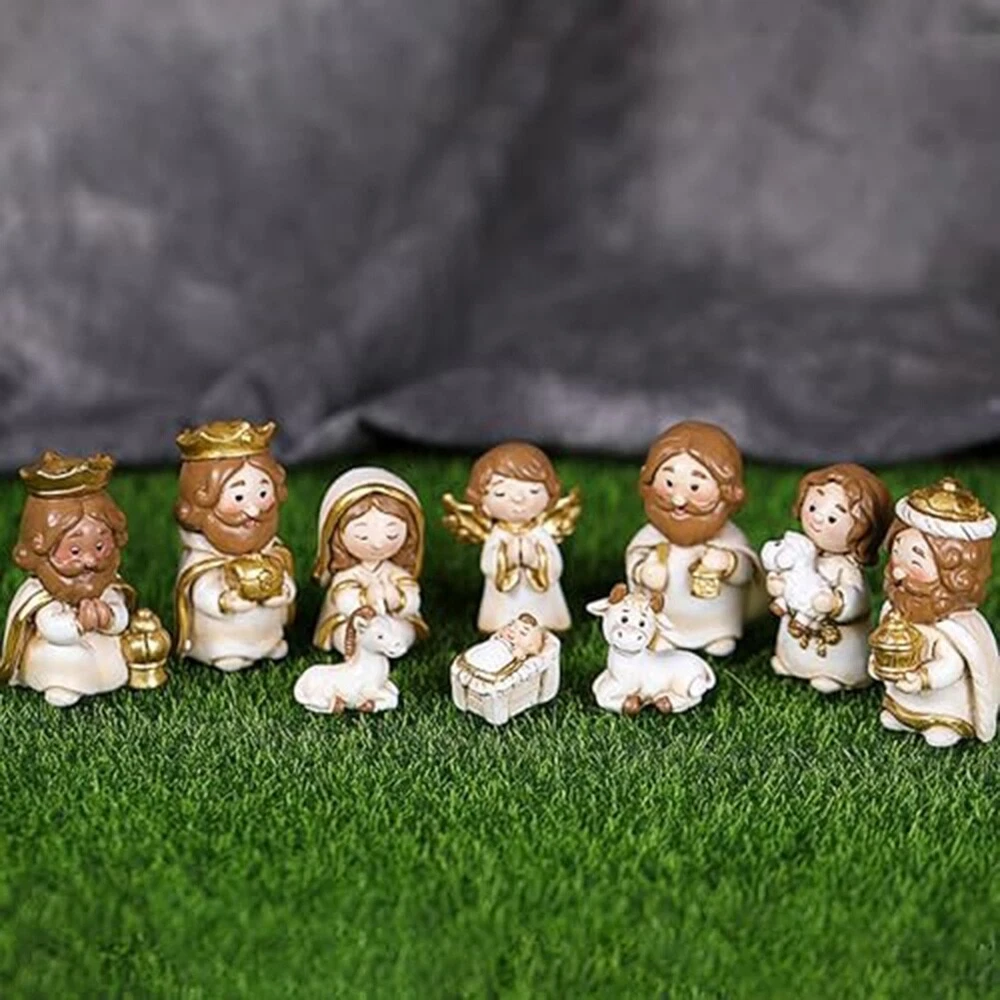 Nativity Set Version - 10 Piece Religious Manger Scene Resin Cute Version7333 : This little navity set is absolutely adorable. The cute disign attract children. Many children full in love with it. Craftsmanship: pure handmade works, using high-grade resin in the industry as raw materials, paying attention to details, handmade mini style, very suitable for children to learn the story of Jesus. Applicable places: It can be placed in gardens, lawns, churches, and can be well integrated with the environment. It is a decoration. It can be used as a home altar, art collection or gift, it is a good choice. In terms of design: the design of this product has a childlike atmosphere. The Q-version design allows children to better learn the knowledge of Jesus. Press the angel to listen to music. The size design is for children. Meaning: Ornaments are used to decorate homes and gifts during Christmas to celebrate the birth of . It is presented in a lovely and sophisticated way, allowing people to on the Christian faith during celebrations. Material: Resin colour: As Shown Package Contents: 10 x Decorations 1 x base