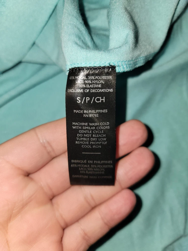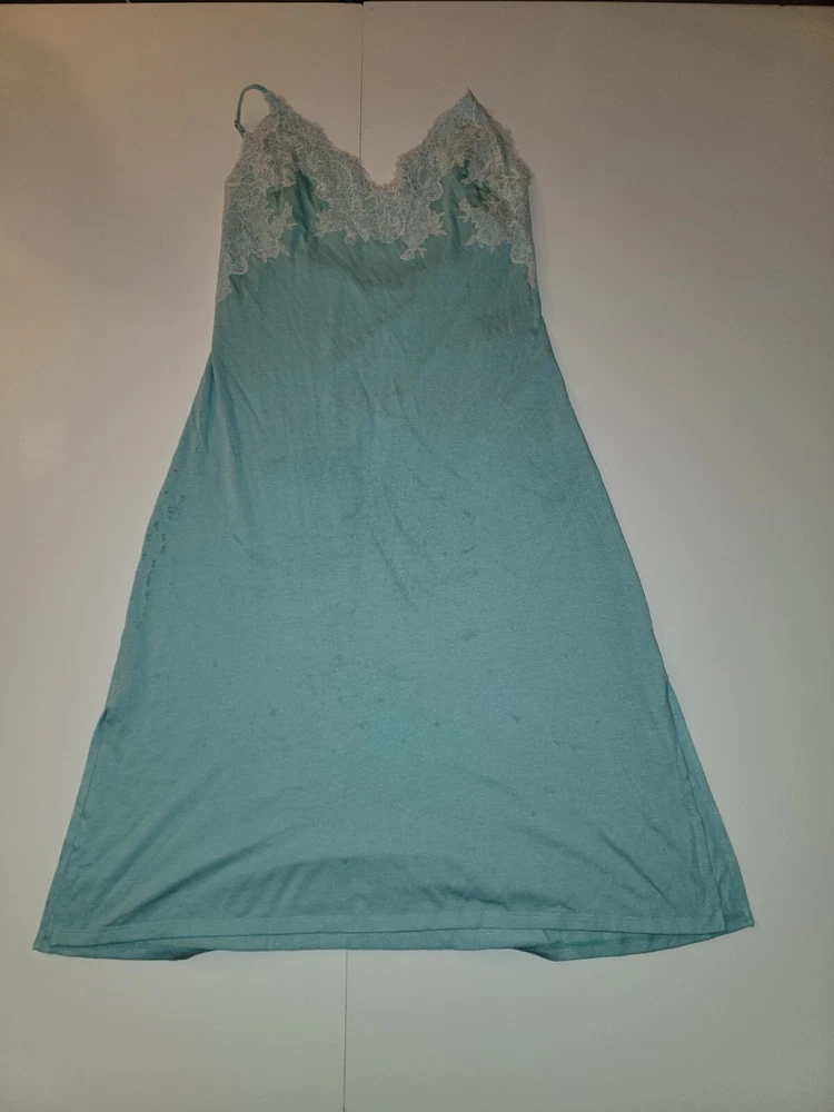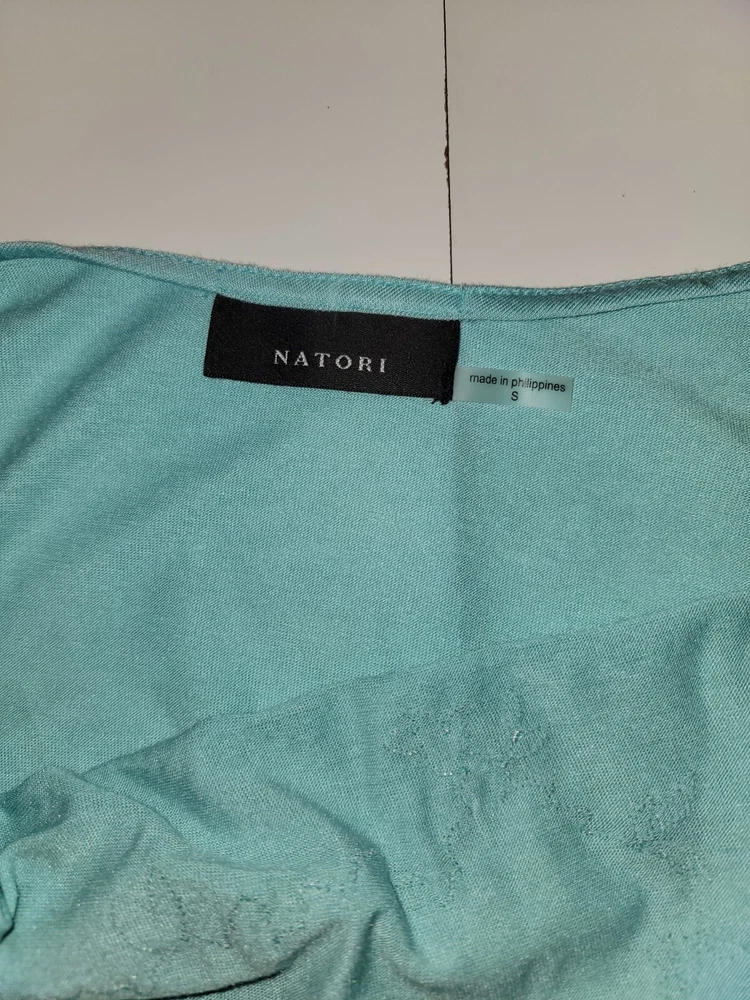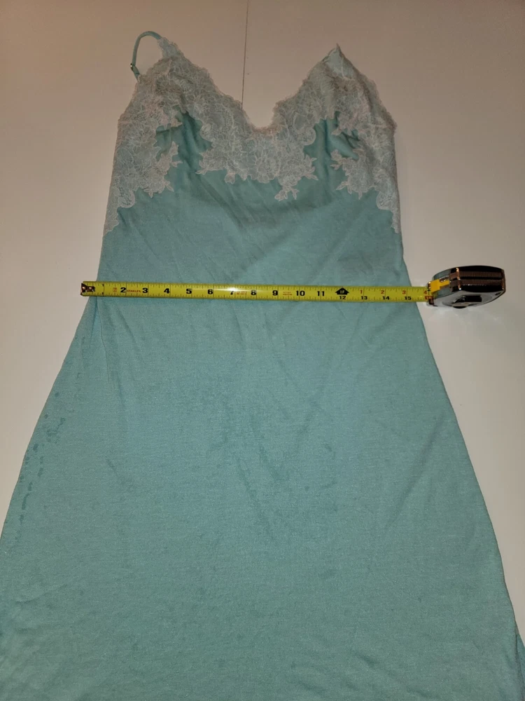 This is a Natori nightgown in size Small, featuring spaghetti straps and lace detailing. It is a sleeveless pullover gown in a light blue color, made of a blend of polyester, nylon, elastane, and modal. The gown has a lightweight feel, perfect for summer and spring seasons. It comes in a set of two units.