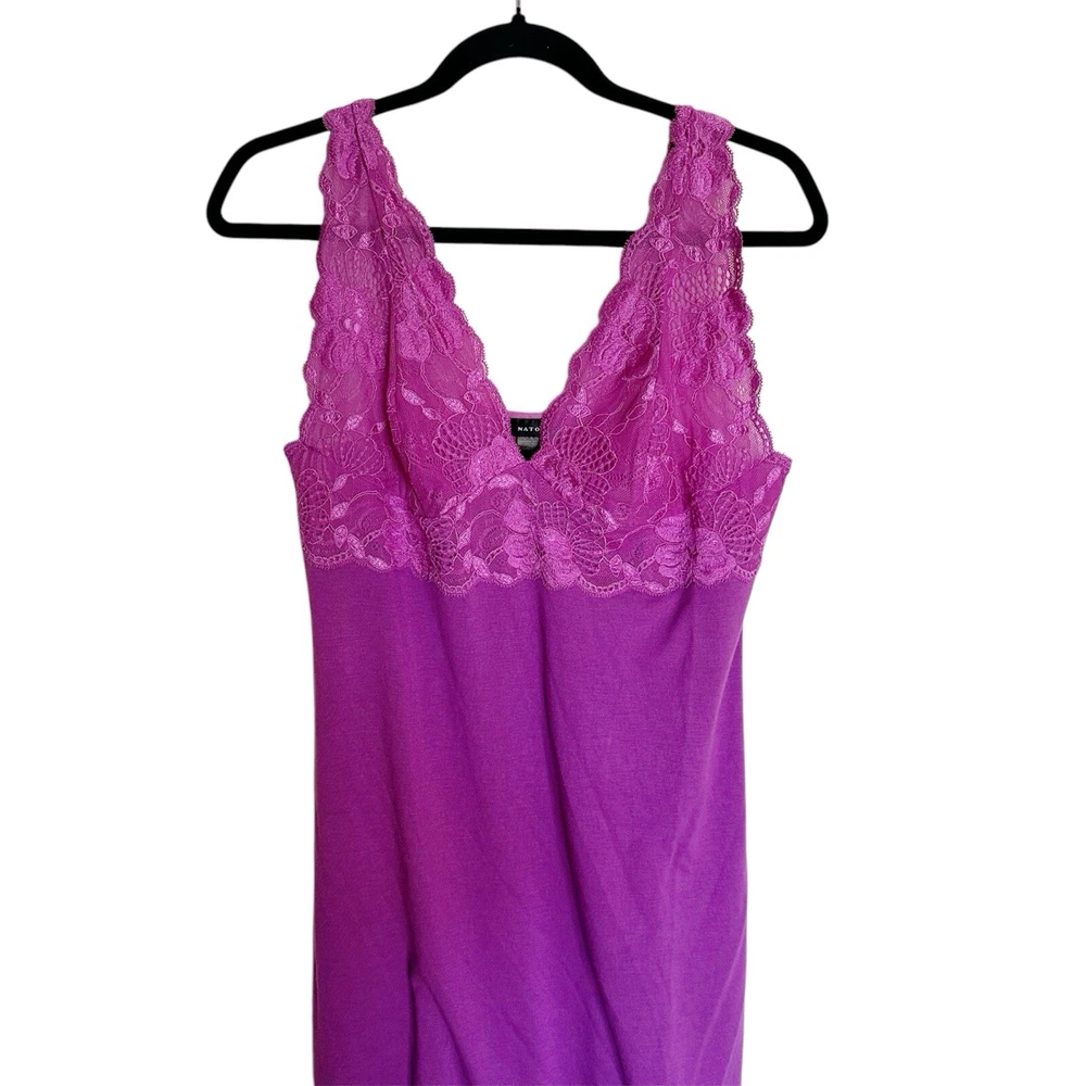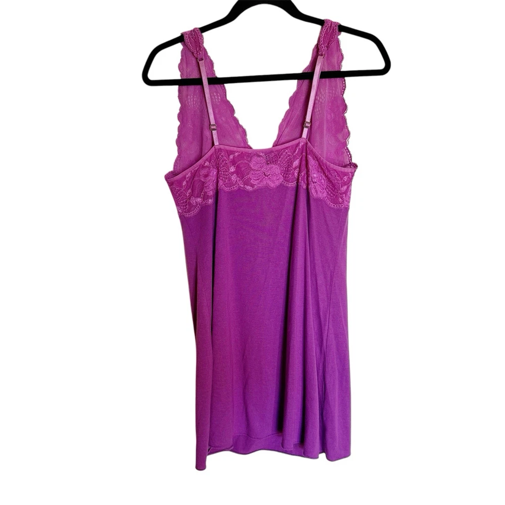 Elevate your nighttime attire with the Natori ZEN Soft Modal Lace Magenta Purple Babydoll Chemise Slip Dress Nightie. Designed with a commitment to comfort and style, this dress features a lightweight modal fabric, adorned with delicate lace that adds a touch of romance to your sleepwear collection. Its adjustable straps ensure a perfect fit for a size small, while the V-neckline complements the overall elegance. The solid purple hue exudes a calming, yet feminine vibe, making it an ideal choice for a relaxing night's sleep or a cozy morning brunch. The dress's babydoll style is a timeless piece that pairs effortlessly with your favorite robes or slippers. Whether it's for intimate evenings or lazy weekend mornings, this Natori dress promises both comfort and style.
