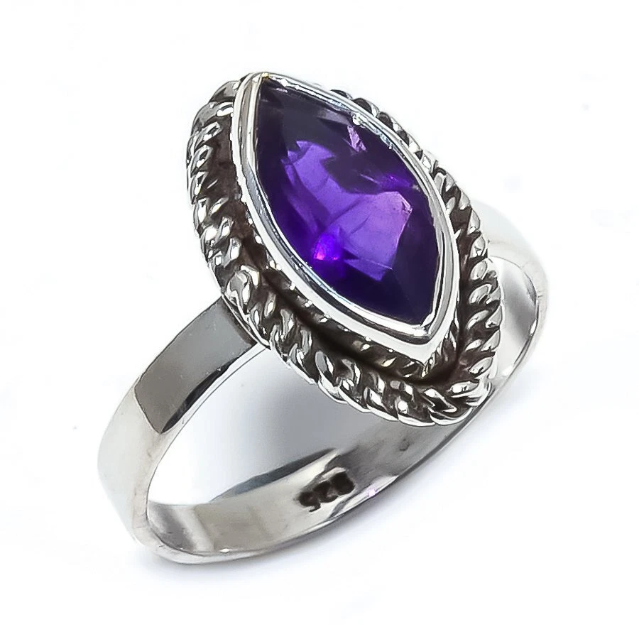 Gemstone Clarity Grade: Eye Clean Color: Purple Secondary Stone: No Stone Era: Undated Shape: Same As Picture Style: Band, Charm Diamond Clarity Grade: Not Applicable Weight: 2.7 gm Main Stone Size: 6X12mm Metal: Sterling Silver Theme: Beauty, Beach, Family & Friends, Love gtin13: does not apply Number of Diamonds: 0 Main Stone Color: Purple ProductName: Ring Material: Stone, Gemstone Wholesale: Yes Country/Region of Manufacture: India Certification: Yes Features: Adjustable, Engraved, Stackable Colored Diamond Intensity: Not Applicable Stone-Size: 6X12mm Signed: Yes Cut Grade: Fair Occasion: Anniversary, Birthday, Christmas, Engagement, Valentine's Day, Wedding, Mother's Day Customized: No UPC: does not apply Country of Origin: India Ring Size: 6 Brand: Unbranded Main Stone Shape: Same As Picture Number of Gemstones: 1 Main Stone Creation: Natural Handmade: Yes Metal Purity: 925 Base Metal: Silver Sizable: No Band Width: 2 mm Diamond Color Grade: Not Applicable Total Carat Weight: 50 Carat Above Type: Ring Main Stone: Amethyst Setting Style: Channel-Set Main Stone Treatment: Not Enhanced Collection: Brand New