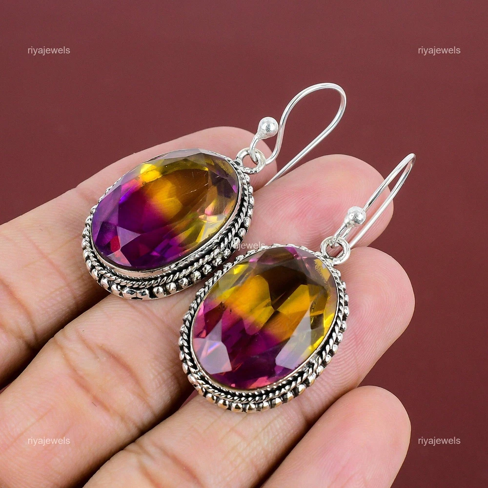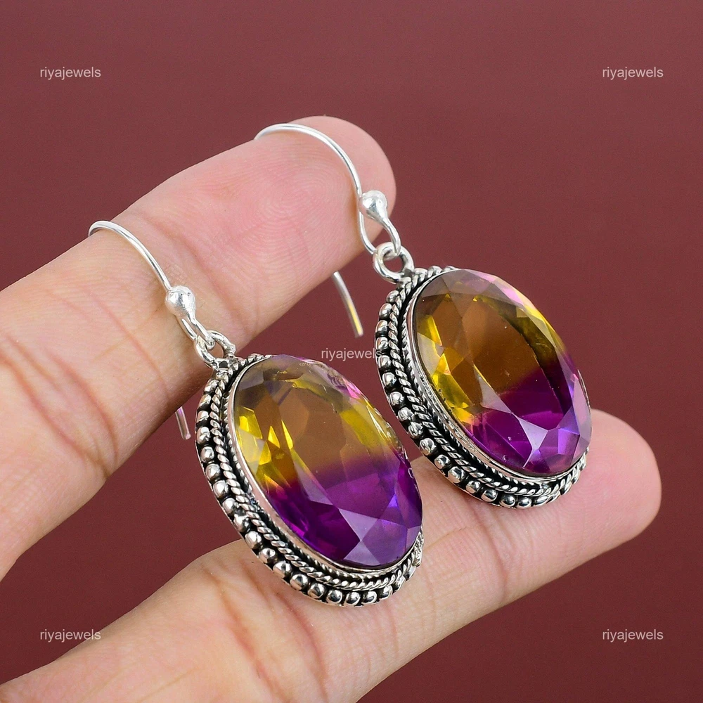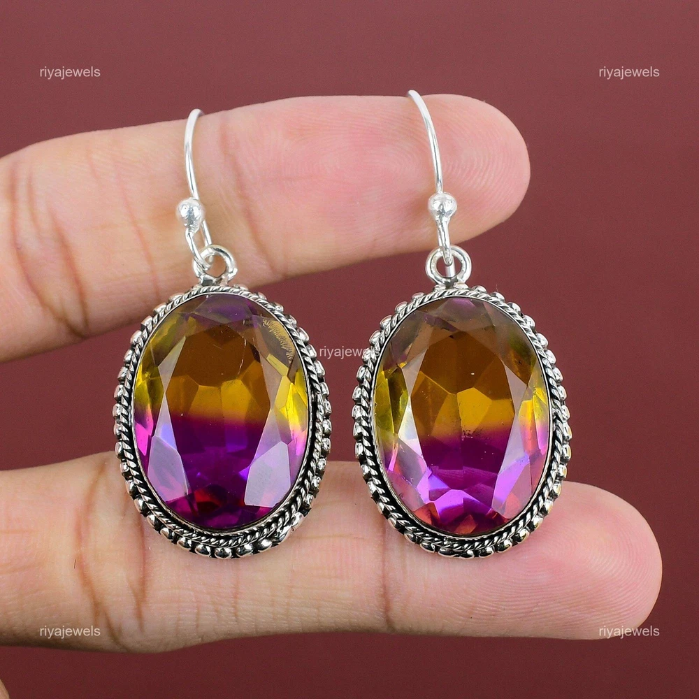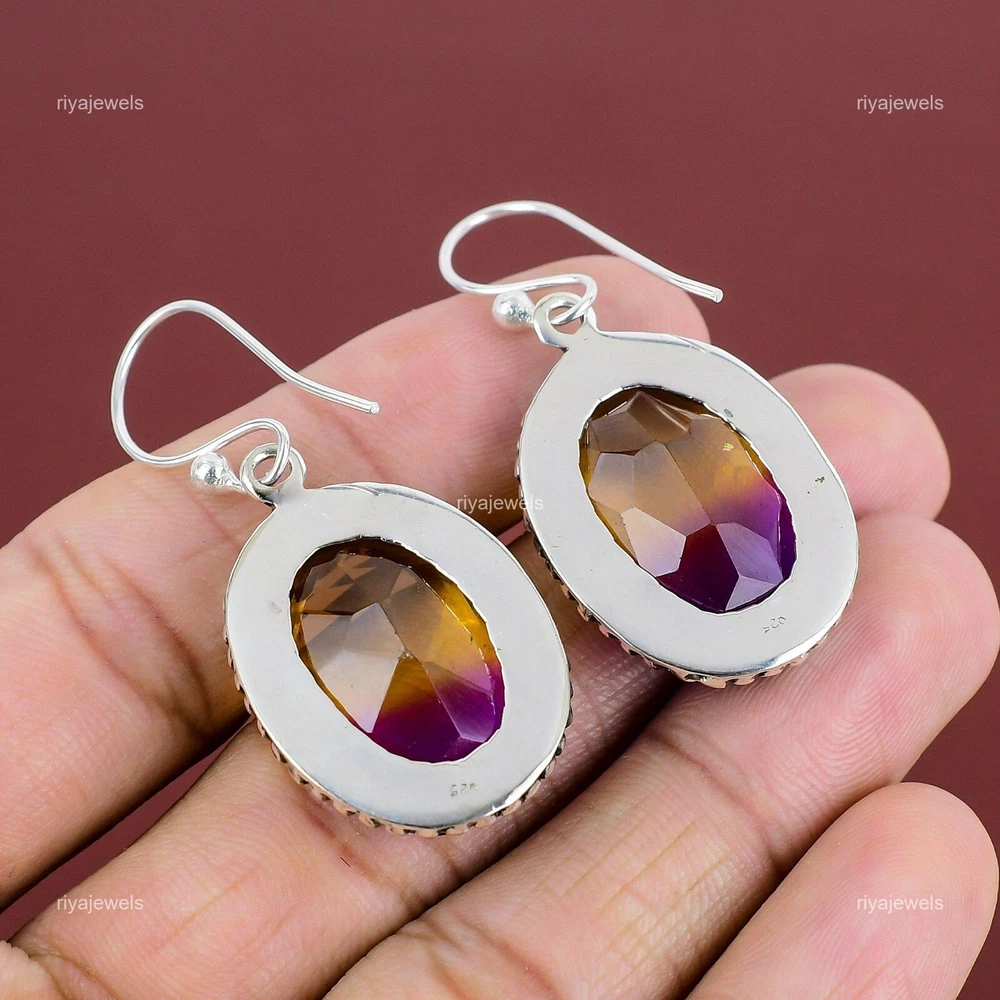 Note : Due to the natural formation of this gemstone. Slight variation in design and color are to be expected. Welcome to Riyajewels Natural Ametrine Gemstone 925 Silver Drop/Dangle Vintage Earrings For Girls Handmade Earrings, Sterling Silver Earrings, Ametrine Earrings, Handcrafted Earrings SKU : PE-1346 Gemstone : Ametrine Stone Shape : Oval Metal Purity : 925 Sterling Silver Length : 54 Millimetres Width : 24 Millimetres Silver Jewelry is a popular choice for many people due to its unique properties and numerous benefits. Here are some of the key properties and benefits of wearing silver jewelry: Properties: Durability: Silver is a durable metal that can withstand regular wear and tear. Malleability: Silver is highly malleable, which means it can be easily shaped and molded into various designs. Conductivity: Silver is an excellent conductor of heat and electricity. Anti-bacterial: Silver has natural anti-bacterial properties, which can help prevent the growth of harmful bacteria. Benefits: Aesthetic appeal: Silver jewelry is known for its beauty and versatility, and can be worn with a variety of outfits and styles. Hypoallergenic: Silver is generally hypoallergenic, which means it is unlikely to cause an allergic reaction in most people. Healing properties: Some people believe that wearing silver jewelry can help with various physical and emotional conditions, such as arthritis, anxiety, and depression. Spiritual significance: Silver has been used in various cultures for its spiritual and symbolic significance, and wearing silver jewelry can help to connect with these traditions. Investment value: Silver is a precious metal that retains its value over time, and investing in silver jewelry can be a smart financial decision. Overall, silver jewelry offers a unique combination of beauty, durability, and benefits, making it a popular choice for people around the world. For Mother's Day Gift For Father's Day Gift For Promise For Valentine' Day For Halloween Party For Christmas Day Gift For New Year Party For Mom For Her If you can't find the information you need or need some advice for your design? Feel free to contact us. We are fast to reply :) All our work is made by hand with Love and Care in our workshop Thank you so much for visiting and hope you enjoy shopping with us Riyajewels is dedicated to providing customers with high-quality sterling silver jewelry. As a manufacturer of handmade jewelry, we offer an extensive range of silver gemstone jewelry that demonstrates our exceptional craftsmanship. We are skilled in adorning gemstones to complement any style, and we give you the freedom to design your own jewelry collection with dazzling, natural, and genuine gemstones. Our talented craftsmen carefully handcraft each jewelry piece, ensuring that it is unique and made with authentic gemstones.