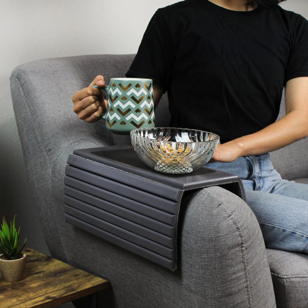 Wine, milk, and other liquids can stain and ruin your loveseats, couches, and recliners. Protect your sofas and add a wooden flair to your decor with the Gray-Colored Bamboo Armrest Table Arm Chair Tray. 0.70-inch thick segments easily mold to your square-edged armrests (not for rounded armrests). Black silicone section of the couch armchair table center provides an easy-to-reach surface for your drinks and plates. Anti-slip felt backing prevents accidental slippage of the arm rest end table. Each recliner arm table tray measures 16.5 by 13.12 inches while laying flat; the center measures 6 inches wide, and the ends that drape over your armrests each measure 7 inches. Smooth wooden surface has gray varnish to add to the decor of your living room, dorm room, and more. Warning: This product can expose you to chemicals which is [are] known to the State of California to cause cancer and birth defects or other reproductive harm. [Rest Your Beverage at Ease]: No need to worry about spilling your drinks on your loveseats, recliners, and couches with the Sofa Arm Table Tray Natural Bamboo in Gray Color; Couch tray will protect your sofa and provide an easy-to-reach holder for your drinks [No More Stains]: Arm chair table tray prevents milk, wine, and other beverages from staining your seats; Couch drink holder includes flat black top that will save your armrests and couches from coming in contact with liquids [Gray-Finished Natural Bamboo Craft]: Crafted of natural bamboo, this chair arm table will add a wooden flair to your dorm room, living room, sunroom, and more; Smooth surface ensures no splinters; Gray varnish will compliment your decor [No More Slippage]: Drape sofa cup holder over any rectangular armrest; Sofa arm rest table includes anti-slip textured felt on the other side of the wood to prevent unwanted shifts and slips that would spill your drinks [Perfect Size]: Couch drink holder measures 16.5 x 13.12 inches (40 x 33cm) while laying flat; Center segment with black silicone for your cups measures 6 inches (15cm) wide; Moving end segments measure approximately 0.70 (1.7cm) inches wide per slat to adjust to your armrest size and both ends measure 7 inches (17cm) long
