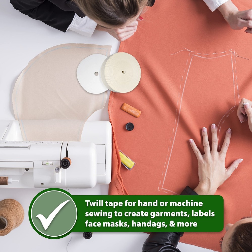 Colorfast Twill Cotton Tape & Cinta de Algodon: Compared to other sewing tapes, our soft cream twill ribbon is preshrunk, odorless, breathable, and machine washable & dryable, serving as heavy duty bias tape, rug binding tape, & seam tape for sewing. 1 1/2 In Cotton Twill Tape Ribbon or Sintas de Tela for Sewing, Hemming, Knitting, Quilting & Dressmaking: The cotton bias tape serves as great drawstrings for sweatpants, waistbands, necklines, hoodie strings, apron straps, & sewing bias tape. Cream Twill Tape Bias Binding Tape Fabric Ribbon: Perfect for ribbon trimming, strapping, & casing, the cotton twill tape 1 1/2 inches is great for creating duvet strings, towel hangers, tying curtains & cables, reinforcing buttonholes, & binding blankets. Herringbone Cotton Tape for DIY Crafting, Scrapbooking, Packaging, & Gift Wrapping: The cotton twill ribbon serves as great book binding ribbon, cotton binding tape for carpet, and woven ribbon for bag handle, banners, tags and labels, & home decor. Bulk 1 1/2 Inches Twill Tape Roll: This 50-yards natural twill tape roll features 1.5 inches wide twill tape. Great for making piping, seams, & finishing raw edge, the continuous natural bias tape is easy to sew and can be cut and trimmed without fraying.