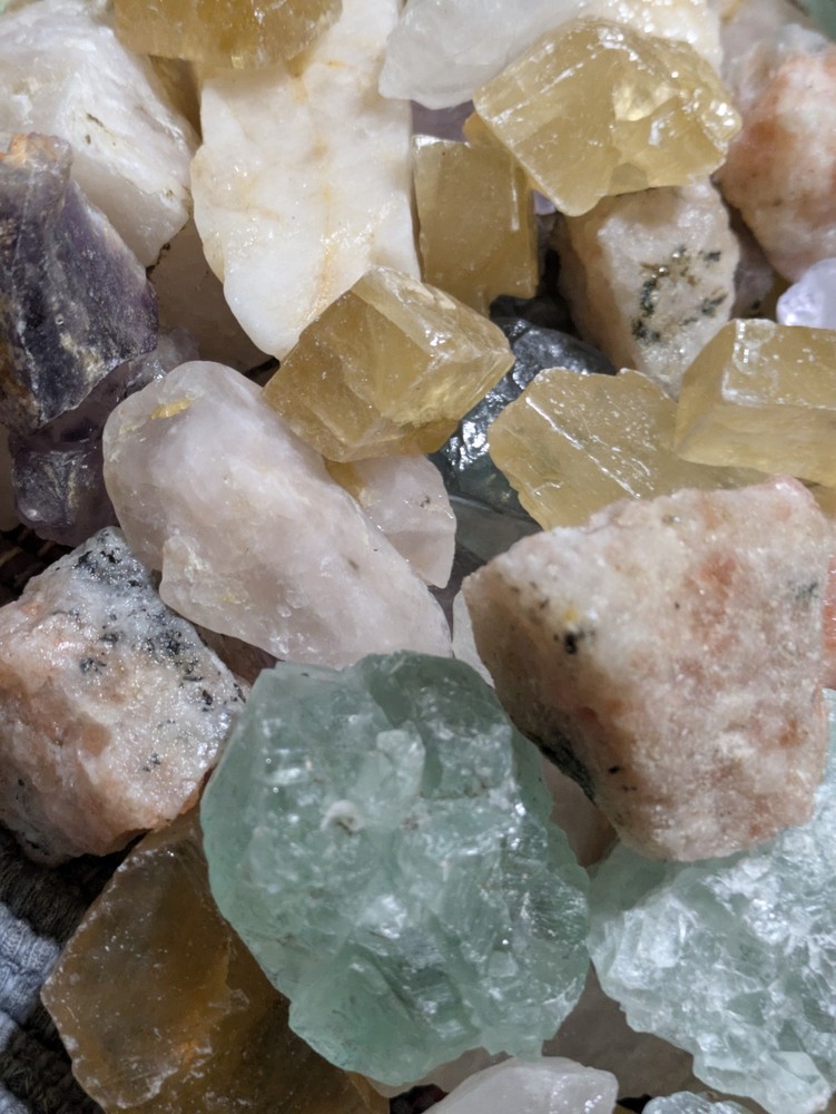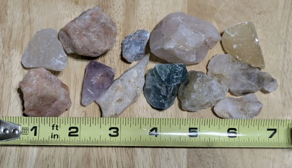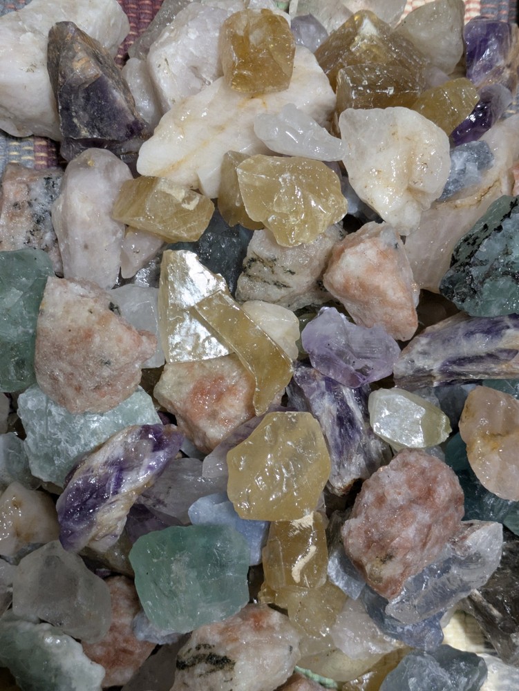 Each lot weighs over 8 ounces and contains about 10-12 crystals that are chosen at random. Each set comes with a nice red drawstring pouch. Types of crystals include Amethyst, Rose Quartz, Sunstone, Calcite, Fluorite, Clear Quartz and more! You are guaranteed to get at least one of each type of crystal. The more you order, the more you save! We offer combined shipping, and accept returns within 30 days of purchase. Please check out our other listings. Thanks for looking!