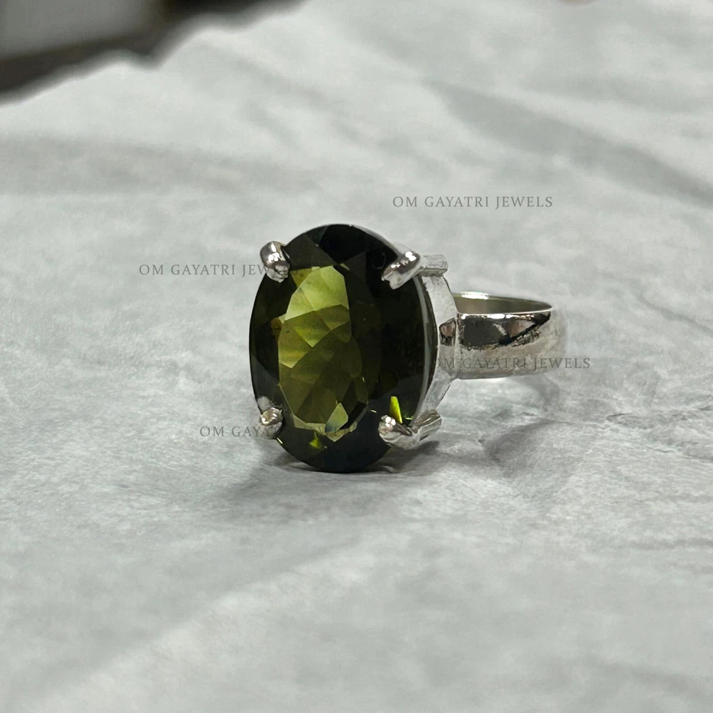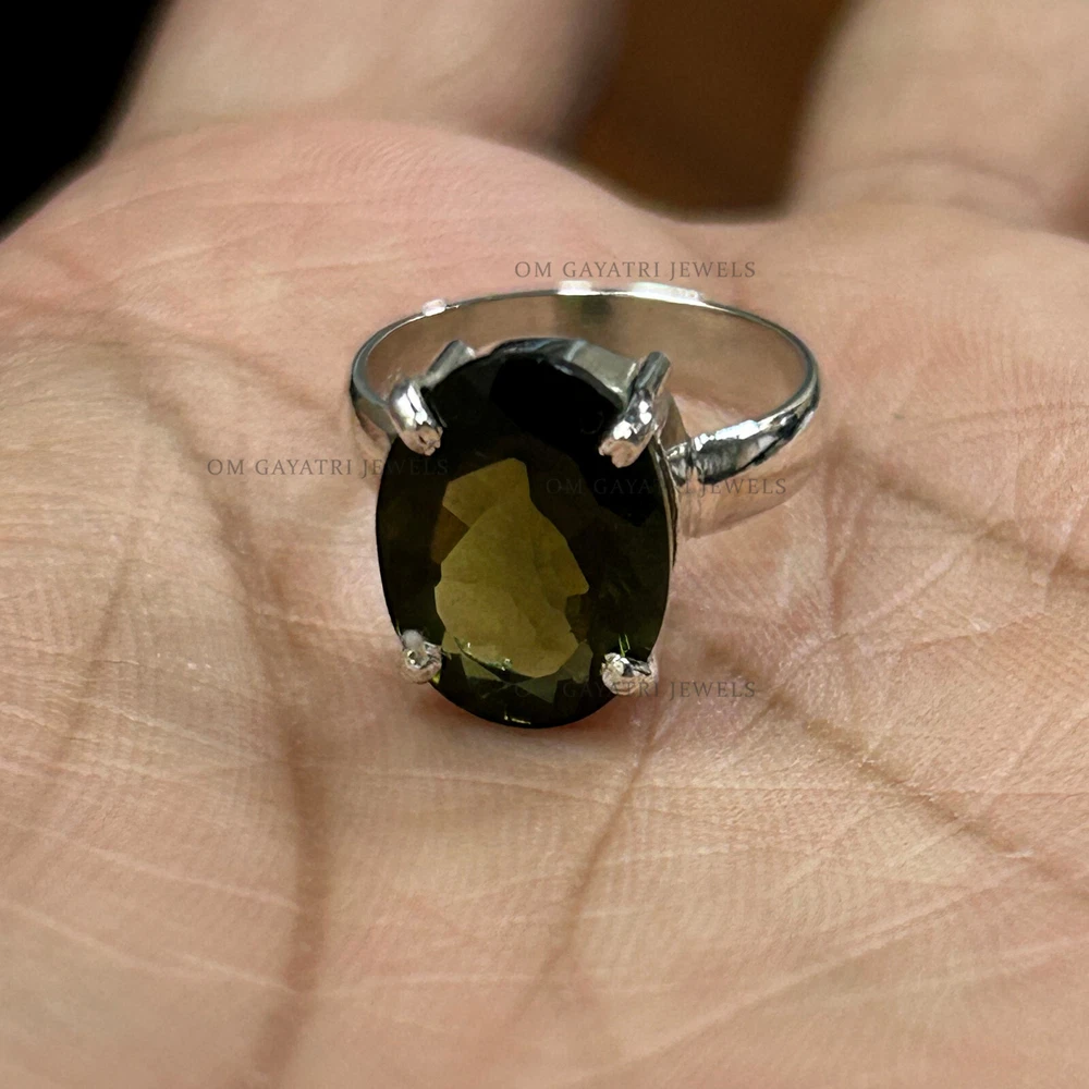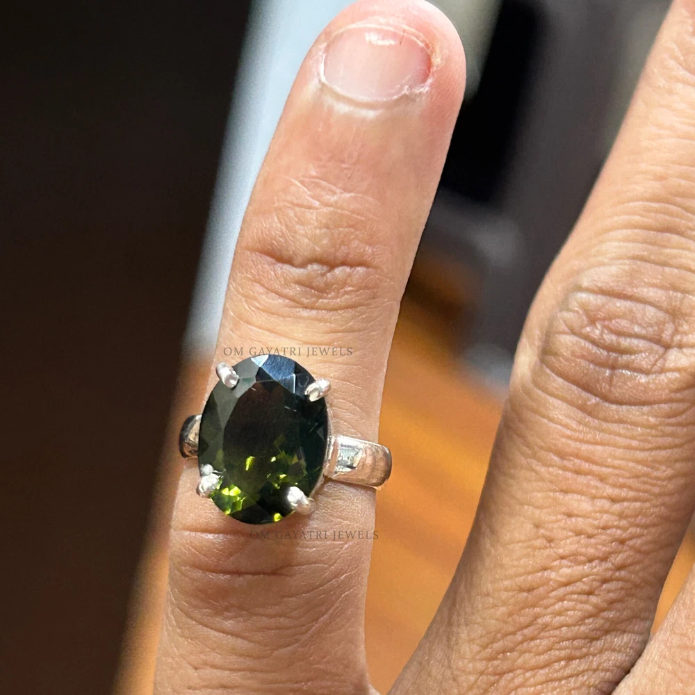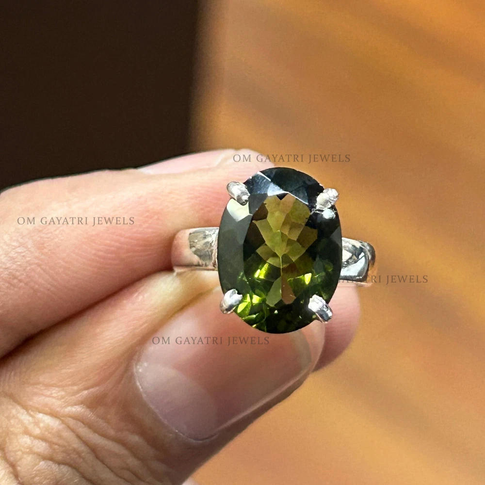 Add a touch of vintage charm to your collection with this beautiful handmade Moldavite ring. The oval-shaped gemstone is set in 925 sterling silver and features a stunning green color that will surely catch anyone's eye. The ring is customizable, making it perfect for engagements, weddings, anniversaries, birthdays, and even Christmas and Valentine's Day gifts. The ring has a bezel setting style and is stackable, making it a great addition to any jewelry collection. The gemstone is natural and has an excellent cut grade, with a clarity grade of eye clean. It has a band width of 2mm and a main stone length of 10mm, with a depth of 2.5mm. This ring is perfect for those who love nature and love themes. Natural Cut Moldavite Ring 925 Sterling Silver Oval Cut Handmade Ring - All Size Gemstone:- Moldavite Stone Size:- 8x10mm Stone Shape:- Oval Stone Category:- Faceted Metal:- 925 Sterling Silver