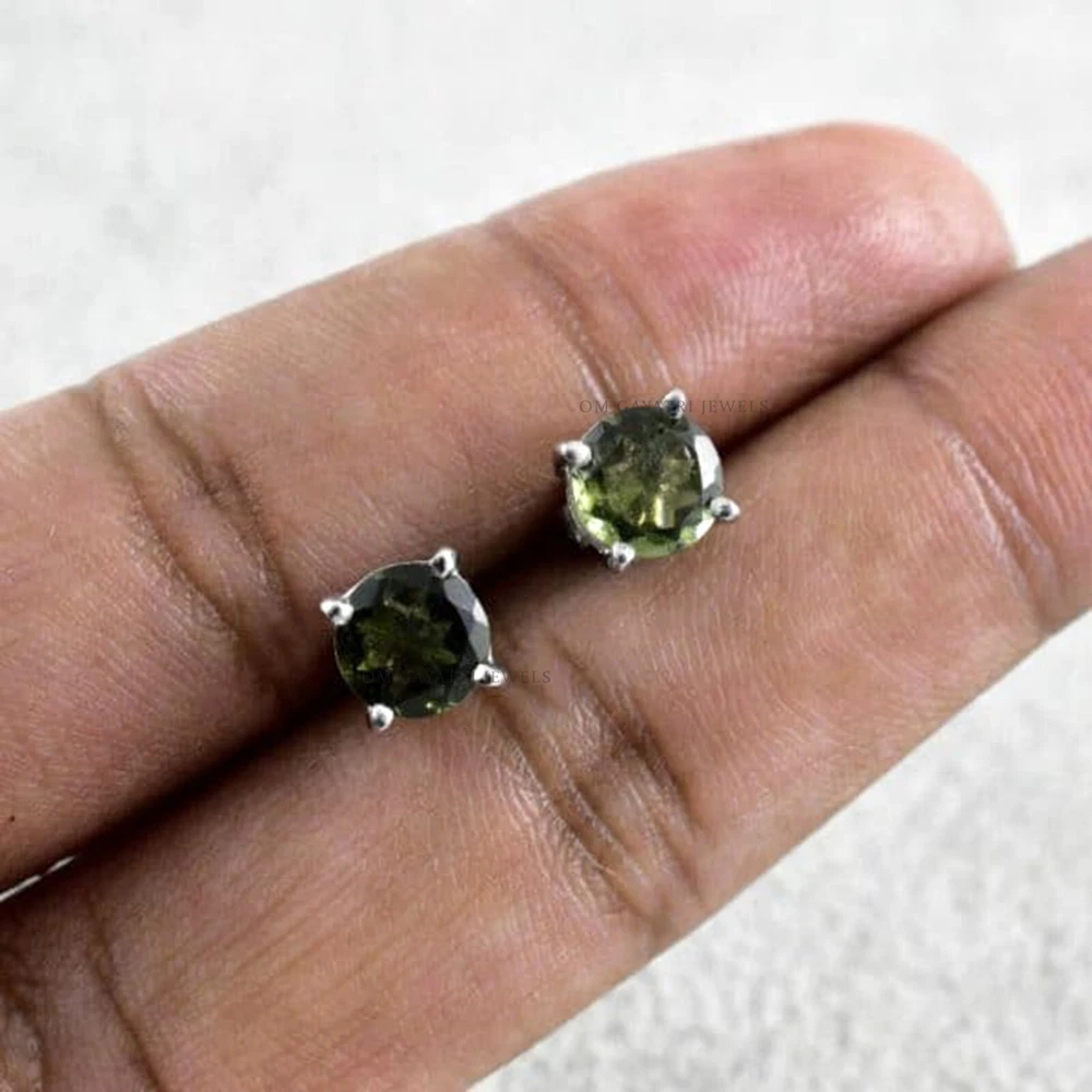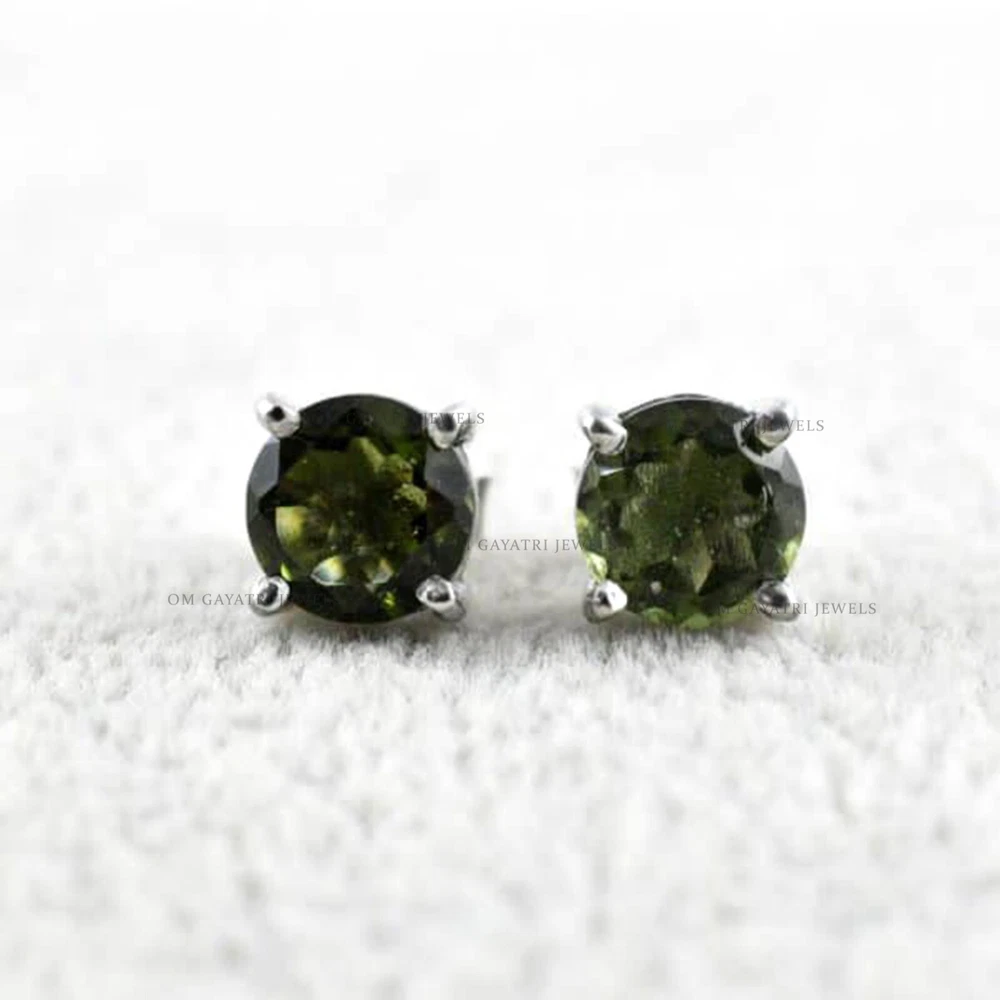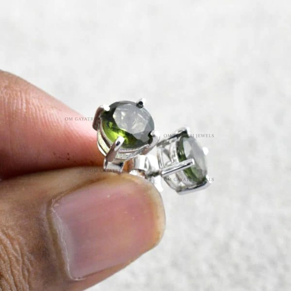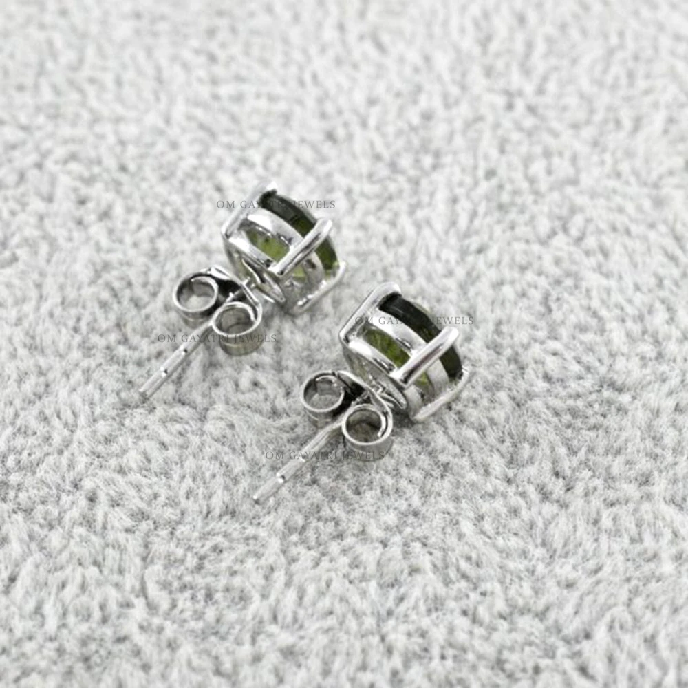 Natural Czech Moldavite Stud Earrings 925 Streling Silver Handmade Jewelry - 7MM