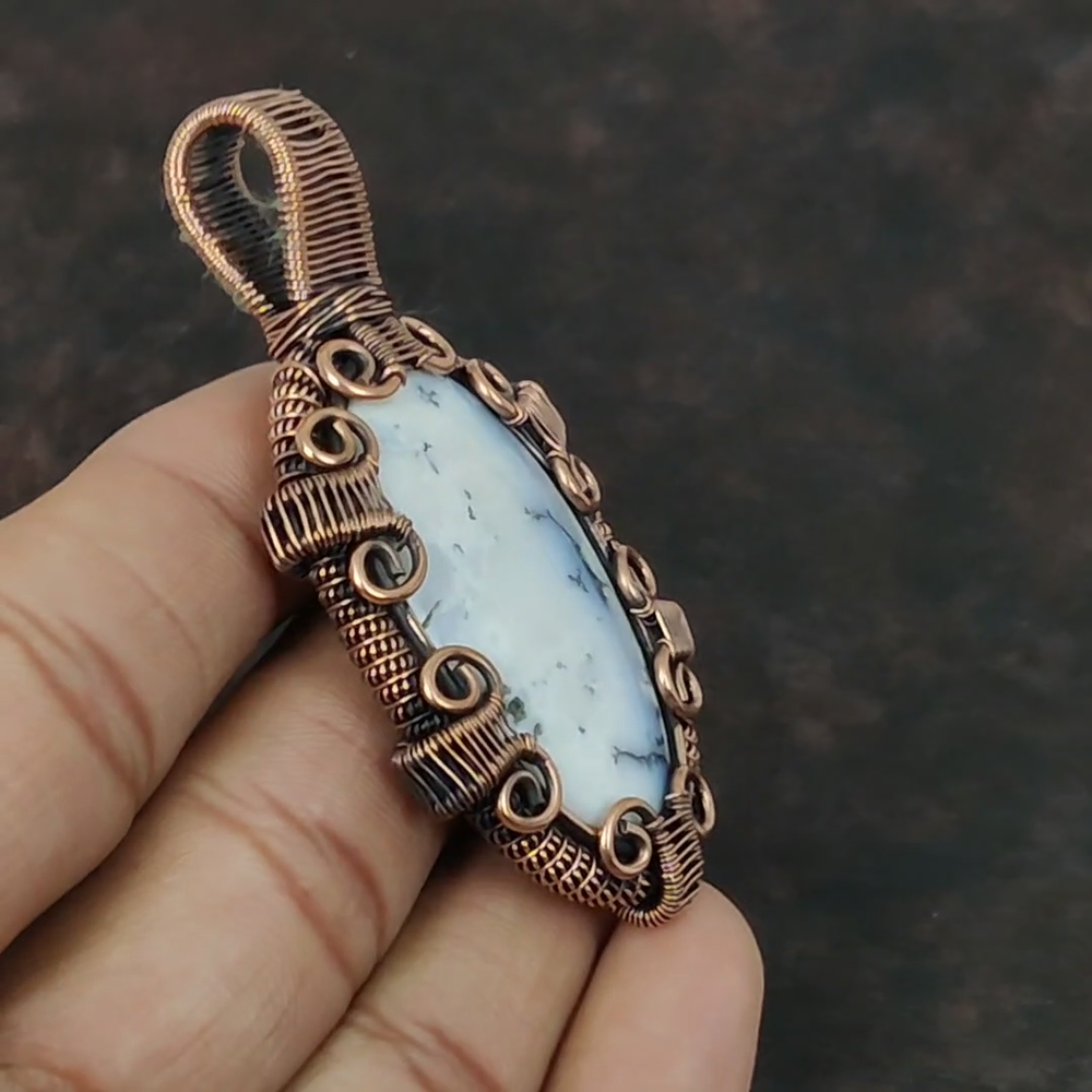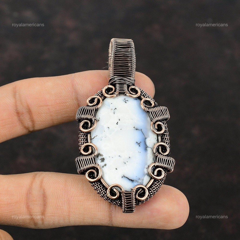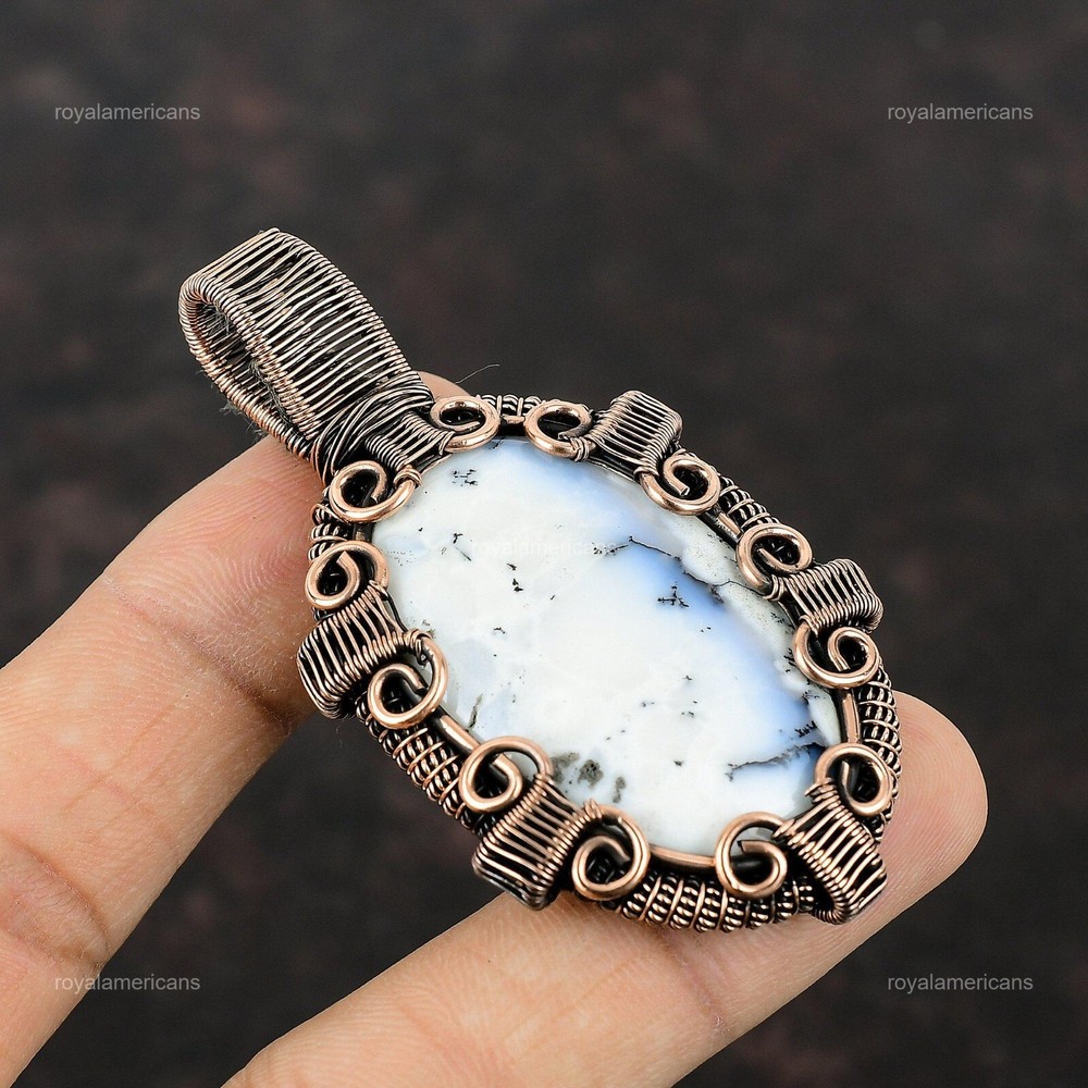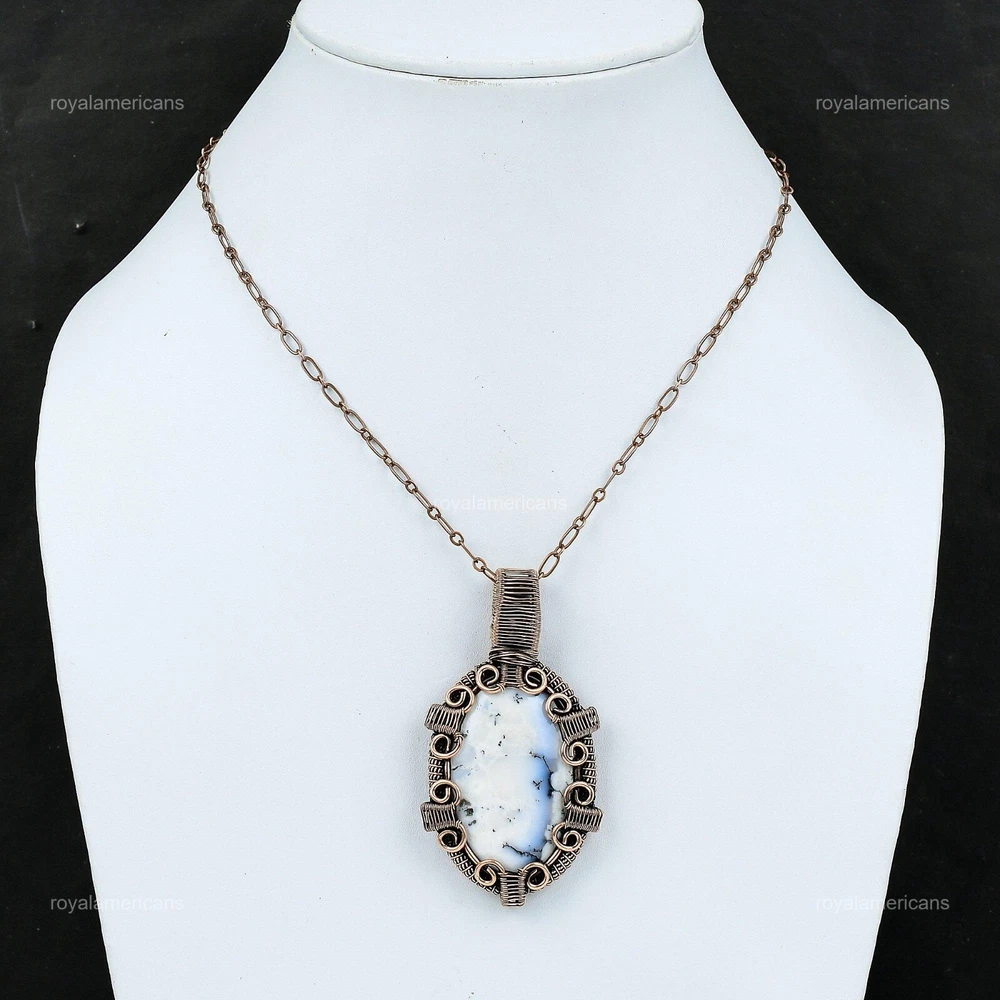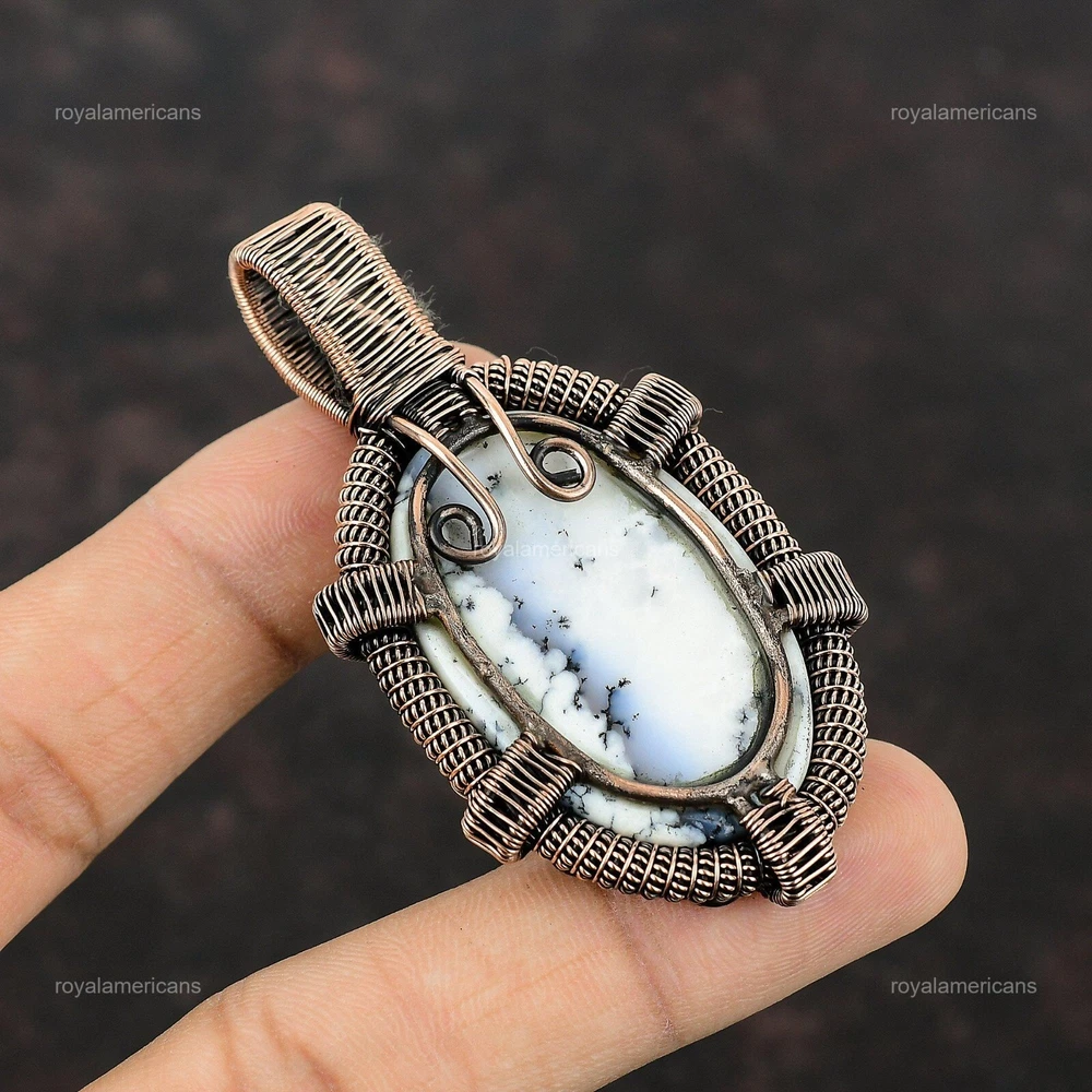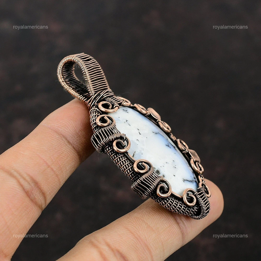 Note : Due to the natural formation of this gemstone. Slight variation in design and color are to be expected. Welcome to Royalamericans Mothers day Sale Natural Dendrite Opal Copper Christmas Daughter Wedding Pendant Handmade Pendant, Wire Wrapped Pendant, Wire Wrapped Jewelry, Copper Pendant, Copper Wire Pendant, Wrapped Jewelry, Wire Wrap Pendant, Wire Wrap Jewelry SKU : UFWP-1107 Gemstone : Dendrite Opal Stone Shape : Oval Metal Purity : Unknown Copper Length : 72 Millimeters Width : 39 Millimeters Copper has been used for jewelry making for thousands of years, dating back to ancient civilizations such as the Egyptians, Romans, and Aztecs. Copper was valued for its beauty, versatility, and durability, and was often used to make everything from jewelry and coins to cookware and tools. In addition to its historical significance, copper jewelry also offers several benefits. Copper is a natural conductor of heat and electricity, which makes it ideal for energy healing and therapeutic purposes. Wearing copper jewelry is believed to have various health benefits, such as improving circulation, reducing inflammation, and boosting the immune system. Some people also believe that copper jewelry has the ability to balance energy and improve mood. For Mother's Day Gift For Father's Day Gift For Promise For Valentine's Day For Halloween Party For Christmas Day Gift For New Year Party For Mom For Her If you can't find the information you need or need some advice for your design? Feel free to contact us. We are fast to reply :) All our work is made by hand with Love and Care in our workshop Thank you so much for visiting and hope you enjoy shopping with us Royalamericans is committed to delivering the best quality sterling silver jewelry to customers. As a handmade jewelry manufacturer, we offer an extensive selection of copper gemstone jewelry that showcases the brilliance of our craftsmanship. We are an experienced handmade jewelry supplier with expertise in embellishing gemstones to suit every style. We offer you the liberty to create your jewelry ensemble with sparkling, earthy, and pure gemstones. Our Talented artisans masterfully handcraft each piece of jewelry you see here. Our pieces are made with genuine gemstones.