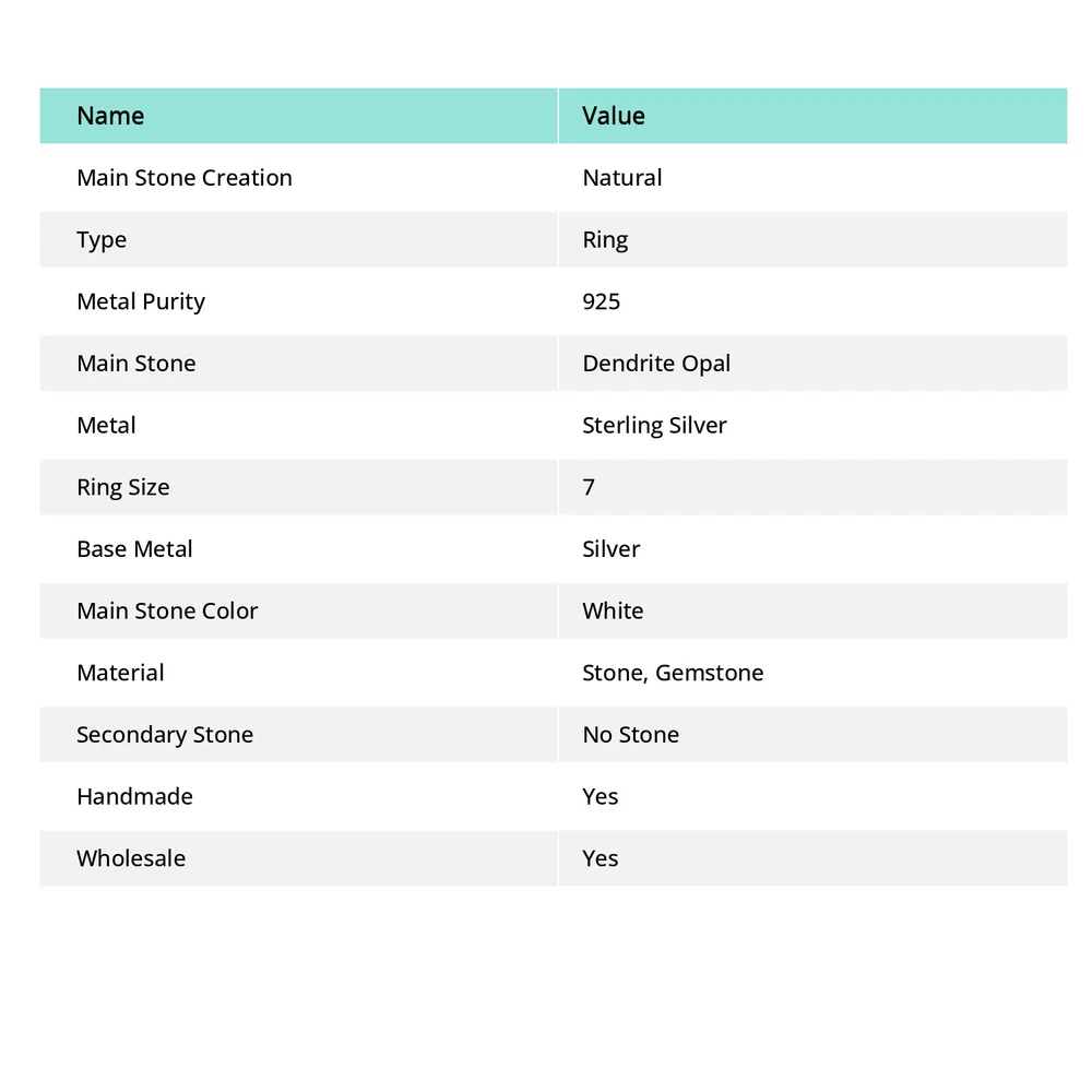 Main Stone Color: White Main Stone Treatment: Not Enhanced Number of Diamonds: 0 Era: Undated Certification: Yes Handmade: Yes Main Stone Shape: Same As Picture Style: Band, Charm Colored Diamond Intensity: Not Applicable Metal Purity: 925 gtin13: does not apply Cut Grade: Fair Material: Stone, Gemstone Country/Region of Manufacture: India Color: White Type: Ring Gemstone Clarity Grade: Eye Clean Customized: No Occasion: Anniversary, Birthday, Christmas, Engagement, Valentine's Day, Wedding, Mother's Day Band Width: 2 mm Weight: 3.3 gm Diamond Color Grade: Not Applicable Sizable: No Stone-Size: 9X15mm Setting Style: Channel-Set Shape: Same As Picture Metal: Sterling Silver Ring Size: 7 Total Carat Weight: 50 Carat Above UPC: does not apply Collection: Brand New Theme: Beauty, Beach, Family & Friends, Love Base Metal: Silver Country of Origin: India Main Stone: Dendrite Opal Signed: Yes Diamond Clarity Grade: Not Applicable Brand: Unbranded ProductName: Ring Wholesale: Yes Main Stone Size: 9X15mm Features: Adjustable, Engraved, Stackable Secondary Stone: No Stone Main Stone Creation: Natural Number of Gemstones: 1