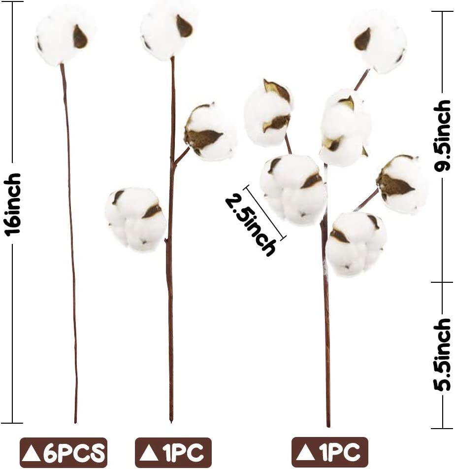 PACKAGE INCLUDED -8 Packs Natural Cotton Stems SIZE - Our dried cotton stem measures 15 inches tall on average. The diameter of every cotton boll is about 1.5 - 2.5 inches and contains 4-5 cotton balls. PREMIUM QUALITY - Our cotton balls are all picked from cotton farm and dried for a long-time preservation. Soft, yet hard to lose shape. No shedding problem or allergy issues. Durable and long-lasting. BENDABLE BRANCHES - Our cotton branch has a wired stem, can adjust the direction and make it what you like. Can perfectly fit in a garland or wreath. WIDE APPLICATIONS - Our cotton bouquet is perfect for Halloween or Thanksgiving decoration, centerpiece arrangement, farmhouse table decoration, cotton wedding centerpiece, floral arrangement, vase filling, wedding decor, etc. Ideal DIY crafts supplies. Product Description The video showcases the product in use. The video guides you through product setup. The video compares multiple products. The video shows the product being unpacked.