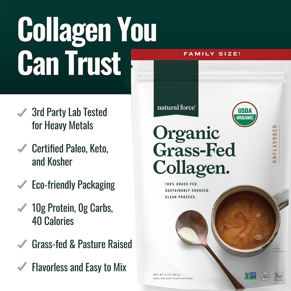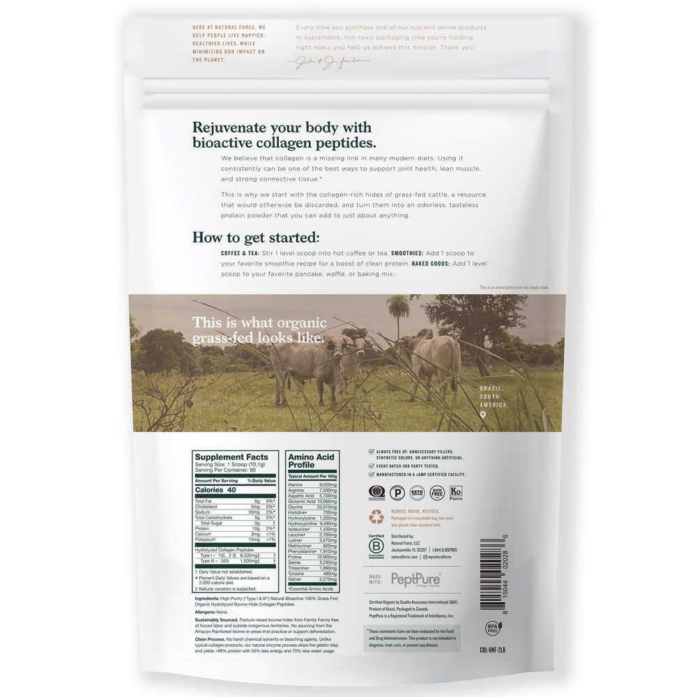 Collagen Peptides grass fed collagen protein is the highest quality hydrolyzed collagen protein on the market. It is a Collagen Type I responsibly sourced from South America. Our Collagen Hydrolysate contains key amino acids with high bioavailability and absorption. This paleo protein is an optimal choice for rebuilding and strengthening your muscles, joints, ligaments, tendons and bones. Not just that – it's also great for your skin and has tremendous anti-aging properties. Odorless and unflavored! Use in any beverage, hot or cold! Put a spoonful in shakes, add to your coffee, or use in cooking without affecting the taste or texture of the recipe. Benefits to Hydrolyzed Collagen Peptides: May increase athletic performance and maintain a lean body. Has been shown to reduce recovery time from physical activity and reduce risk of injuries. Can make you feel full to lose or maintain weight May promote youthful skin and improve skin moisture level. May prevent the formation of deep wrinkles. Could accelerate the growth of hair, skin, and nails as well as improve their structure. May improve joint comfort and flexibility. - Performance Fueled by Nature. USDA Certified Organic - Collagen Peptides are sustainably sourced exclusively from 100% grass-fed, pasture-raised cattle raised on Family Farms free of forced labor and located outside indigenous territories. They are never given antibiotics, hormones, or GMOs Only 1 Ingredient - High-Purity Type I and III Natural Bioactive 100% Grass-Fed Organic Hydrolyzed Bovine Hide Collagen Peptides. Each scoop of our pure Collagen Peptides provides 10g of clean protein, 18 Amino Acids (8 Essential), and has only 40 calories and 0g of fat and carbs. These organic peptides are less refined than conventional collagen and may have a more natural taste and consistency Clean Process - Our Collagen is certified Keto, Paleo, Kosher and always free of unnecessary fillers, harsh chemical solvents, synthetic colors, and anything artificial. Our natural enzyme process yields >99% protein with 50% less energy and 70% less water usage. We do not source from the Amazon Rainforest biome or areas that practice or support deforestation Daily Boost of Collagen Made Easy - Collagen Powder is hydrolyzed to make it easy to mix into coffees, teas, smoothies, baked goods, and more. Add one scoop a day to your favorite drink or recipe for a boost of collagen with plenty of long-term benefits including joint, hair, skin, and nail health Nutrition You Can Trust - Every batch of Collagen Peptides is 3rd party lab tested and independently analyzed for the presence of gluten, heavy metals, and other contaminated substances. And our packaging is always Eco-friendly!