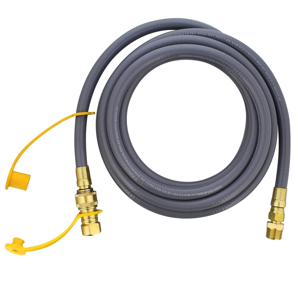Use the BISupply Grill Natural Gas Converter Propane Quick Connect Hose 12ft Hose for fueling machinery, vehicles, and more for your warehouse and jobsite. Natural gas quick release hose allows you to convert natural gas into propane. Fittings for your gas quick connect hose are constructed of brass to withstand repeated, extended use, and the hose is 12 feet long and made of rubber and plastic. Grill natural gas line has a flow rate of 50000 BTU/hr and a maximum pressure capacity of 1/2 PSIG. Natural gas grill hose quick connect hose features 3/8in quick disconnect plug, 5/8in-18 UNF connection, 3/8in female flare to 3/8in male flare brass adapter. Attach hose to large volume low pressure tanks. This is not designed for air pressure. Coupling required for conversion, not included. Warning: This product can expose you to chemicals which is [are] known to the State of California to cause cancer and birth defects or other reproductive harm. [Secure Your Propane Connection]: Use the BISupply Gas Line Quick Connect Gas Hose 12-Foot Hose for fueling machinery, vehicles, and more; Depend on this natural gas conversion kit for converting natural gas to propane; Coupling required for conversion, not included [Built to Last]: No need to worry about this natural gas quick connect hose and parts cracking under the pressure; Fittings for your gas quick connect hose are constructed of brass to withstand repeated, extended use; Hose is 12 feet long (3m) and made of rubber and plastic [Convert the Flow]: Grill natural gas line has a flow rate of 50000 BTU/hr and a maximum pressure capacity of 1/2 PSIG; With an inner diameter of 3/8-inch (1cm), this natural gas to propane quick connection hose is made for larger tanks and applications; Use for low pressure gas tanks [Connect the Correct Specs]: Natural gas grill hose quick connect hose features 3/8in (1cm) quick disconnect plug, 5/8in (1.5cm) 18 UNF connection, 3/8in (1cm) female flare to 3/8in (1cm) male flare brass adapter; Includes dust cap and plug for each fitting [For Your Warehouse Needs]: Use this natural gas flexible hose for your warehouse machinery and vehicles; Fuel up your forklifts, vans, trucks, heaters, and other applications by converting natural gas into propane; Not designed for air pressure