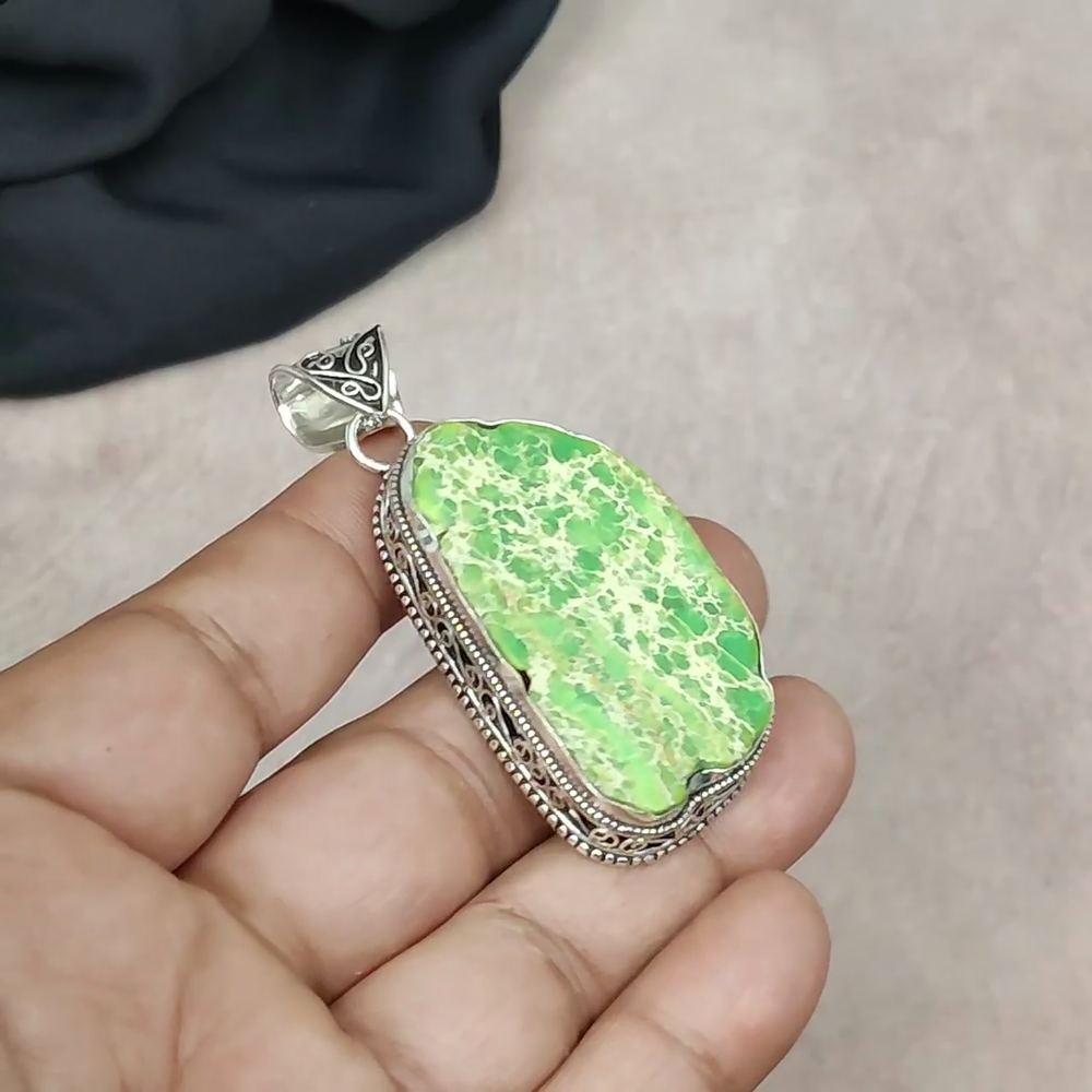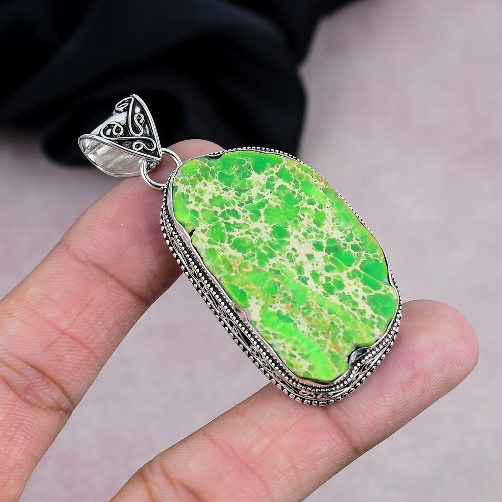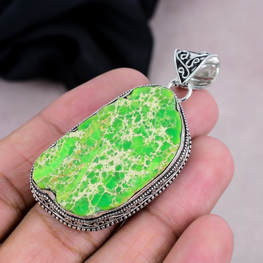 Main Stone Treatment:Not EnhancedMain Stone:Green Sea SedimentCountry/Region of Manufacture:IndiaPendant Shape:Same As PictureCountry of Origin:IndiaCertification:N/ACut Grade:N/ATheme:Beauty, Bohemian, Ethnic, Halloween, Love, NatureClosure:Same As PictureNumber of Diamonds:N/AType:PendantFeatures:HandmadeTotal Carat Weight:10 carat and aboveOccasion:Anniversary, Birthday, Christening, Christmas, Engagement, Father's Day, Graduation, Mother's Day, Valentine's Day, WeddingSecondary Stone:N/AMain Stone Creation:NaturalColored Diamond Intensity:N/AMaterial:GemstoneDiamond Color Grade:N/AMetal:Sterling SilverMain Stone Shape:Same As PictureMain Stone Color:GreenCollection:HandmadeSetting Style:BezelNecklace Length:N/ABase Metal:Sterling SilverPendant/Locket Type:Same As PictureChain Type:N/ANumber of Gemstones:1Color:SilverMetal Purity:925Brand:HandmadeDiamond Clarity Grade:N/AStyle:Pendant