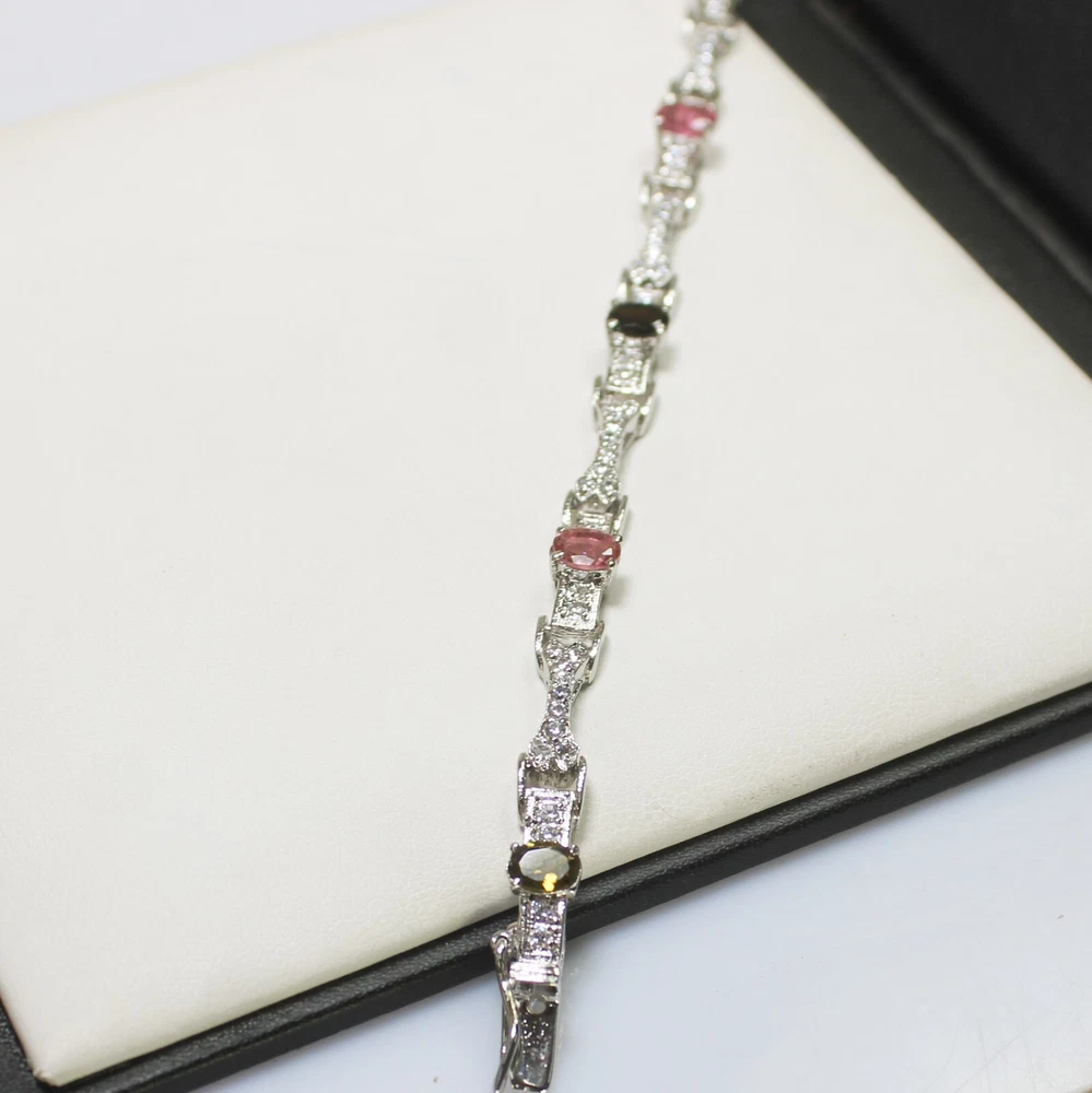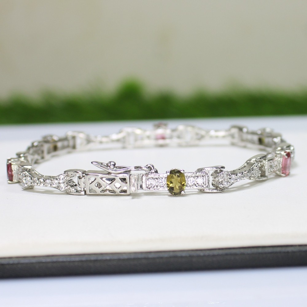 ARBIYA GEMS JEWELRY TYPE: SILVER BRACELET STONE: NATURAL MULTI TOURMALINE SIDE STONES: CUBIC ZIRCONIA BRACELET SIZE: 7.5 INCHES BRACELET WEIGHT: 11.20 GRAMS BRACELET METAL: STERLING SILVER METAL PURITY: 925 TREATMENT: NATURAL COUNTRY OF ORIGIN: INDIA HANDLING TIME: 1-2 DAYS DELIVERY TIME: WE USUALLY TAKES 15-25 DAYS BUT MOSTLY IT DELIVERS TO CUSTOMERS WITHIN 15 DAYS RETURN POLICY: RETURN ACCEPTED ON MANUFACTURING DEFECT WITHIN 30 DAYS. RETURN GIVEN AS MONEY BACK OR REPLACMENT FEEDBACK POLICY: PLEASE LEAVE US A POSITIVE FEEDBACK IF YOUR ITEMS DELIEVERED IN GOOD CONDITION