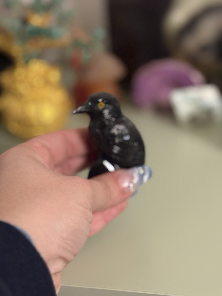 Natural Obsidian Quartz Crystal Carved Crow with Polished Yellow Eyes and Large Beak